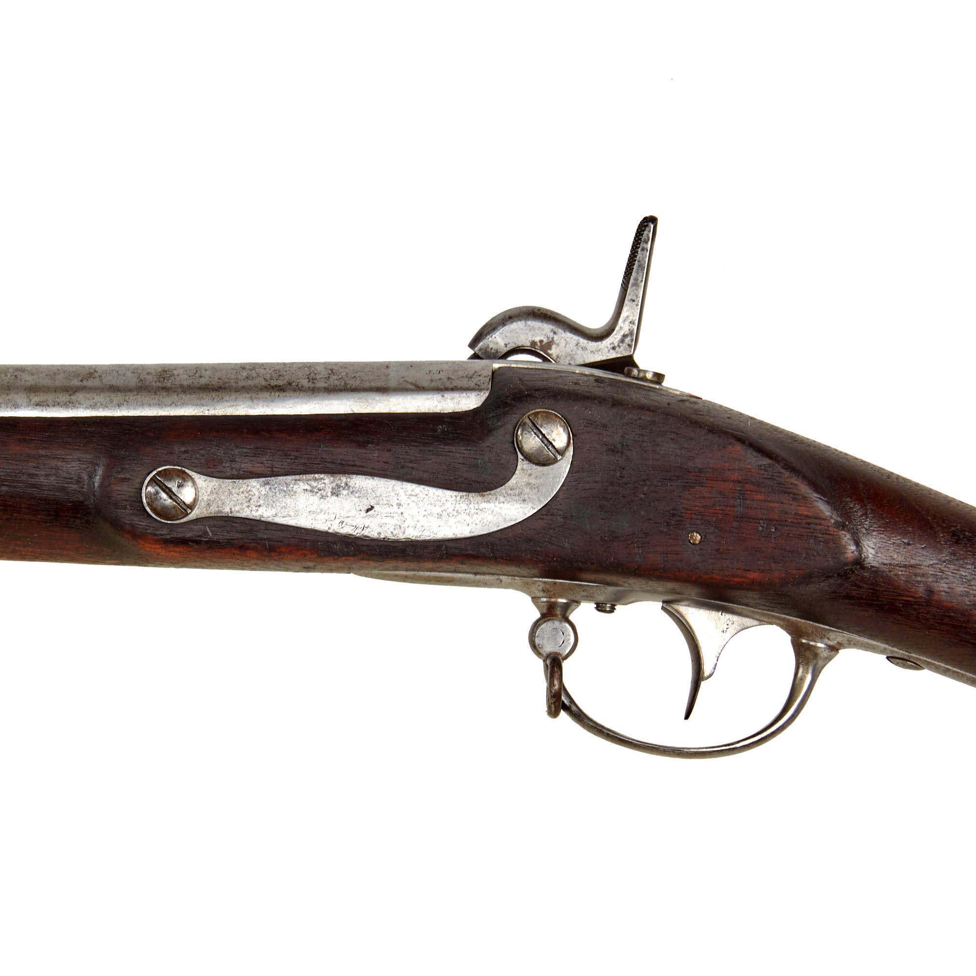 The barrel tang is also dated 1858, and there is a V /12 inspection mark to the right of that. The left side of the breech is marked J.T. for inspector John Taylor, a Springfield Armory foreman who had supervised the manufacture of 6 pattern muskets for the alteration process. He was reassigned from inspection duties at Colt to the Remington factory to oversee and inspect the parts being made there. There are also some inspection marks stamped into some components, and the iron butt plate is stamped U.S.. The barrel is fitted with the standard ramp of the model 1855 sight, which is a bit worn but still fully functional. The lock functions correctly, holding at half cock and firing at full, and the tape primer system still looks functional, with the feed pawl advancing with the lock. We unfortunately have no way to test it to see if it actually can still feed the metal primer tape.