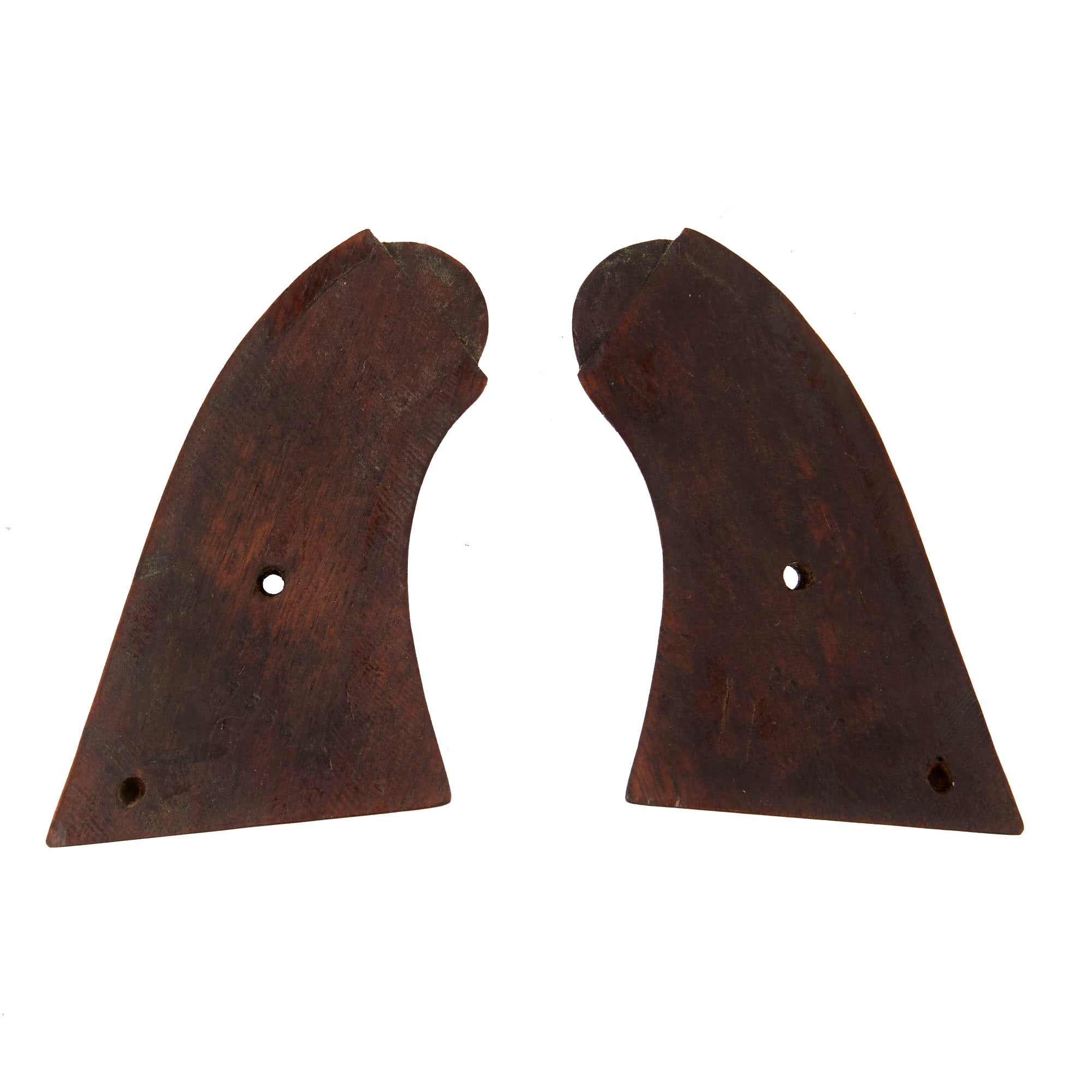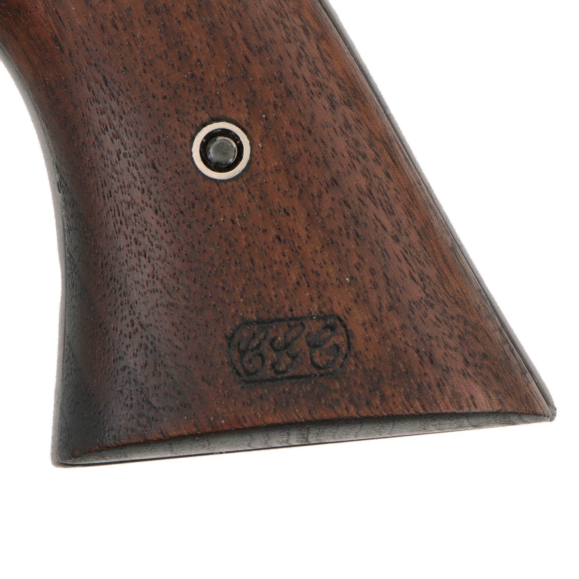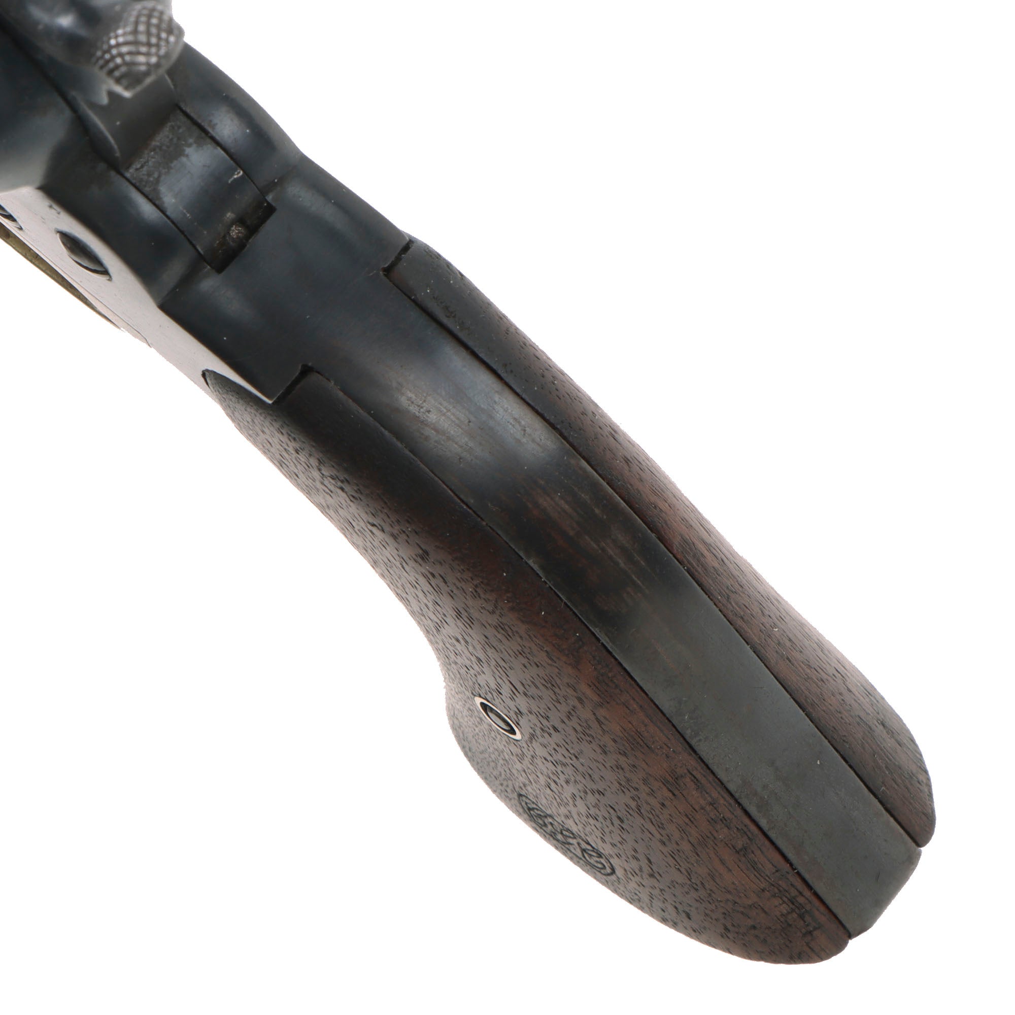 Overall condition is excellent, with the fully restored finish still very well retained, now fading towards plum in some areas due to wear. We do not see any evidence that the revolver was aggressively cleaned prior to restoration, so this was definitely done professionally. The walnut grips look fantastic, and match the revolver perfectly. The screw fittings are however smaller than they should be, and the securing screw is attached from the right side, which was definitely the first clue that they were expertly crafted replicas.