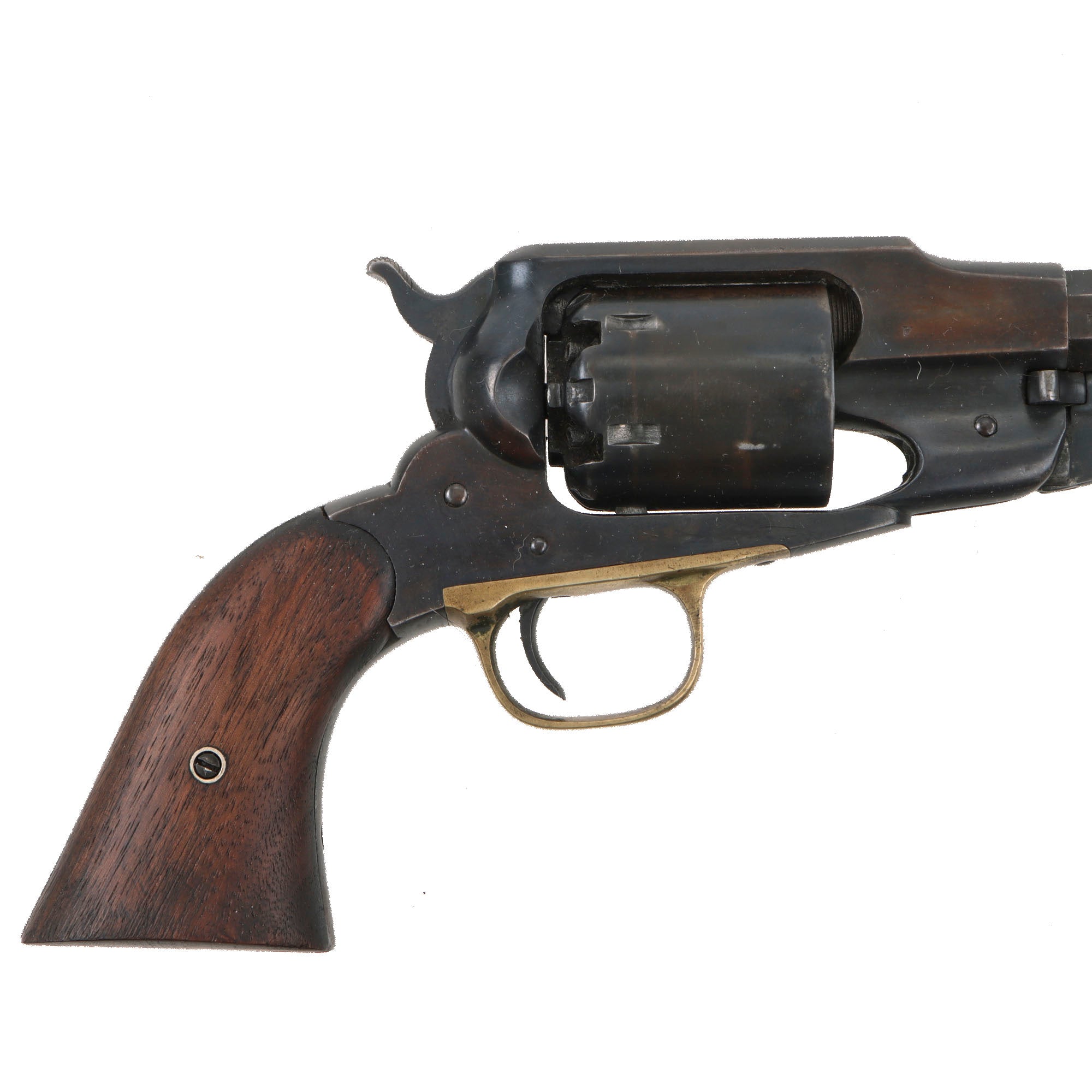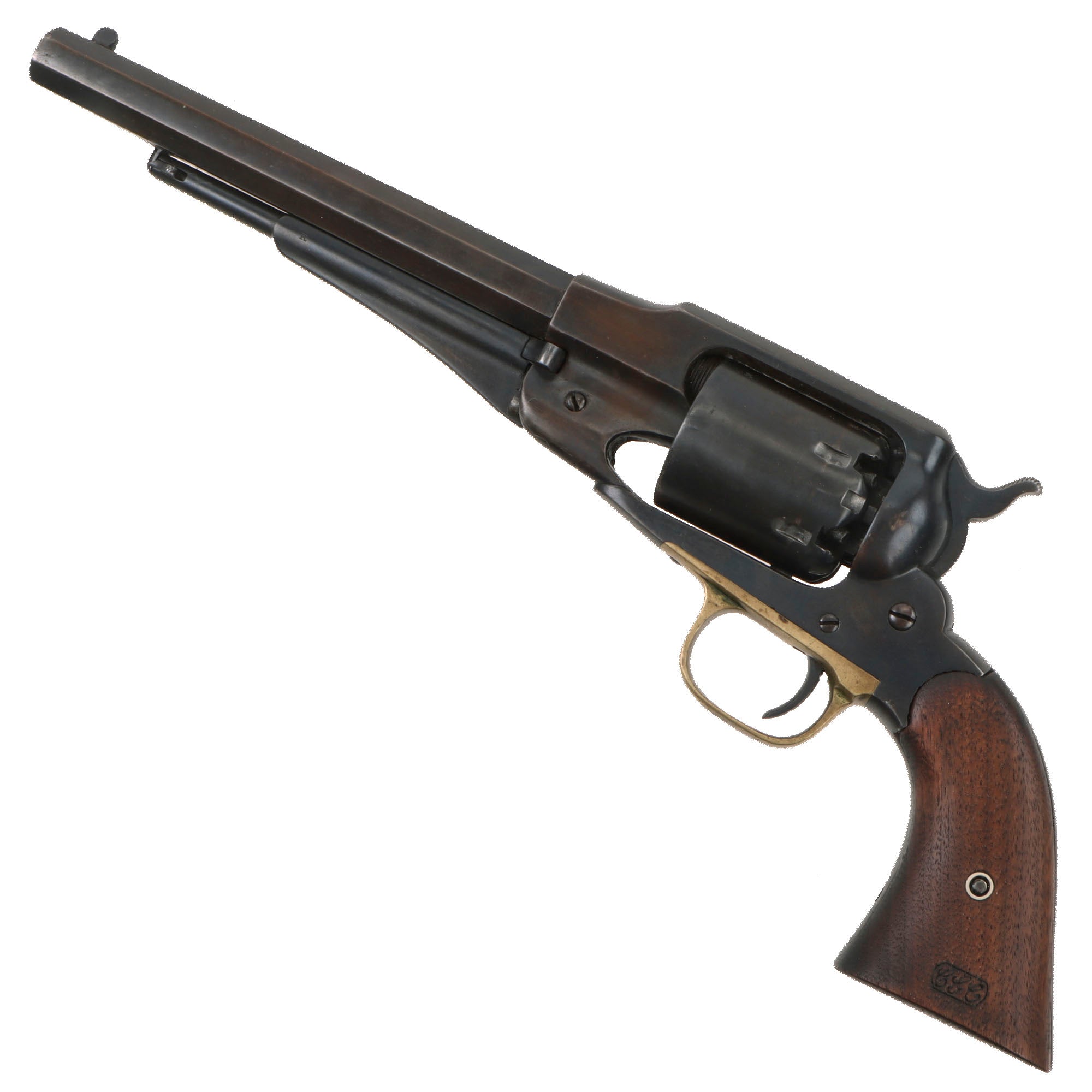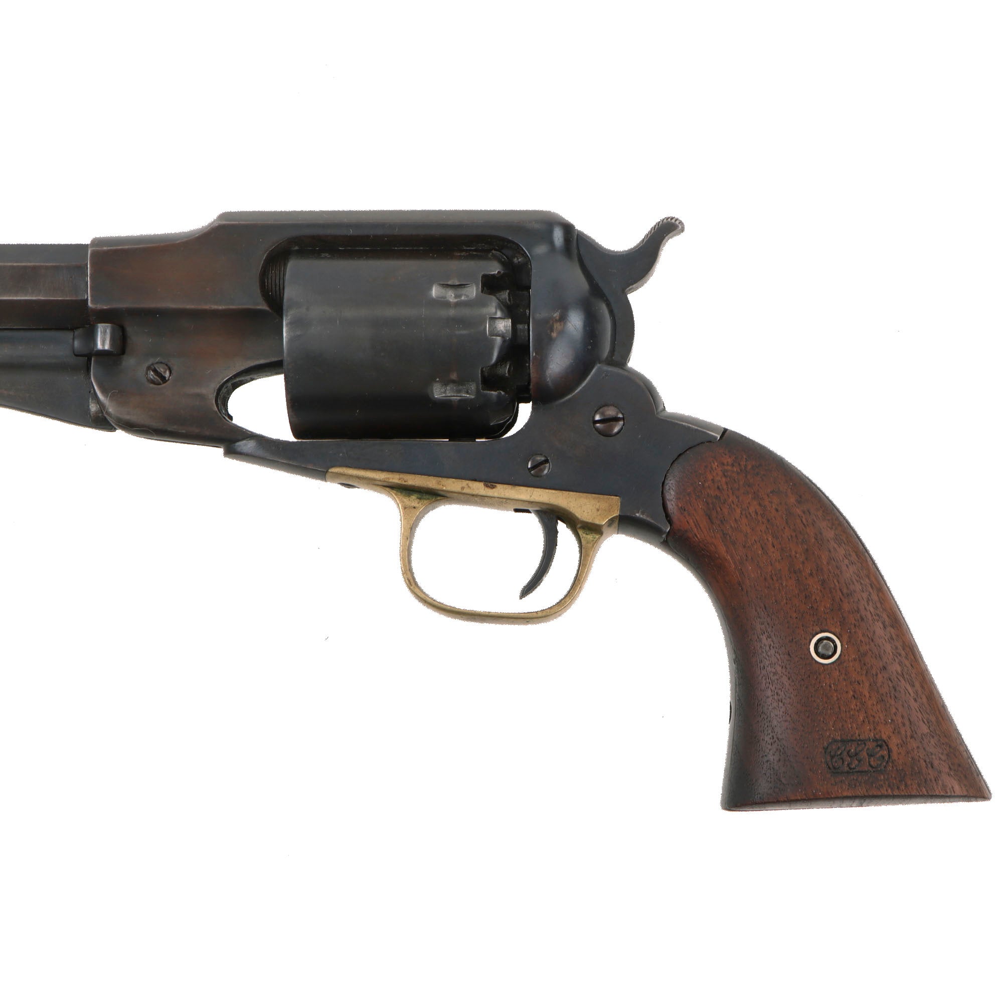 Original Item: Only One Available. This is a lovely example of a Remington New Model Army Percussion Revolver, which looks to have been fully restored during the mid 20th century, with the steel and iron components completely refinished with a great blued finish, which is still very well retained overall. It was done very tastefully, so it is still profusely marked, and really looks the business. The grip scales were replaced with custom made replicas, which even have a great replica CGC Cartouche, for Craig G. Curtis, a known inspector of Remington Revolvers.