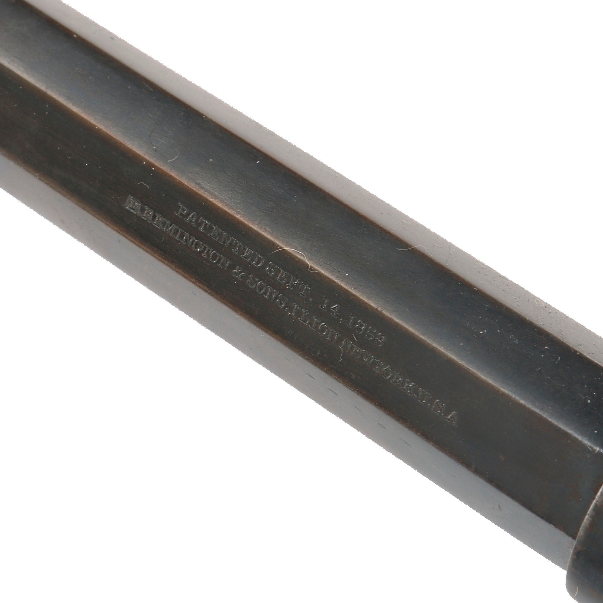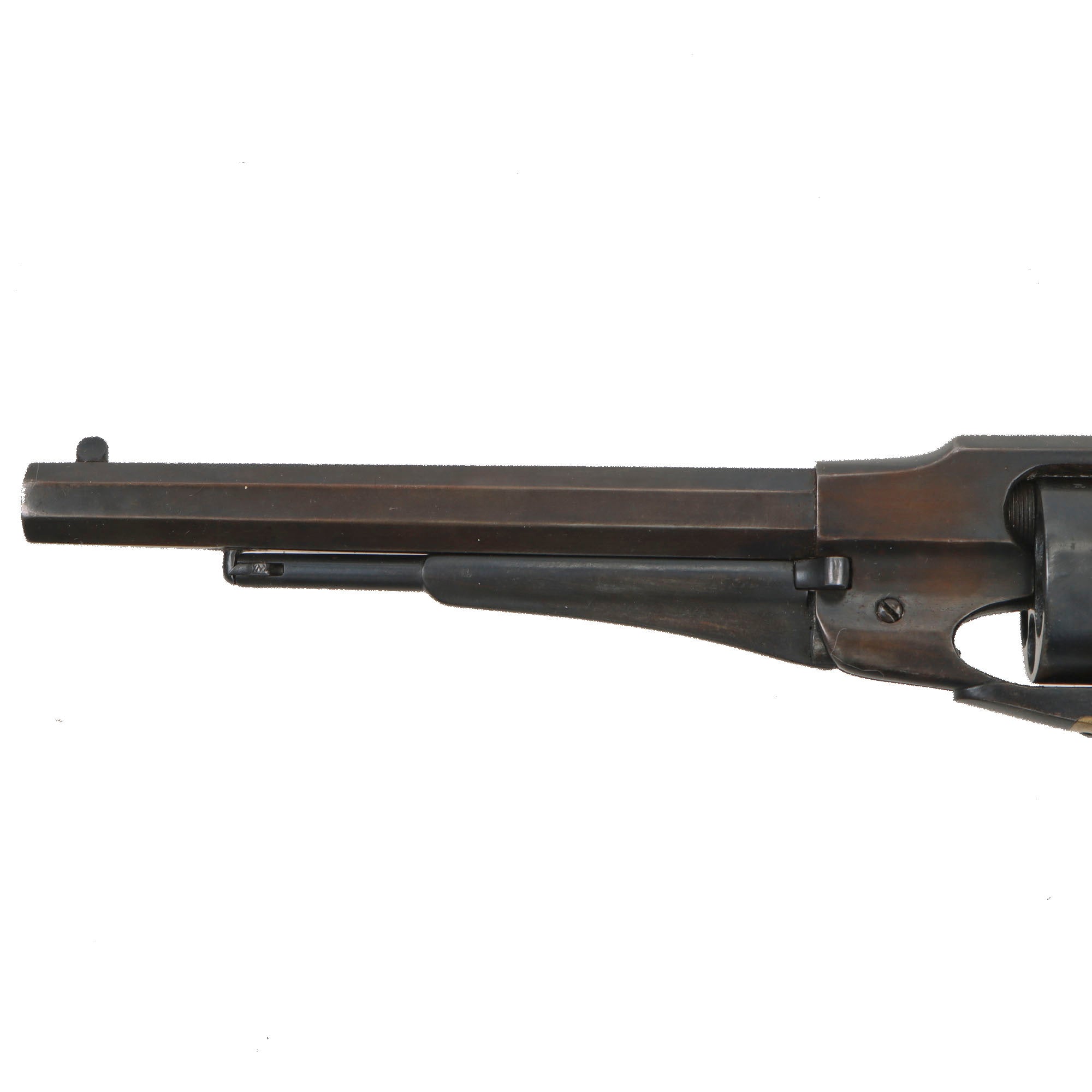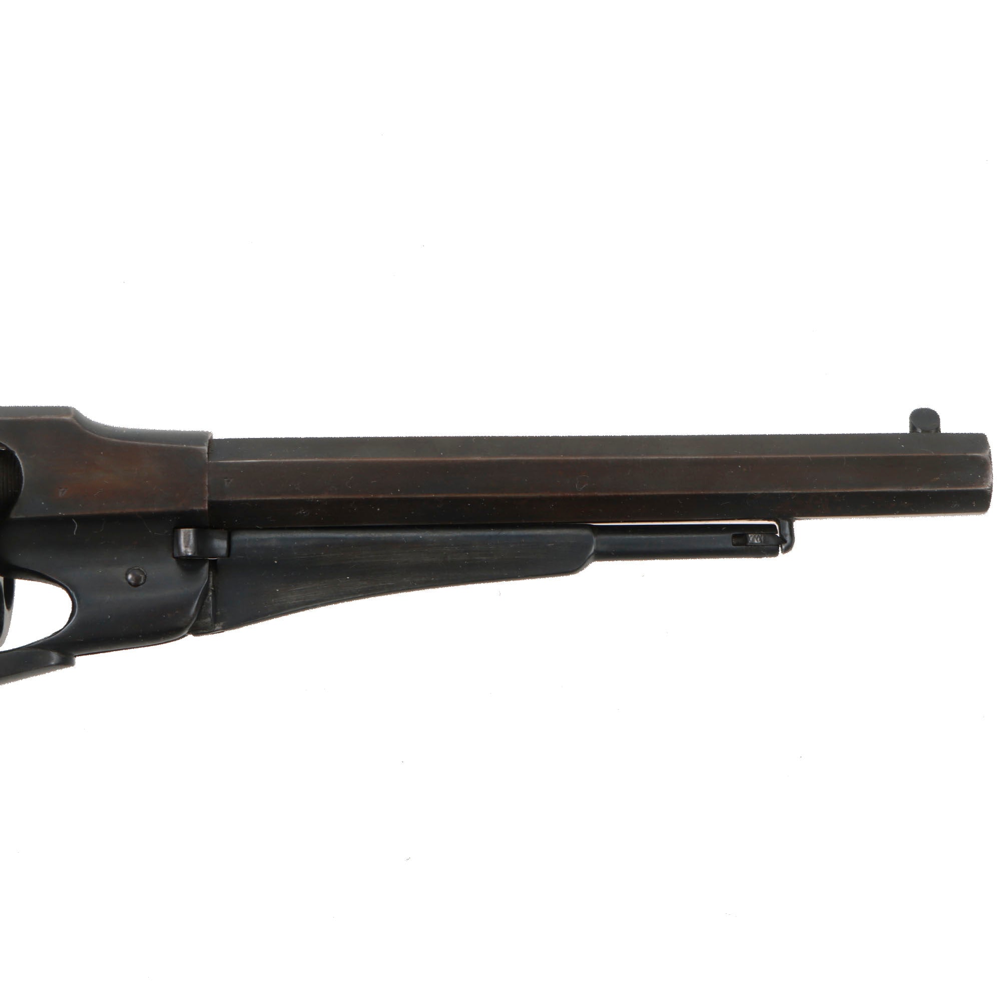 Like all New Models, it is a .44 caliber percussion, 6 shot single action revolver, with an 8-inch octagon barrel. These were often called the Model 1858 due to the patent dates, but production of this revision started in 1863, and the "New Model Army" is the correct designation from Remington. The top of the octagonal barrel still shows the original markings, though as with most we see the last line was VERY lightly stamped, as it is a separate die from the rest:-