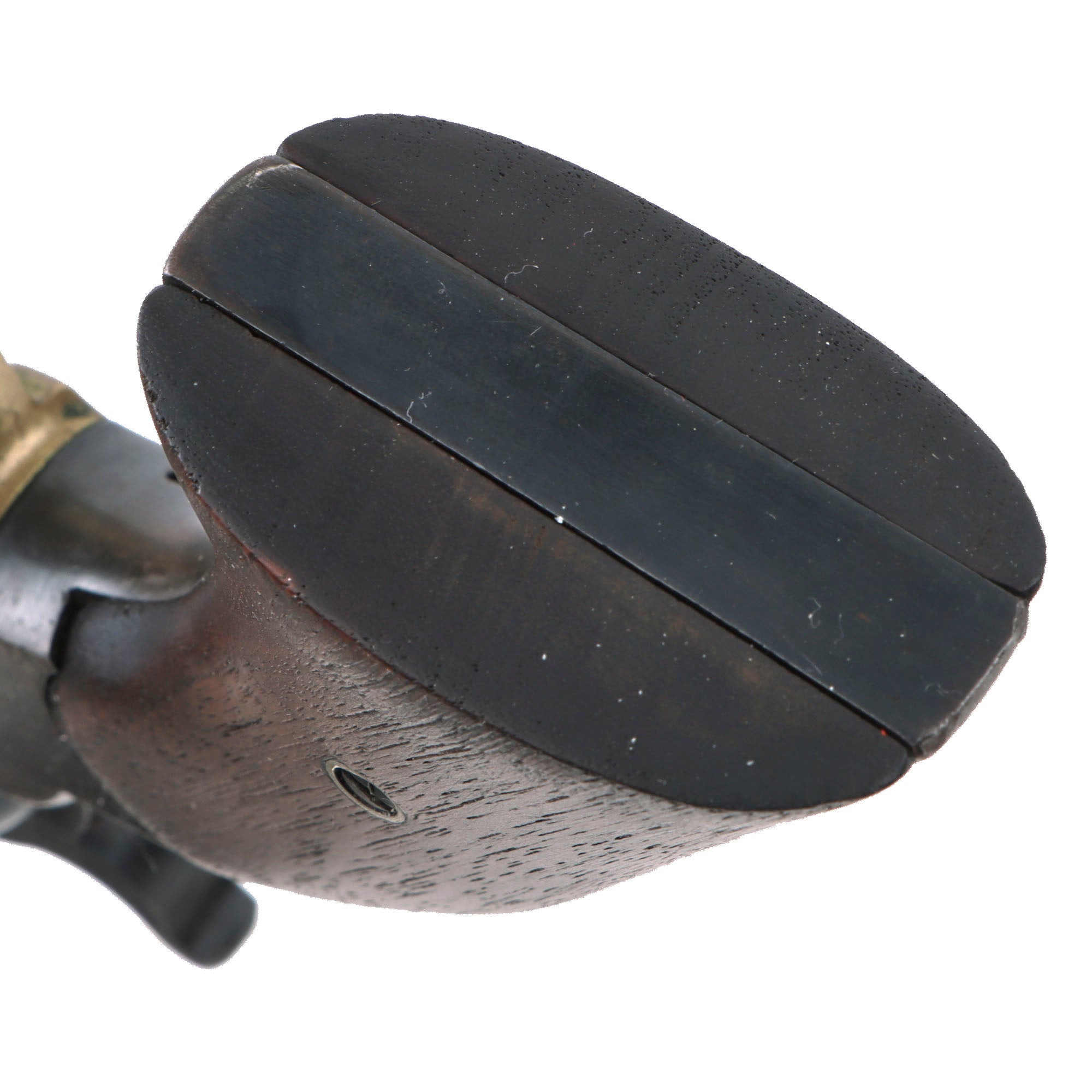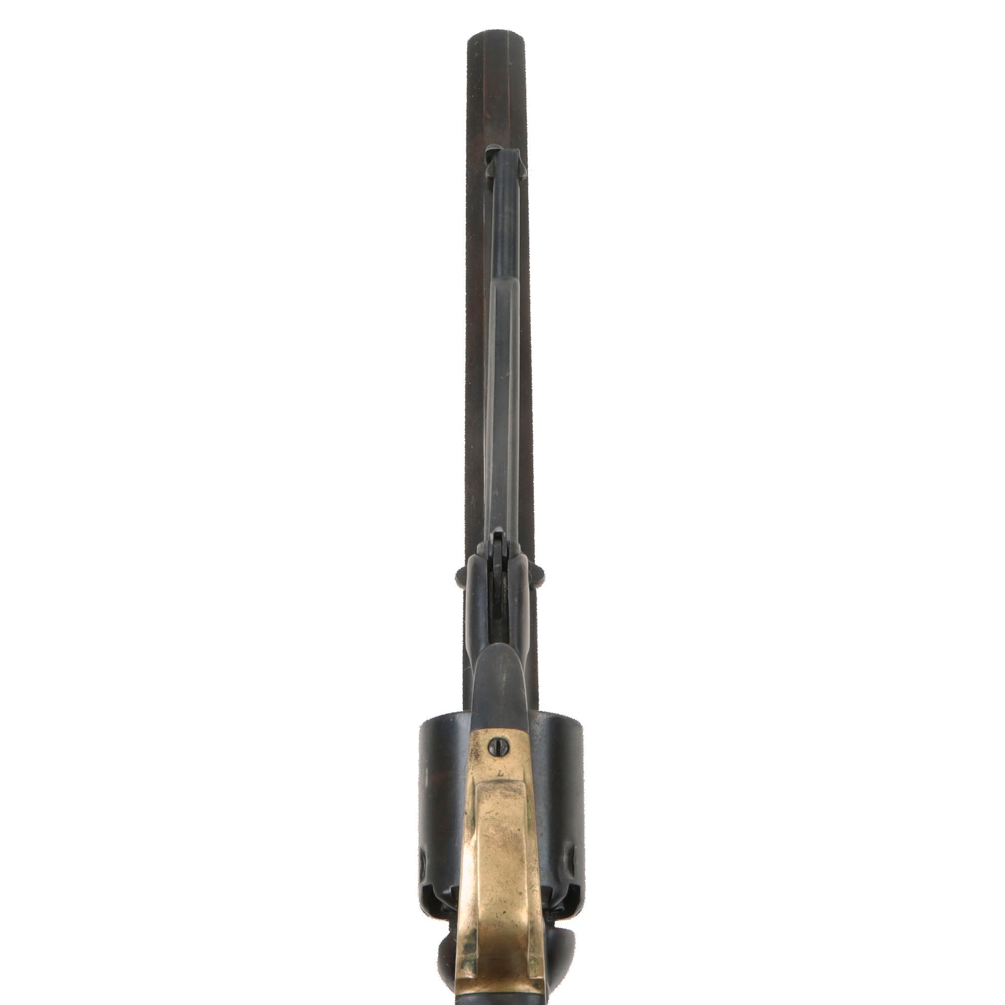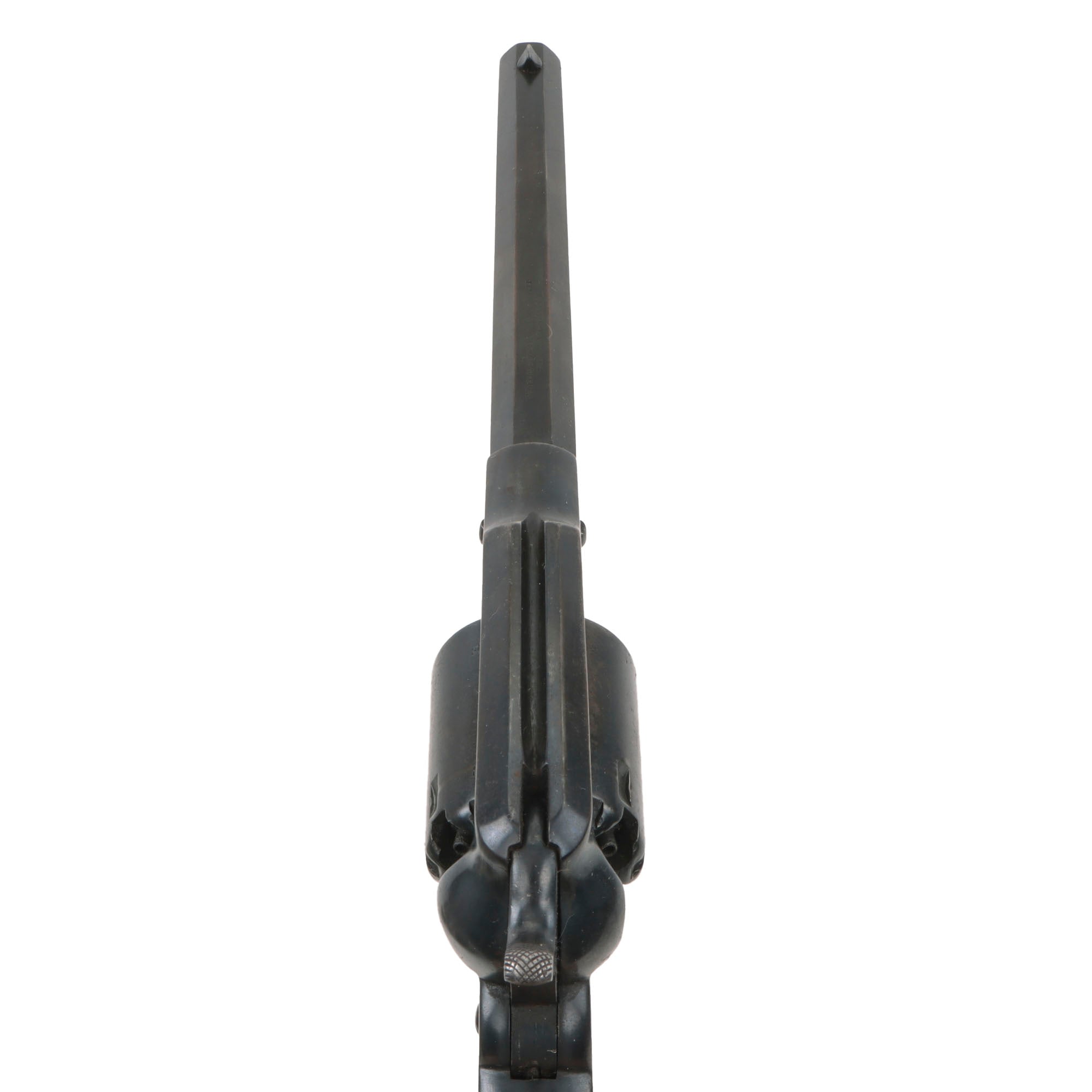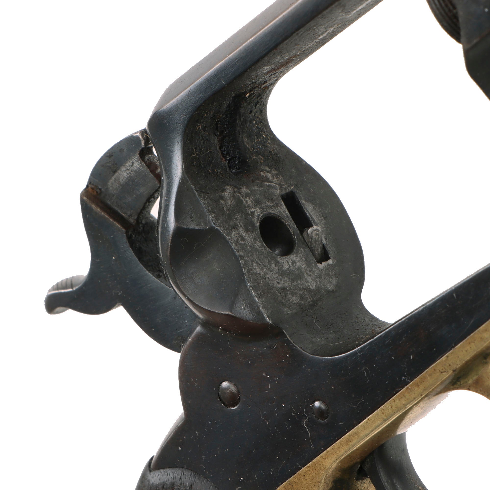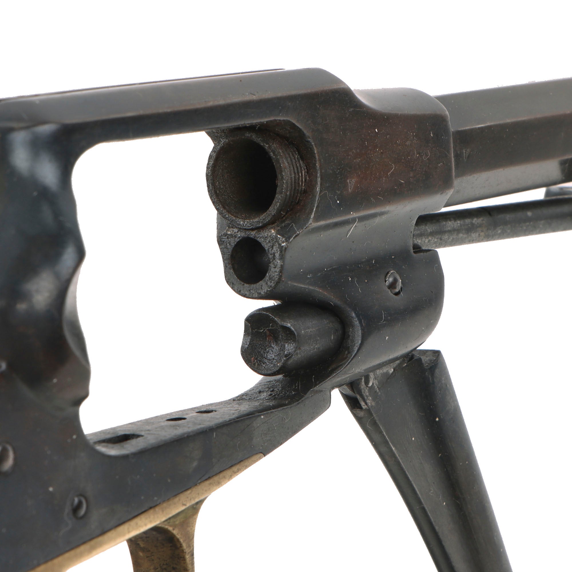 The revolver functions beautifully, with a strong smooth action and a strong mainspring. It indexes correctly with a solid cylinder lockup, and a crisp dry fire. We have not noticed any of the usual "finicky" behavior of the action on this revolver. The front of the barrel has the original steel "pinched" front sight intact, not replaced as many were. The bore is in very good condition, showing a partly bright finish with clear lands and grooves, though there are definitely areas of past fouling and oxidation visible. The revolver looks to have been well maintained during its service life, but even that cannot prevent wear from use. The cap nipples are all in very good shape and fully clear, showing moderate oxidation and wear on the exteriors.