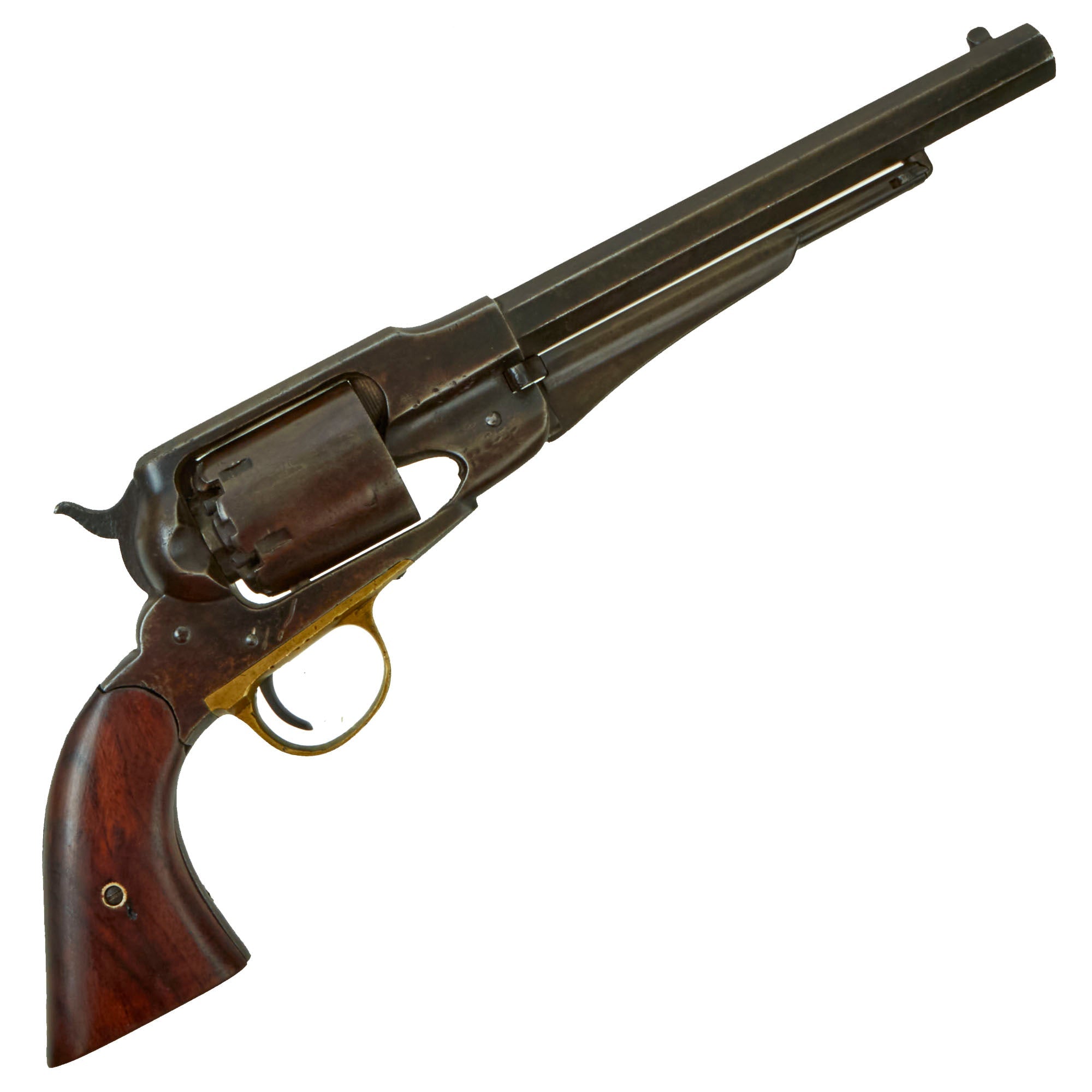 Original Item: Only One Available. This is a very nice service used example of a Remington New Model Army Percussion Revolver, with a lovely patina from age and use. It looks to be all original, except for the lovely walnut grips, which are definitely recent replacements, and look great. Like all New Models, it is a .44 caliber percussion, 6 shot single action revolver, with an 8-inch octagon barrel. These were often called the Model 1858 due to the patent dates, but production of this revision started in 1863, and the "New Model Army" is the correct designation from Remington.