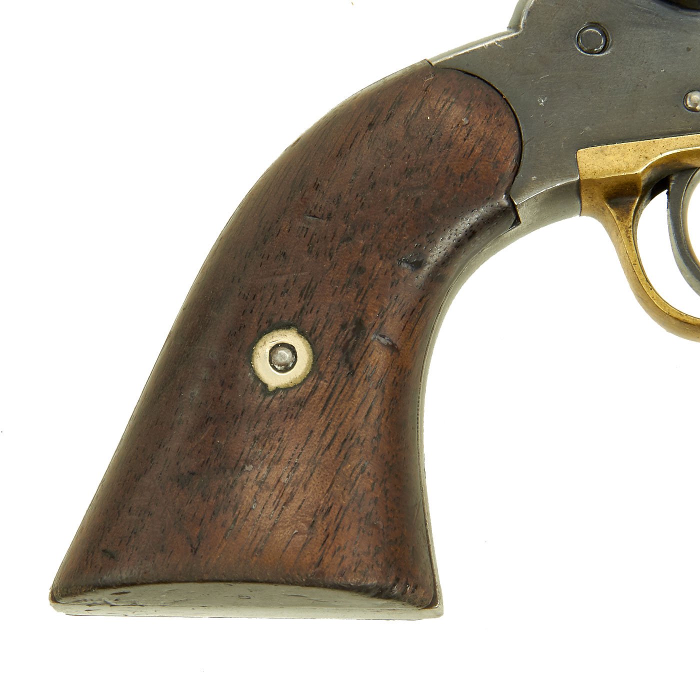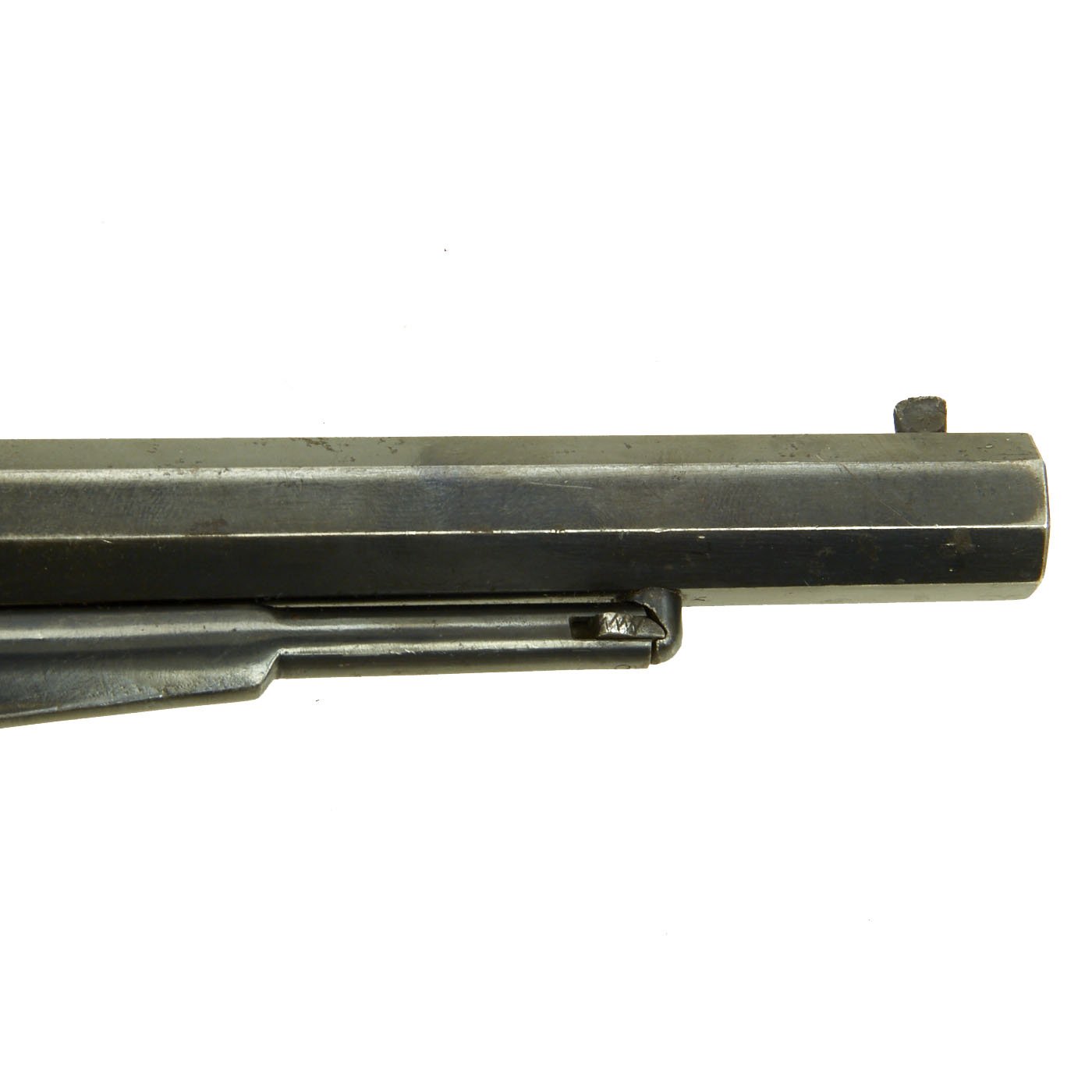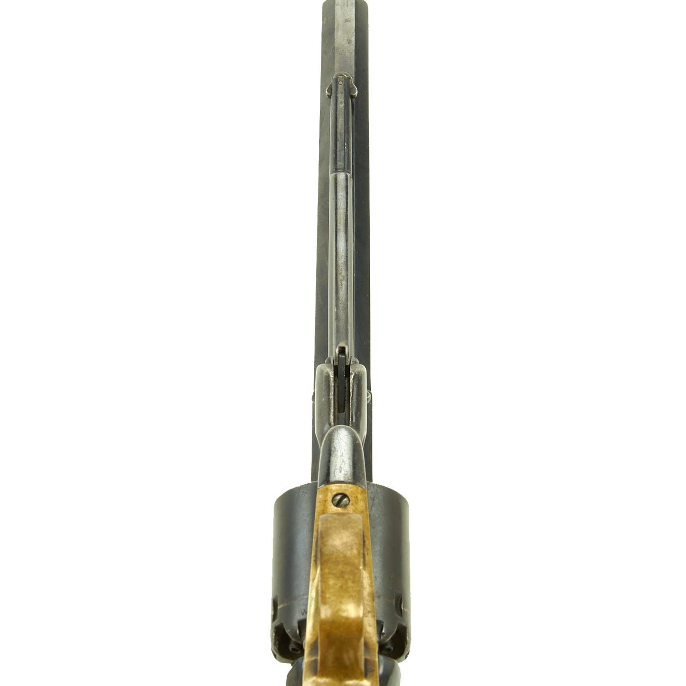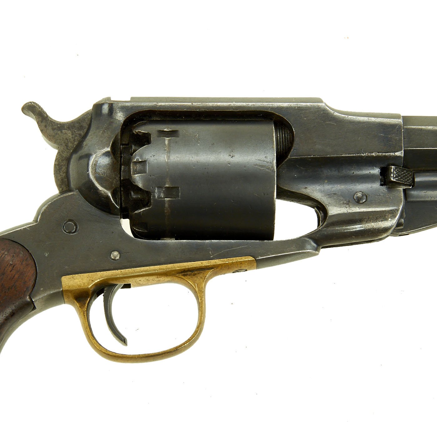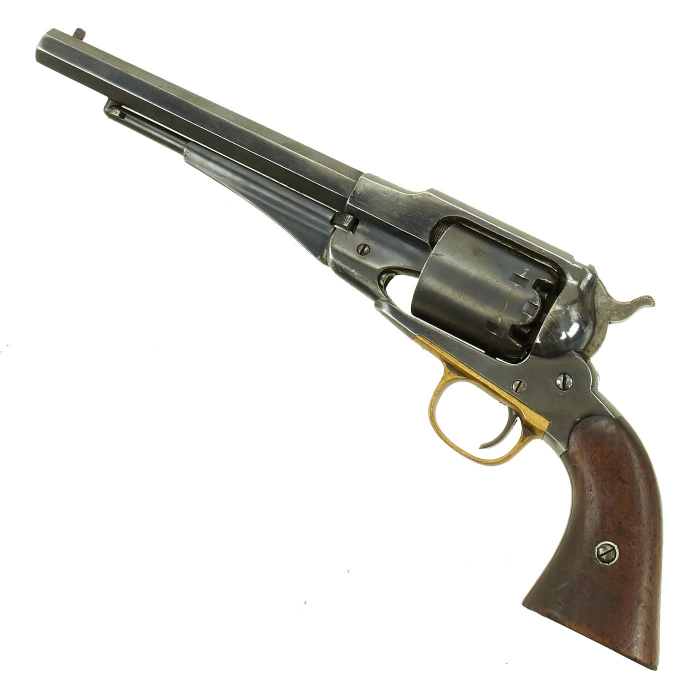 Original Item: Only One Available. This is undoubtedly the best Remington New Model Army Percussion Revolver we have seen in some time! It's a real peach! Like all New Models, it is a .44 caliber percussion, 6 shot single action revolver, with an 8-inch octagon barrel. These were often called the Model 1858 due to the patent dates, but production of this revision started in 1863, and the "New Model Army" is the correct designation from Remington. The top of the octagonal barrel still shows the original markings: