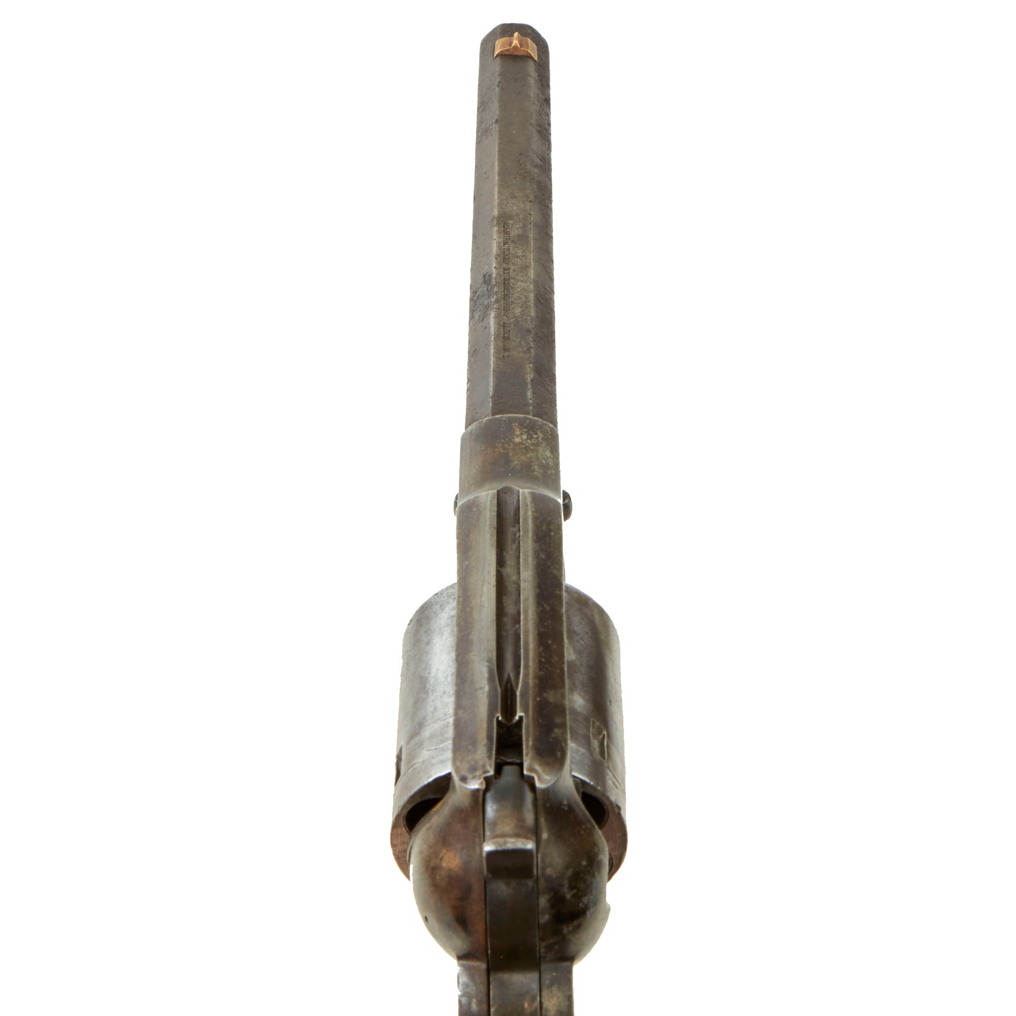 Overall condition is good, with a good finish on the frame area, which possibly may have been refinished at some point. The exterior of the barrel however shows extensive wear on all sides, with rust pitting evident in many areas. We have considered the possibility that the barrel was swapped at some point, but as the serial number on the bottom is completely work away, we have no way to confirm this. The grip frame under the grip scales is faintly marked with serial number 15141, which should be for a later production "Old Model" 1861. There is also assembly number 59 stamped on the bottom of the grip frame. The grip plates themselves are definitely replacements, and are in very good condition.