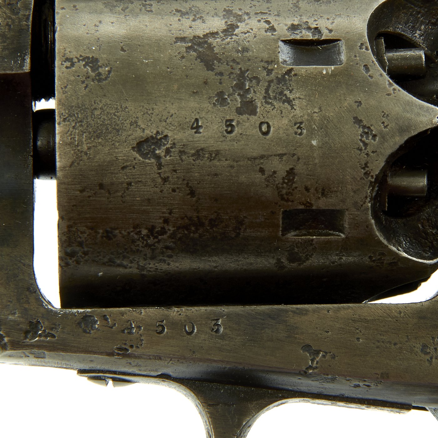 Overall finish is a nice worn gray patina, and has not been refurbished or buffed, as many were. It does however show evidence of past external pitting, now ground away. All parts of the revolver bear matching serial 4503, including the frame, grip frame, barrel, cylinder, loading rammer, and even the insides of both grip scales. The left grip scale also still has a crisp script RPB cartouche of inspector Captain R. P. Barry, who inspected Remington, Starr, and Rogers & Spencer Revolvers from 1860 to 1865.