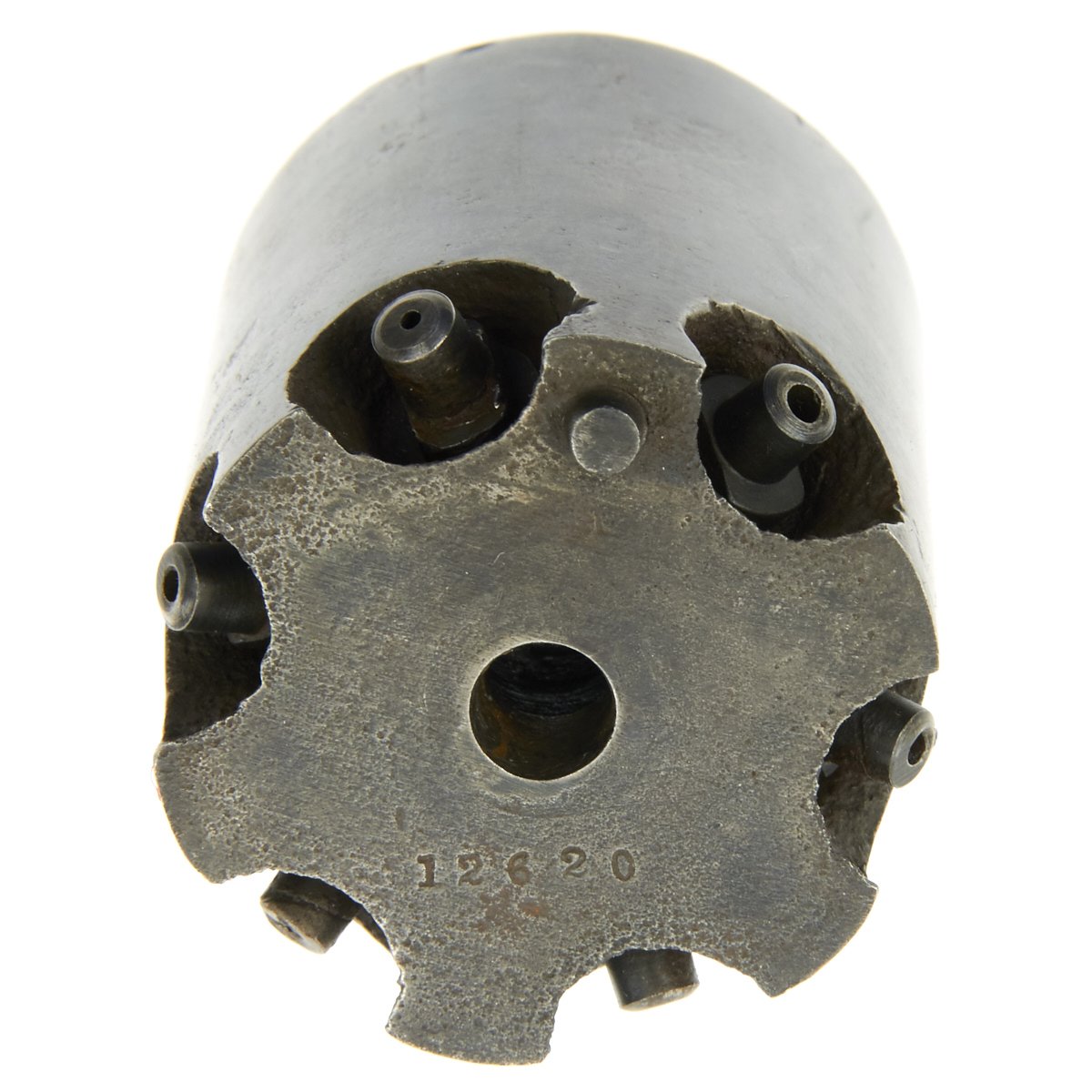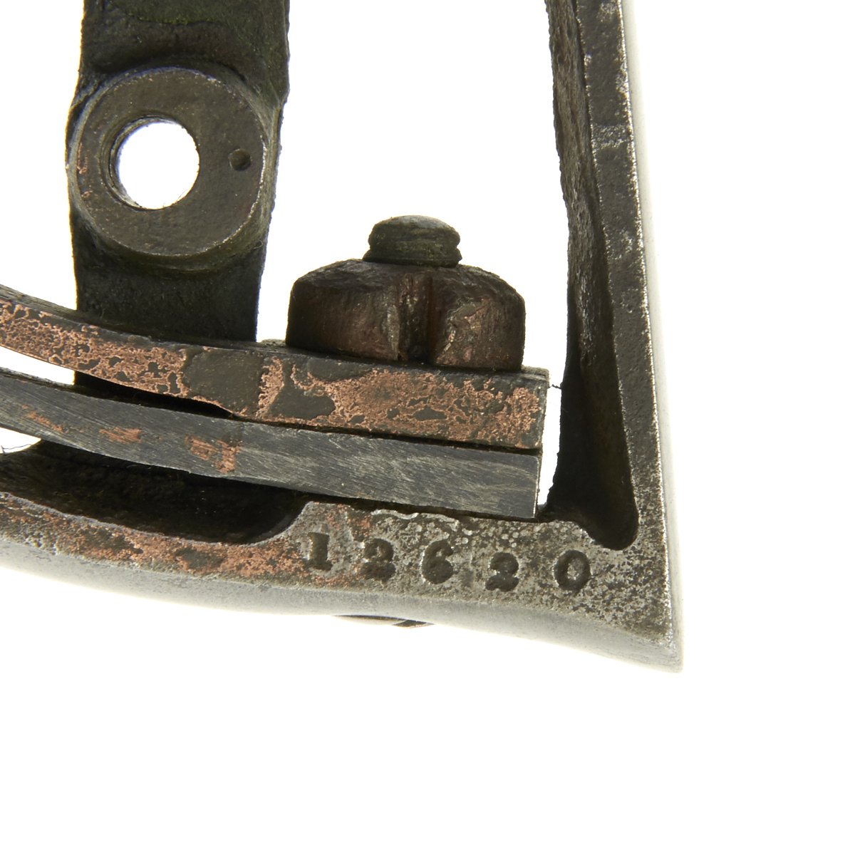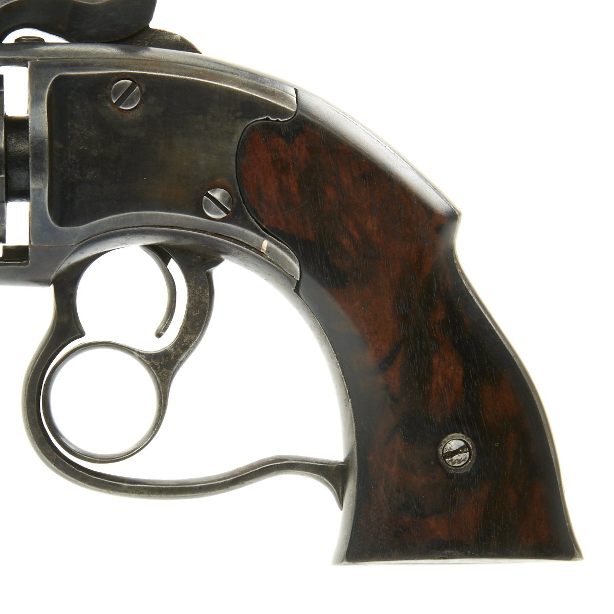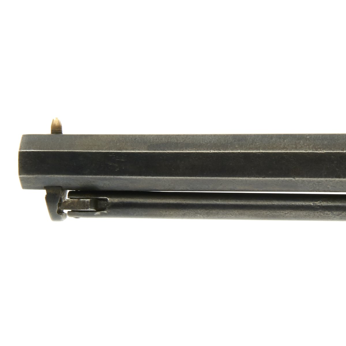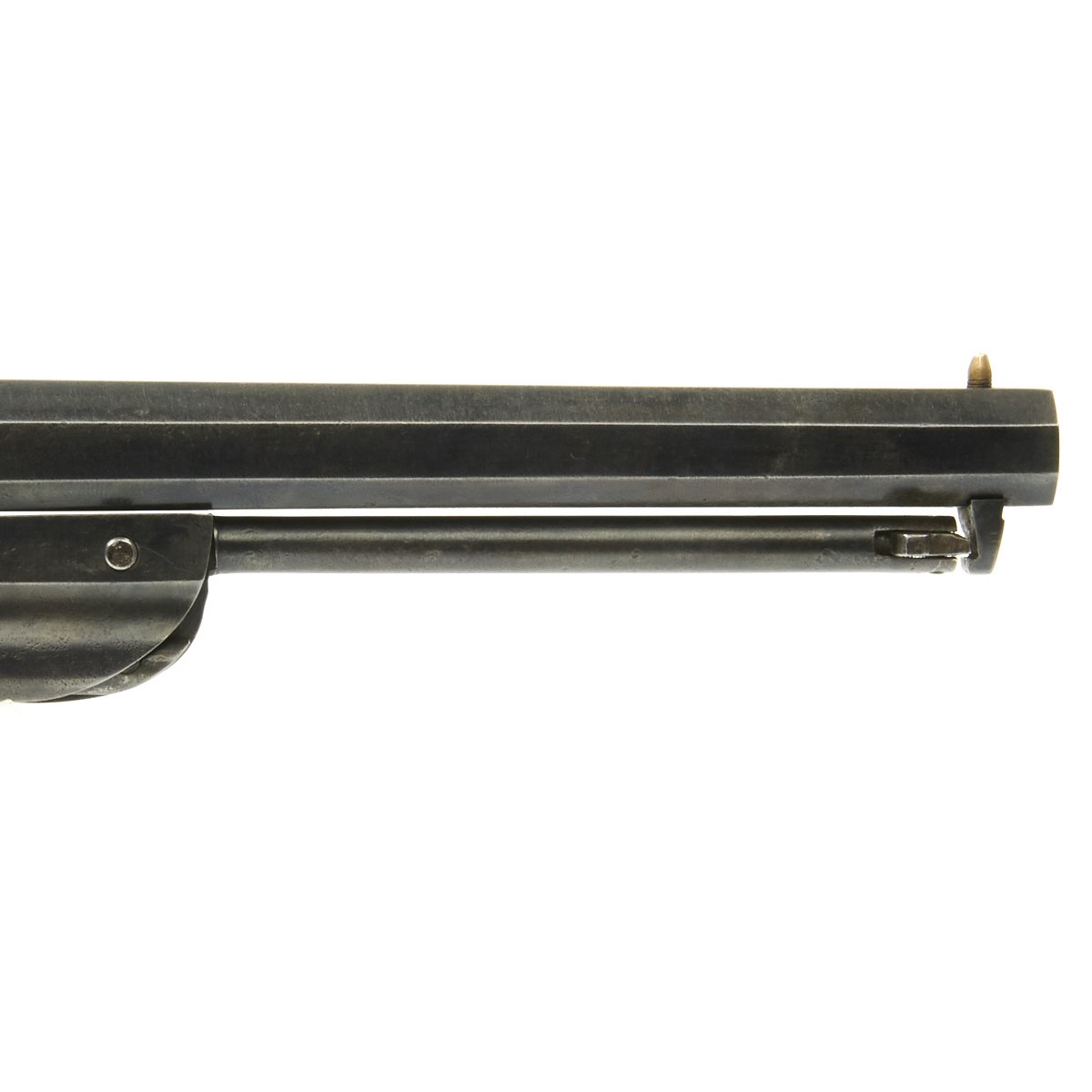 This is a very nice example, manufactured in early 1862, around the middle of total production. It bears serial number 12620, which is faintly stamped on the underside of barrel and clearly on the back of the cylinder. Serial number 12620 is also present on the inside frame beneath the original wood grips.