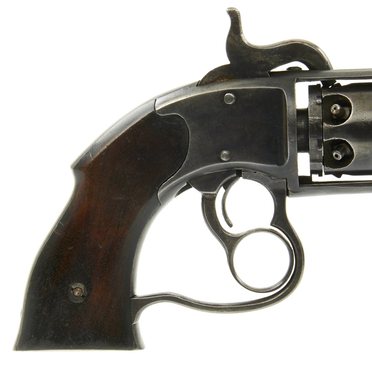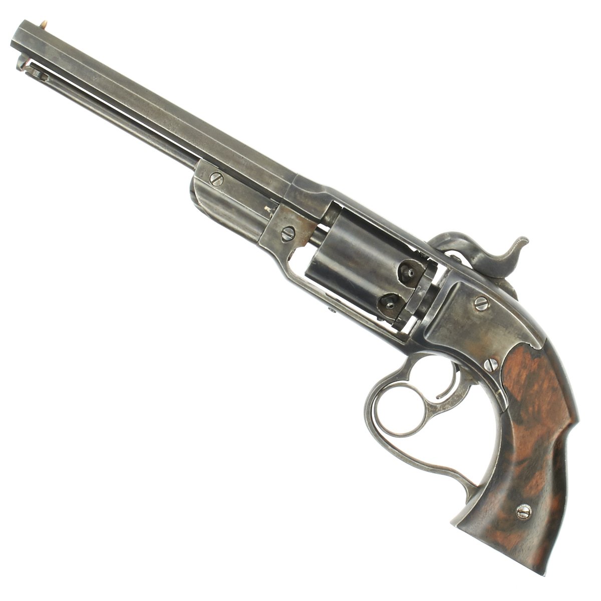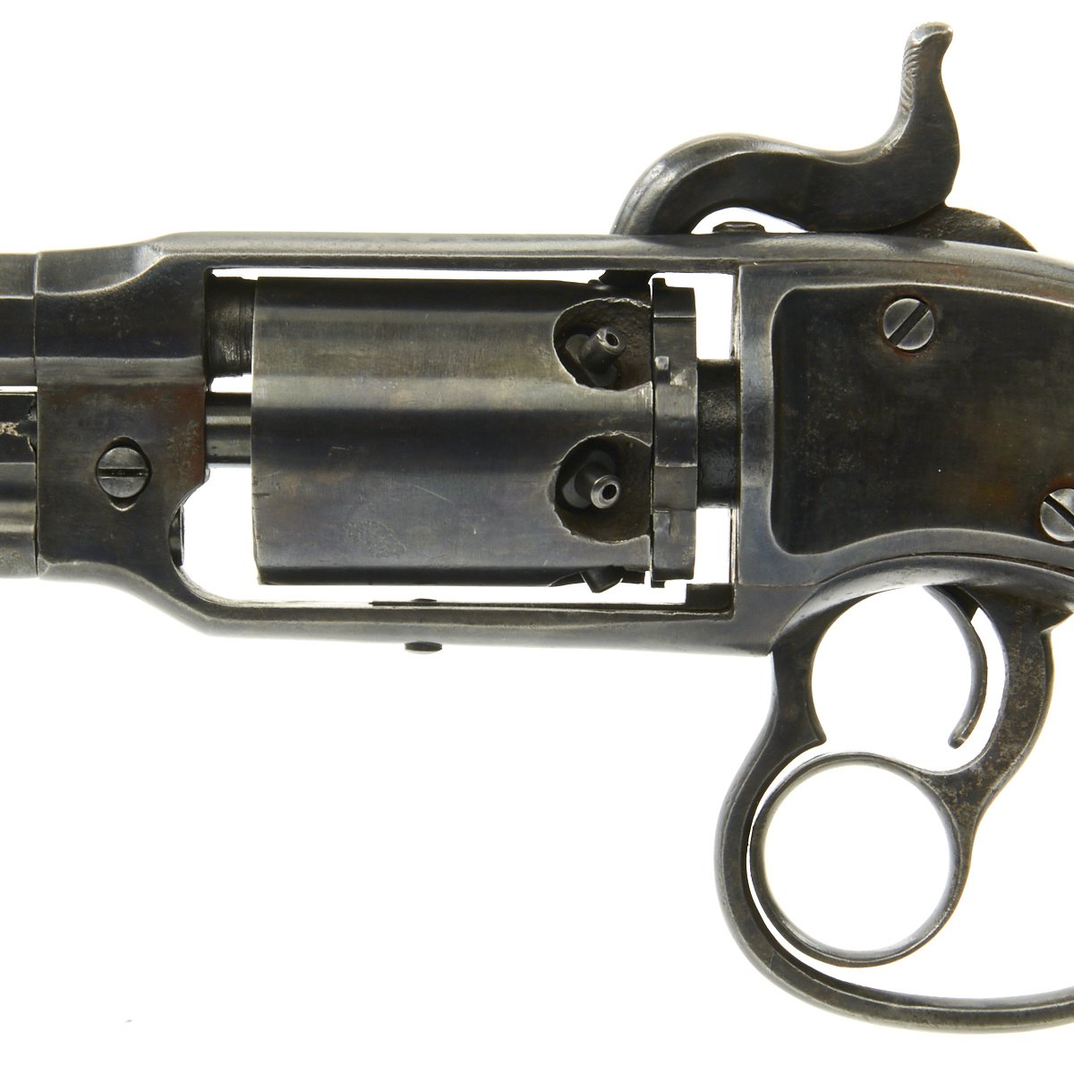 Overall the pistol is in great condition with traces of past pitting, functions nicely and is completely original. The cylinder and chambers are crisp and all 6 cap nipples are intact, which is rare for this style revolver, as the hammer tension is strong. The barrel has worn lands and grooves, with a dull finish.