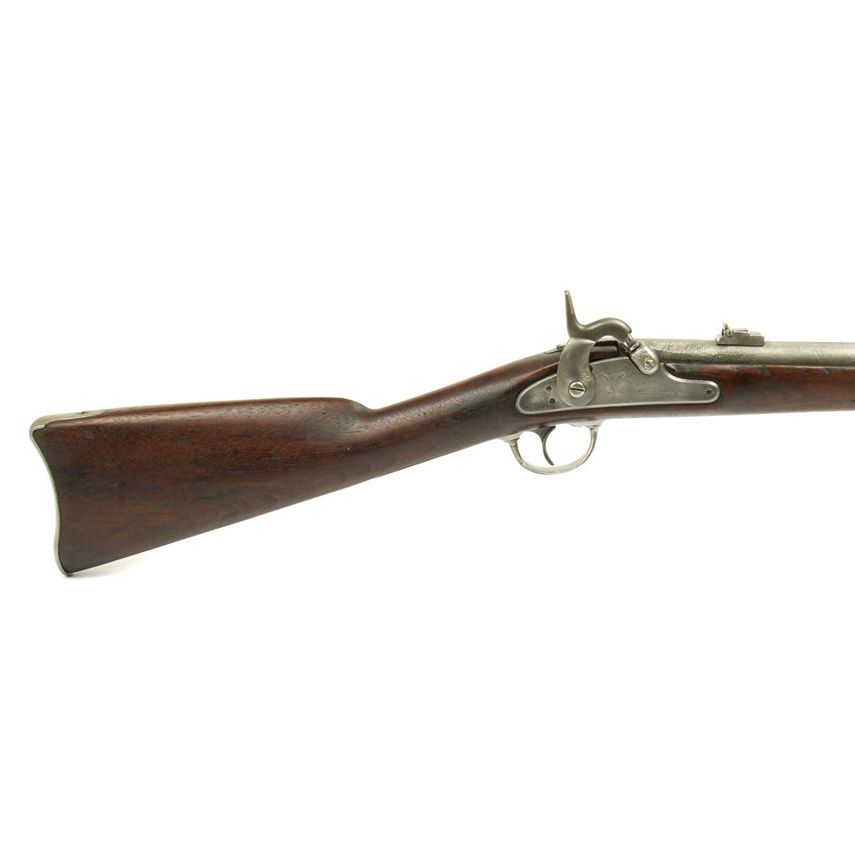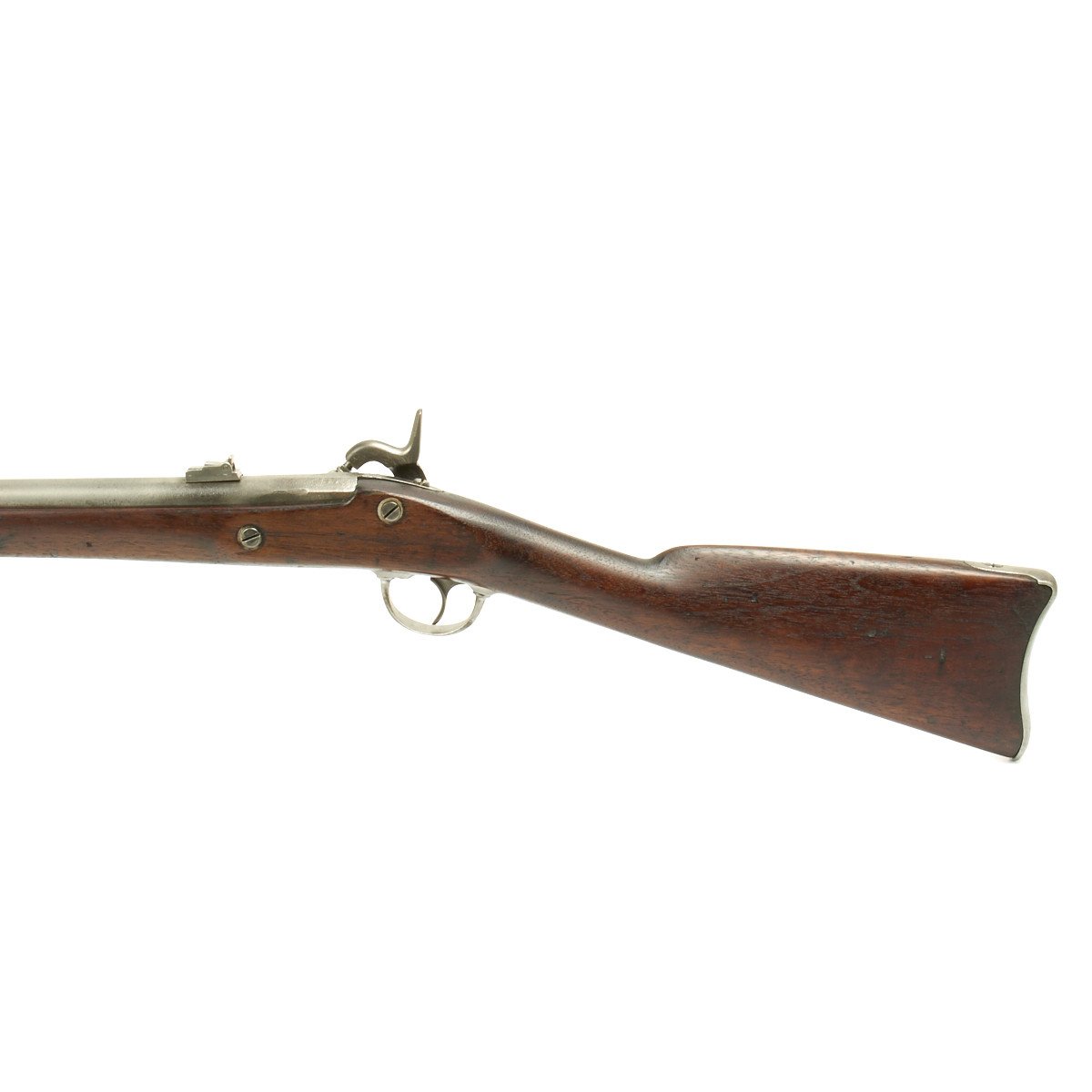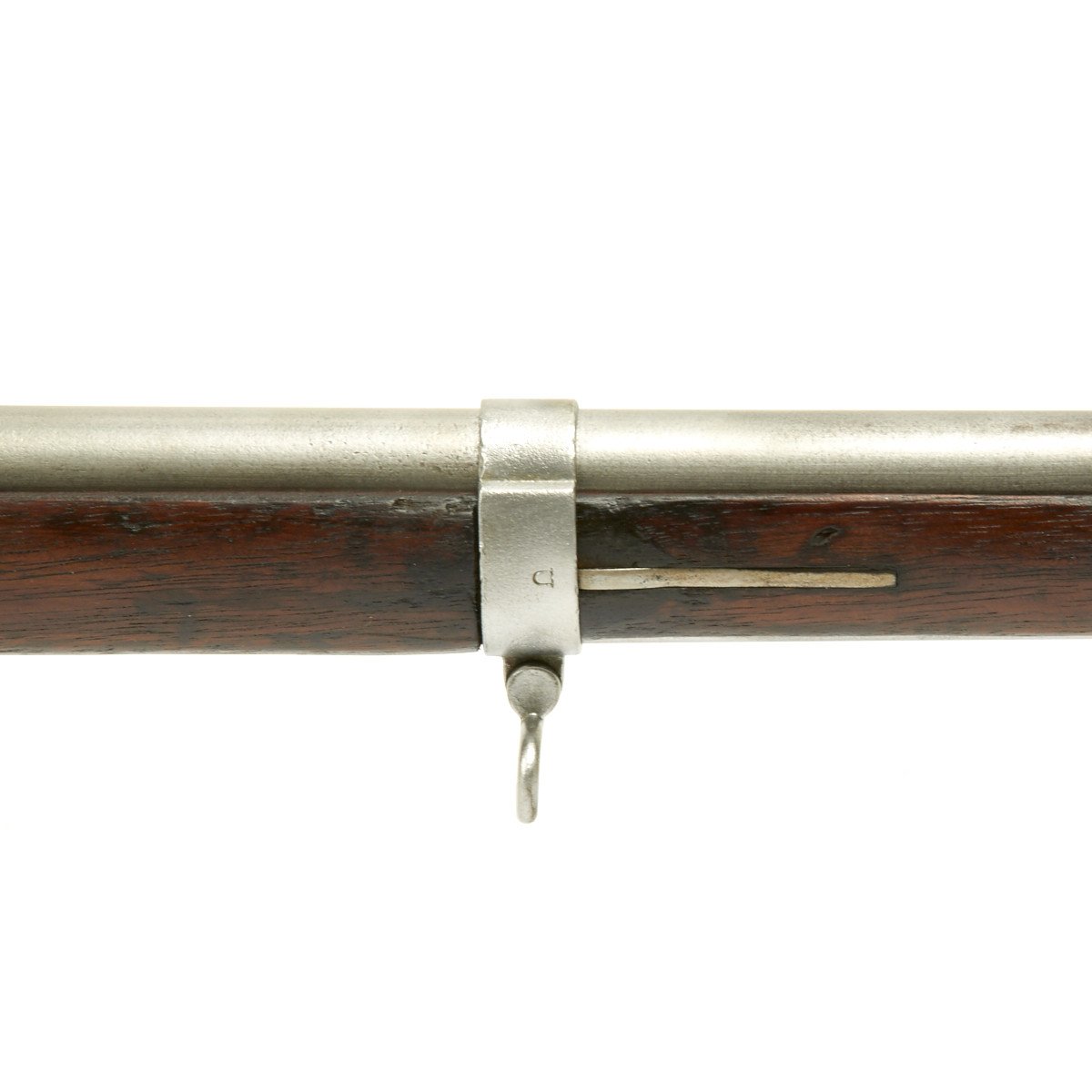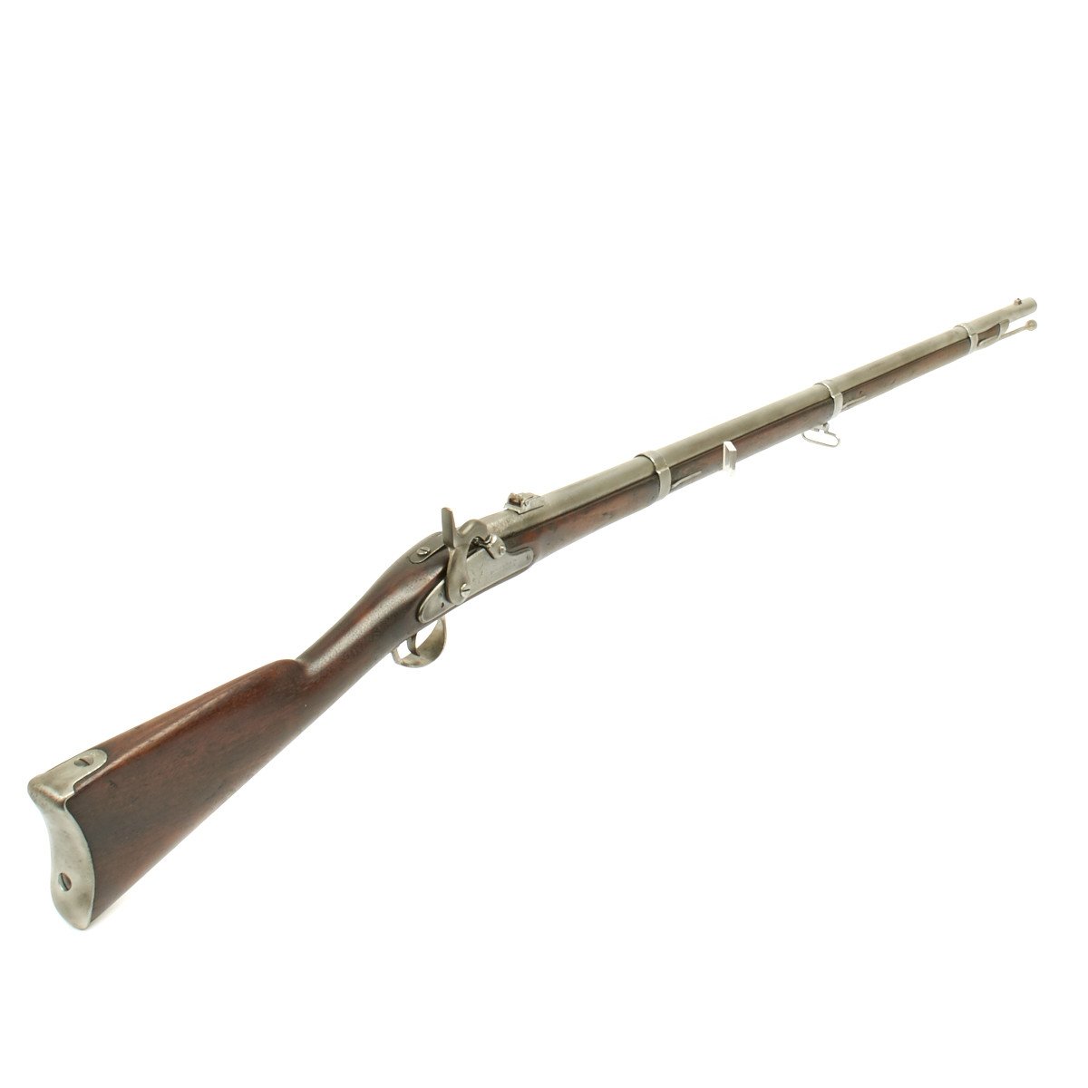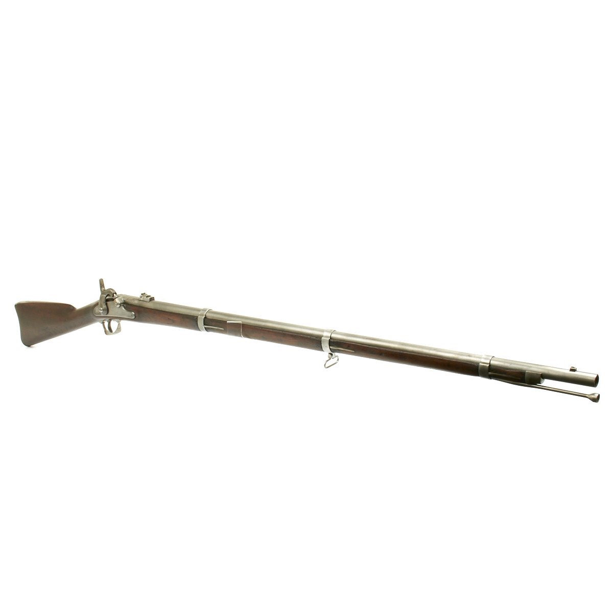 This rifled, single-shot muzzleloader retains a pleasing appearance and has undergone moderate cleaning to both wood and gunmetal. Barrel exhibits a light gray sheen overall with just scant pinprick pitting in areas especially at the barrel bolster / breech area. Musket retains its 40 long round barrel, two-leaf rear sight, bayonet lug, front blade sight, nipple, C shaped hammer, steel ramrod with threaded tip, original barrel bands, sling swivels, and butt plate. Buttplate tang stamped U.S along with small sub-inspector mark. The bore has a little bit of peppering and minor pitting, but lands and grooves are crisp.