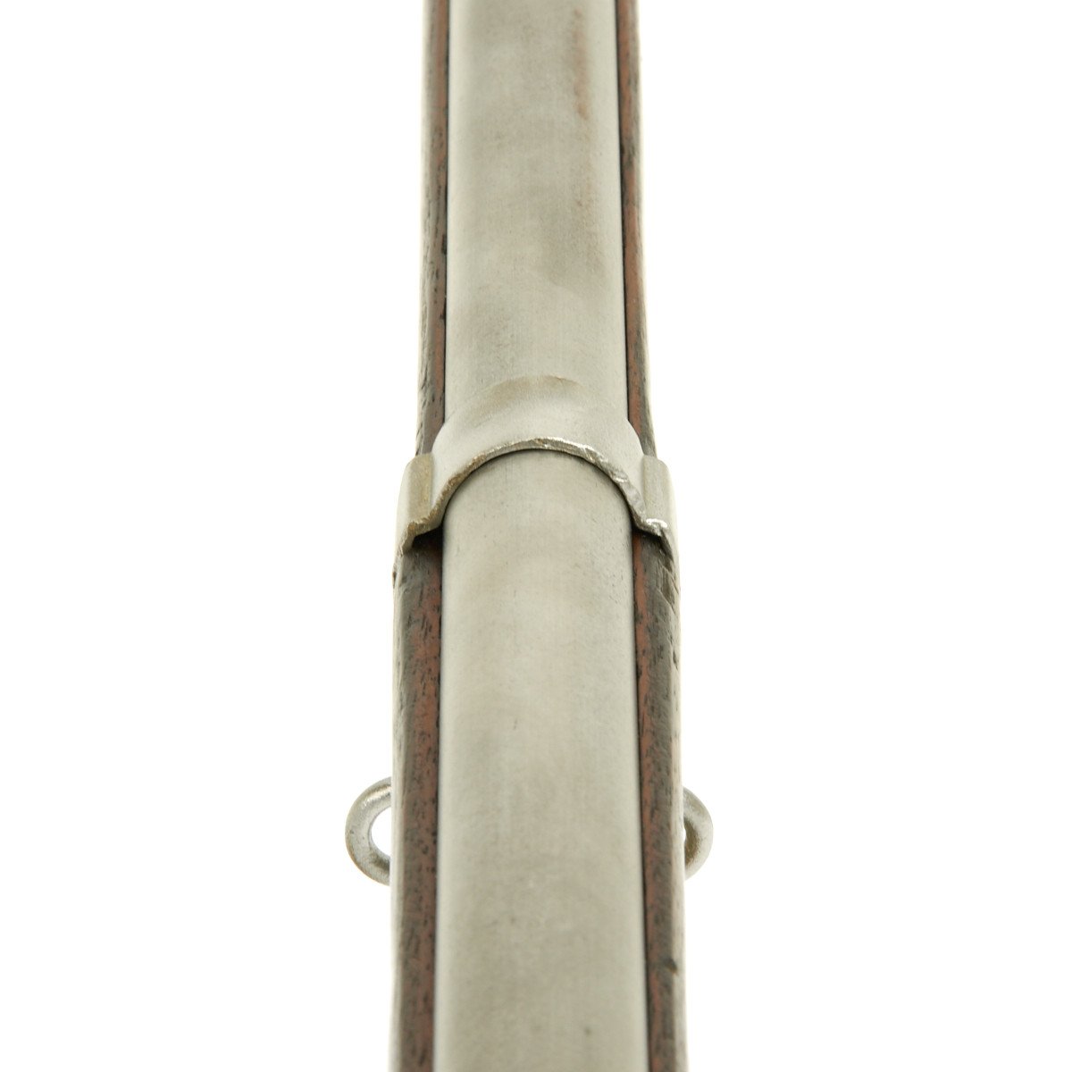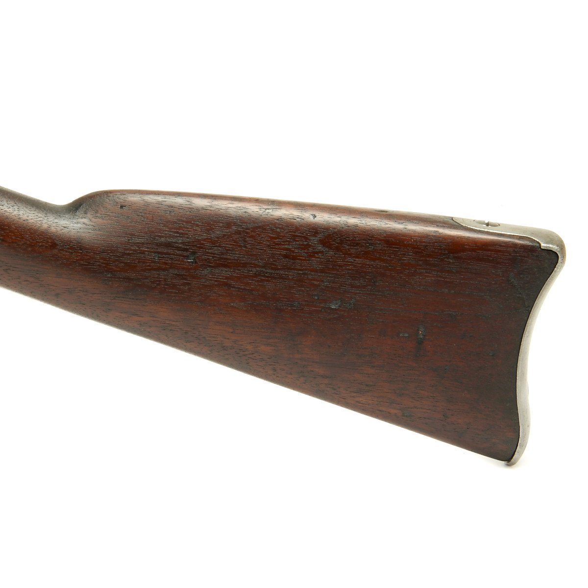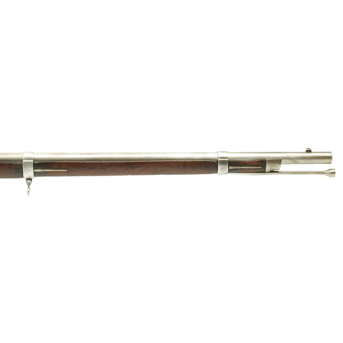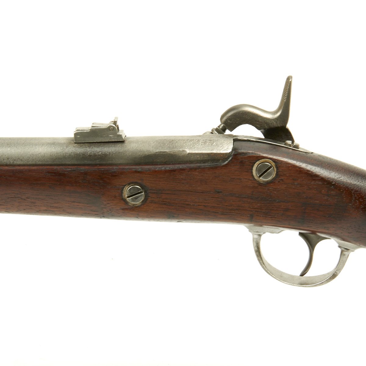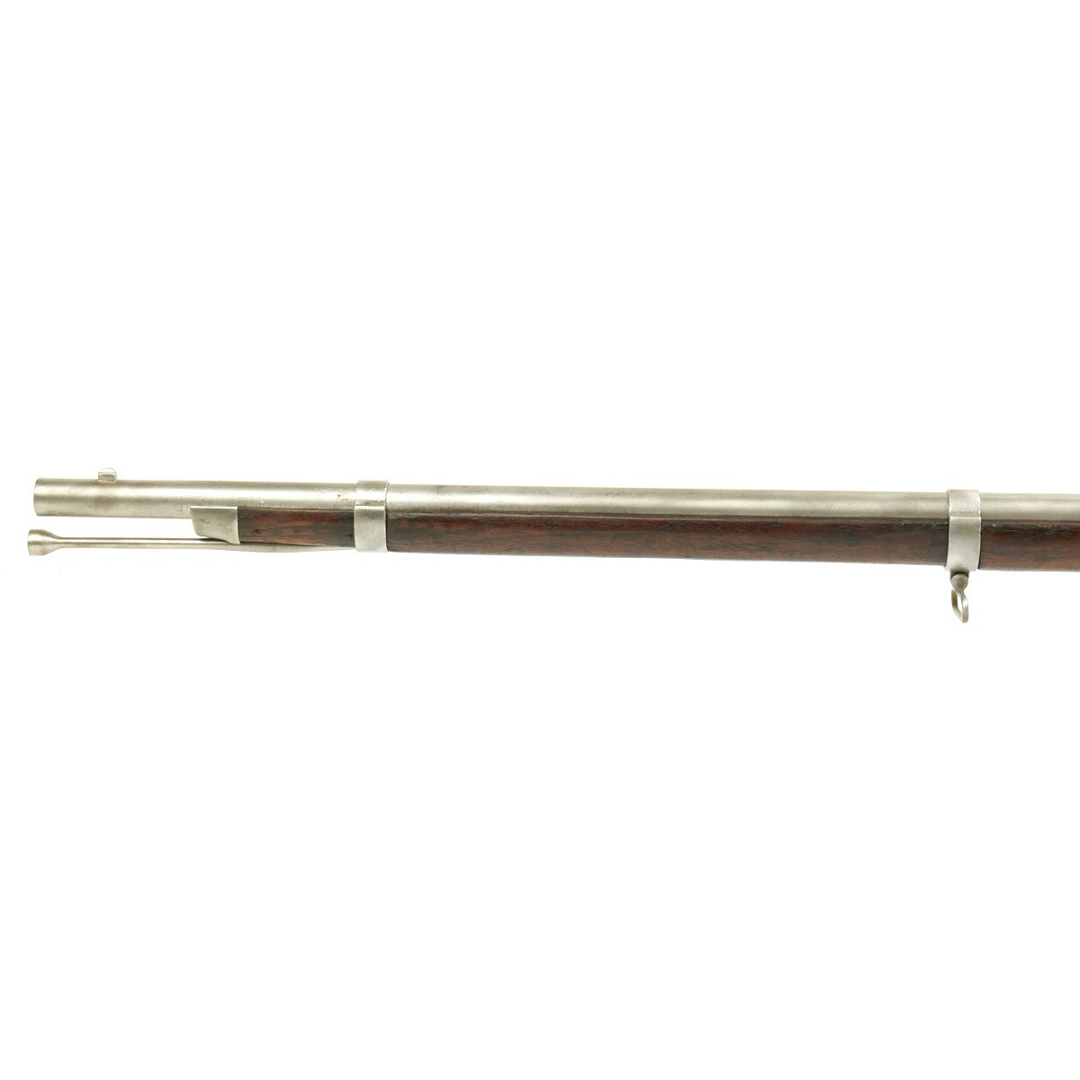 This rifled, single-shot muzzleloader retains a pleasing appearance and has undergone moderate cleaning to both wood and gunmetal. Barrel exhibits a light gray sheen overall with just scant pinprick pitting in areas especially at the barrel bolster / breech area. Musket retains its 40 long round barrel, two-leaf rear sight, bayonet lug, front blade sight, nipple, C shaped hammer, steel ramrod with threaded tip, original barrel bands, sling swivels, and butt plate. Buttplate tang stamped U.S along with small sub-inspector mark. The bore has a little bit of peppering and minor pitting, but lands and grooves are crisp.