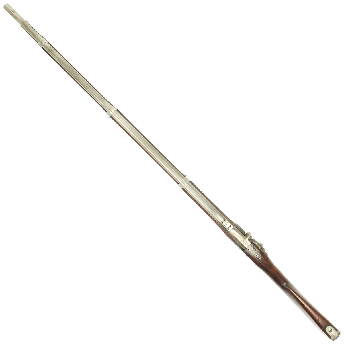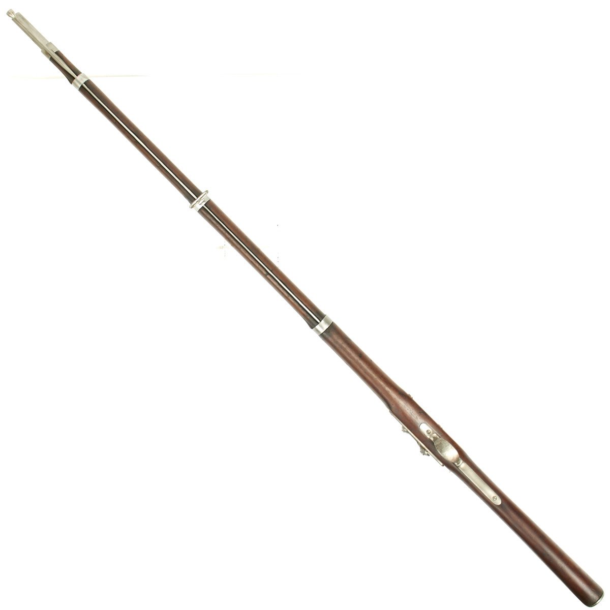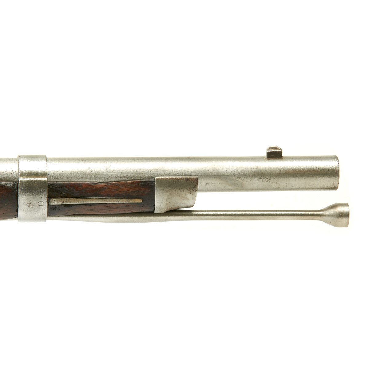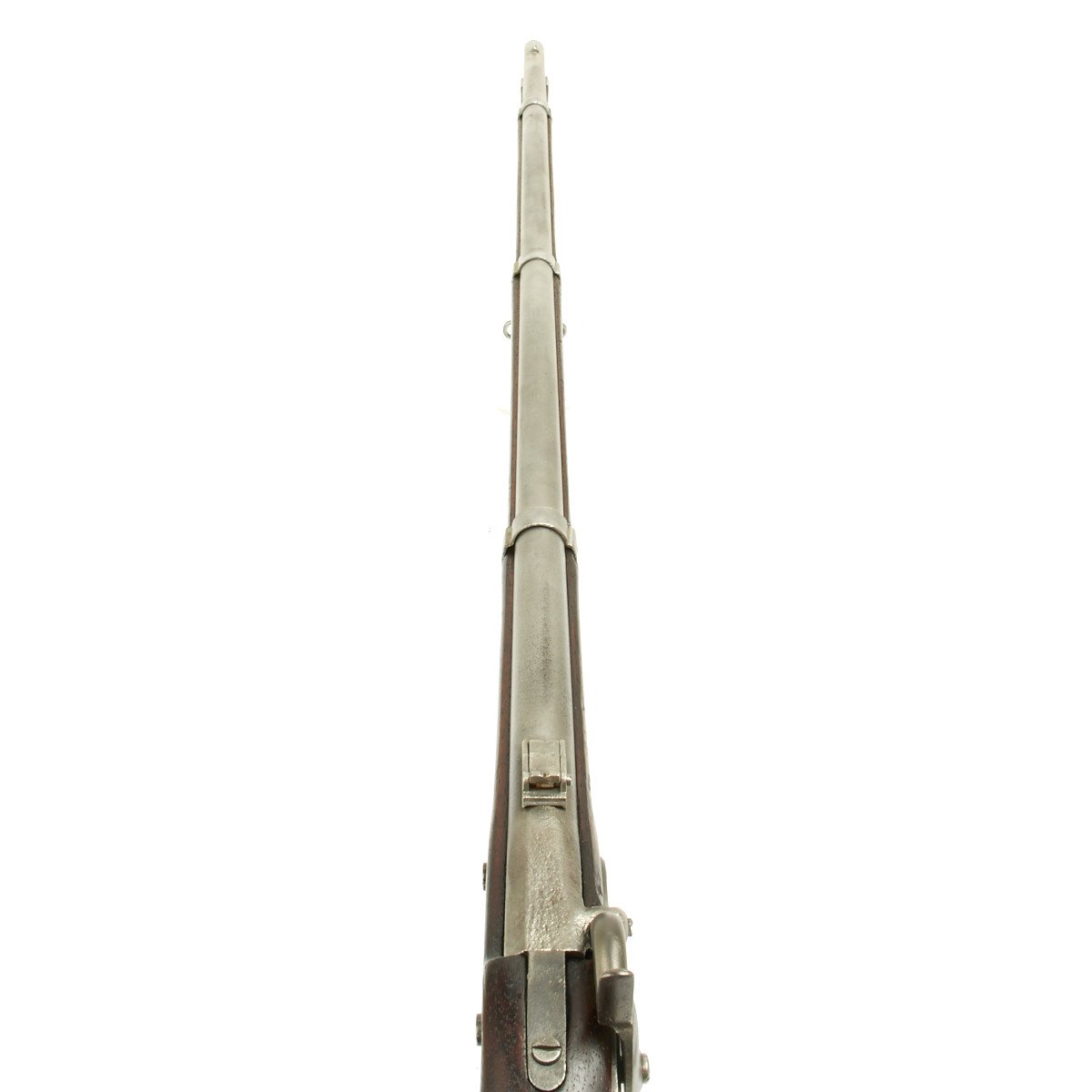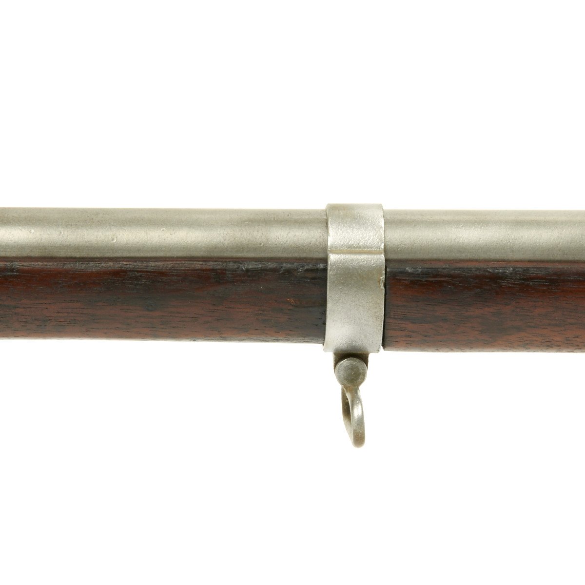 This rifled, single-shot muzzleloader retains a pleasing appearance and has undergone moderate cleaning to both wood and gunmetal. Barrel exhibits a light gray sheen overall with just scant pinprick pitting in areas especially at the barrel bolster / breech area. Musket retains its 40 long round barrel, two-leaf rear sight, bayonet lug, front blade sight, nipple, C shaped hammer, steel ramrod with threaded tip, original barrel bands, sling swivels, and butt plate. Buttplate tang stamped U.S along with small sub-inspector mark. The bore has a little bit of peppering and minor pitting, but lands and grooves are crisp.