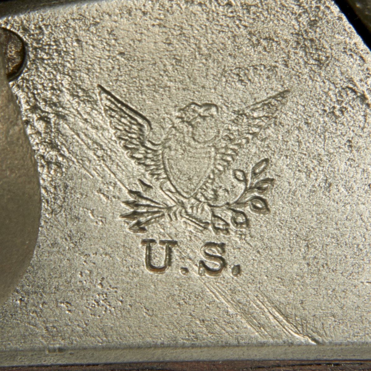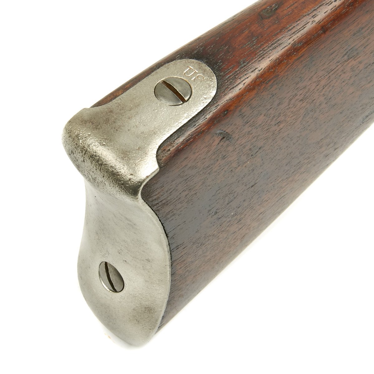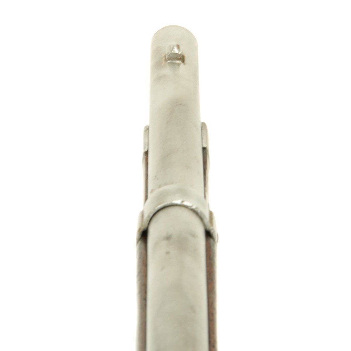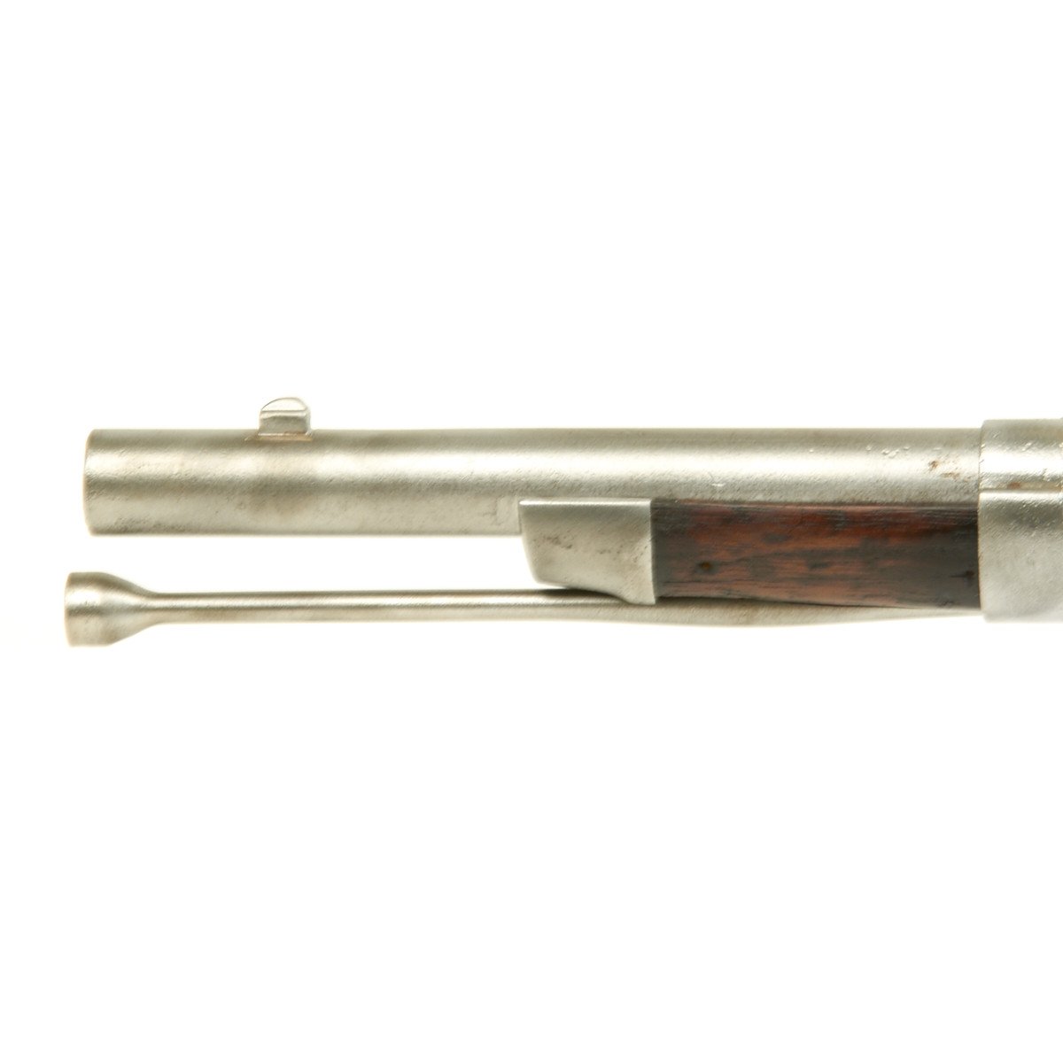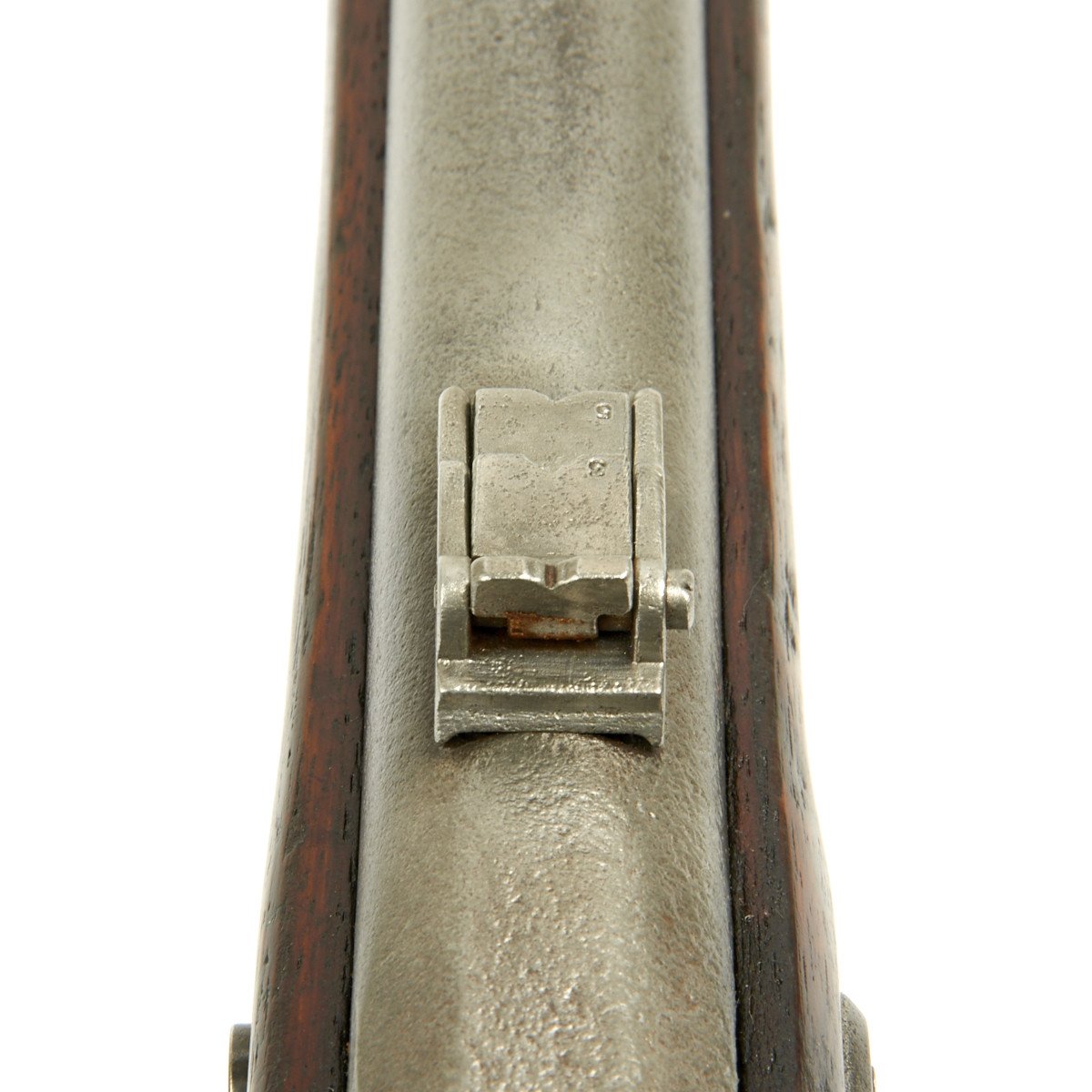 This rifled, single-shot muzzleloader retains a pleasing appearance and has undergone moderate cleaning to both wood and gunmetal. Barrel exhibits a light gray sheen overall with just scant pinprick pitting in areas especially at the barrel bolster / breech area. Musket retains its 40 long round barrel, two-leaf rear sight, bayonet lug, front blade sight, nipple, C shaped hammer, steel ramrod with threaded tip, original barrel bands, sling swivels, and butt plate. Buttplate tang stamped U.S along with small sub-inspector mark. The bore has a little bit of peppering and minor pitting, but lands and grooves are crisp.