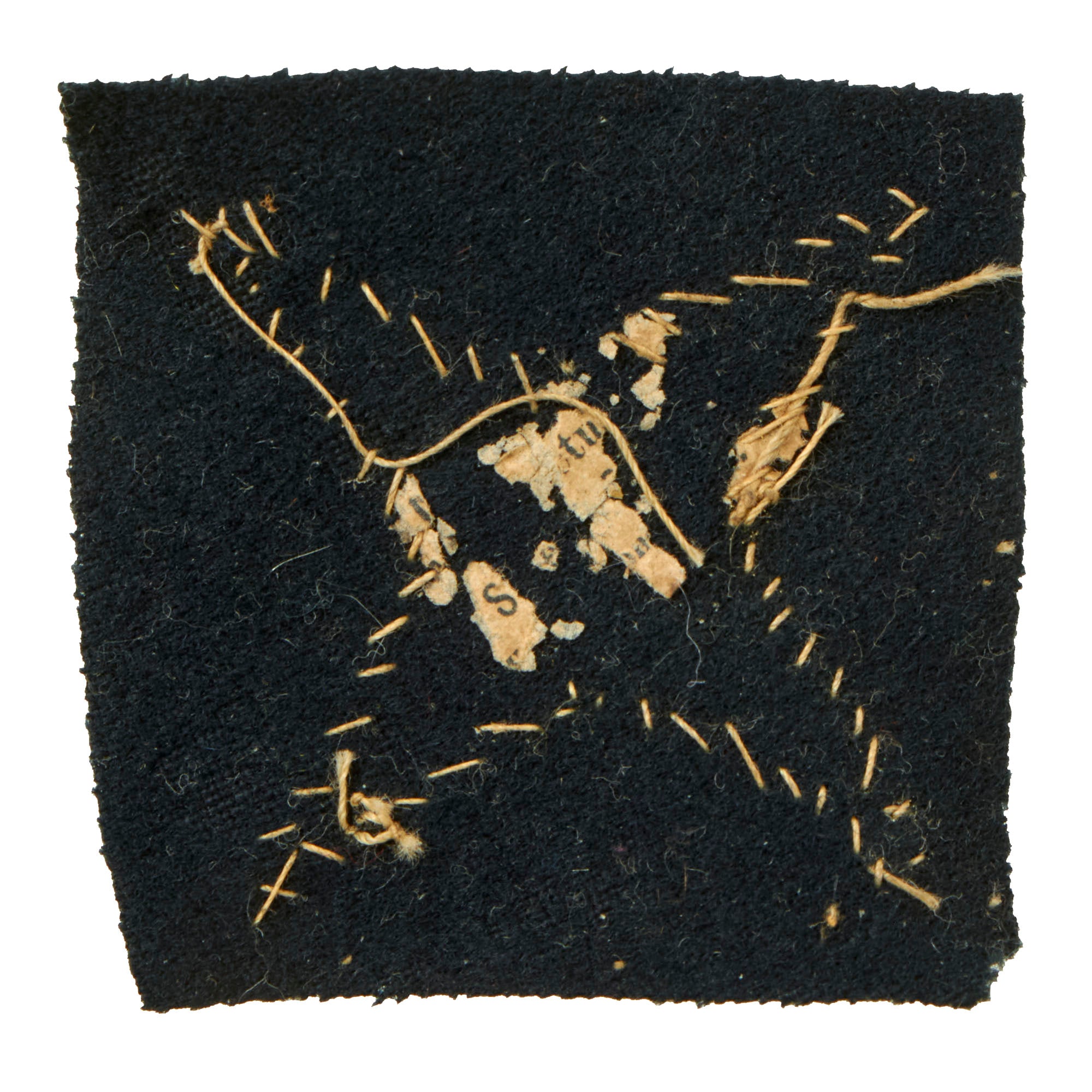 This example measures 1¾ x 1¾” and consists of a white four-pointed star on a black square background. Interestingly, there is a small bit of newspaper or a maker’s sticker left on the back, which certainly authenticates this piece as period, as soldiers very often used newspaper or other book paper as backing for these badges.