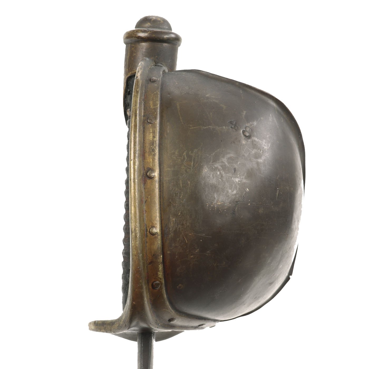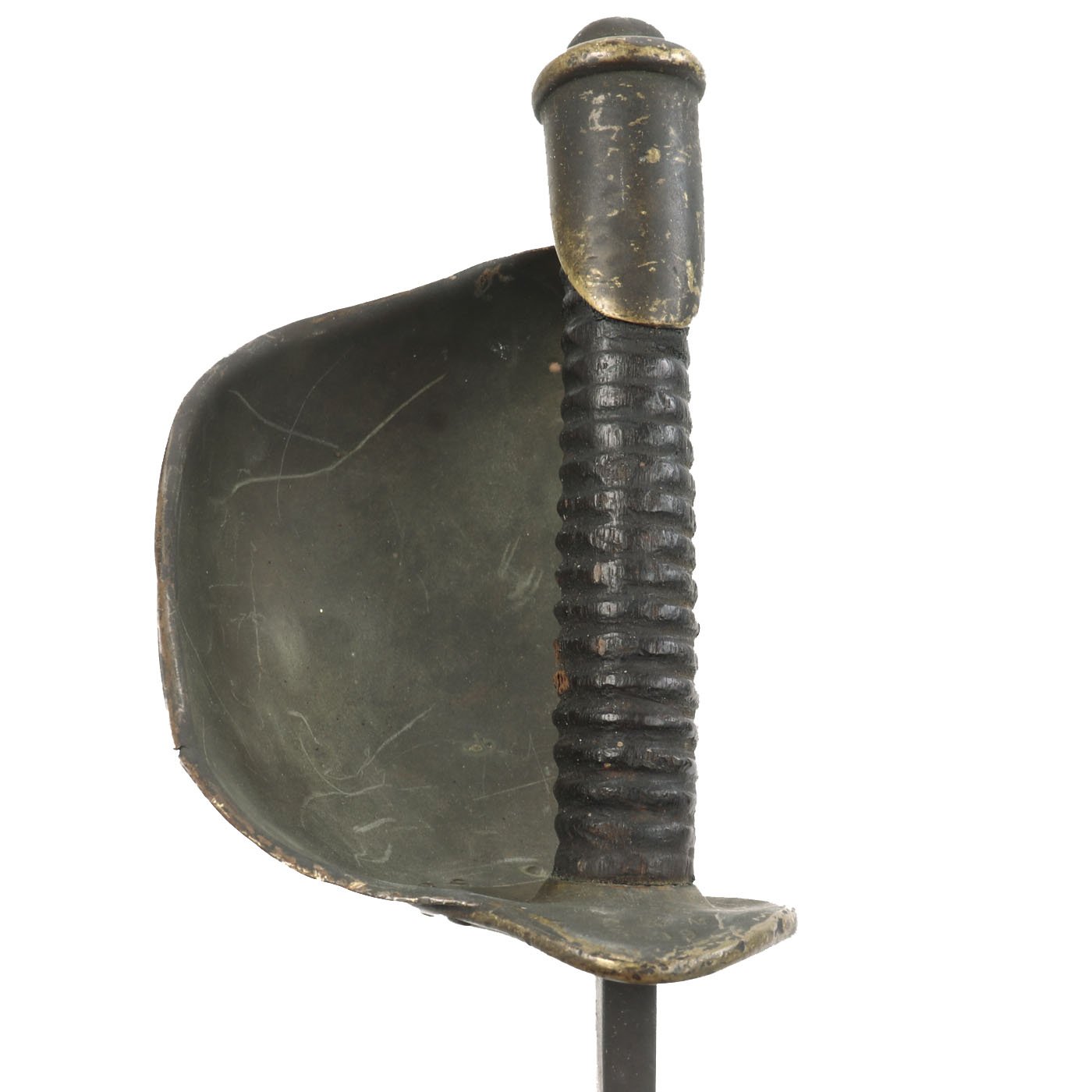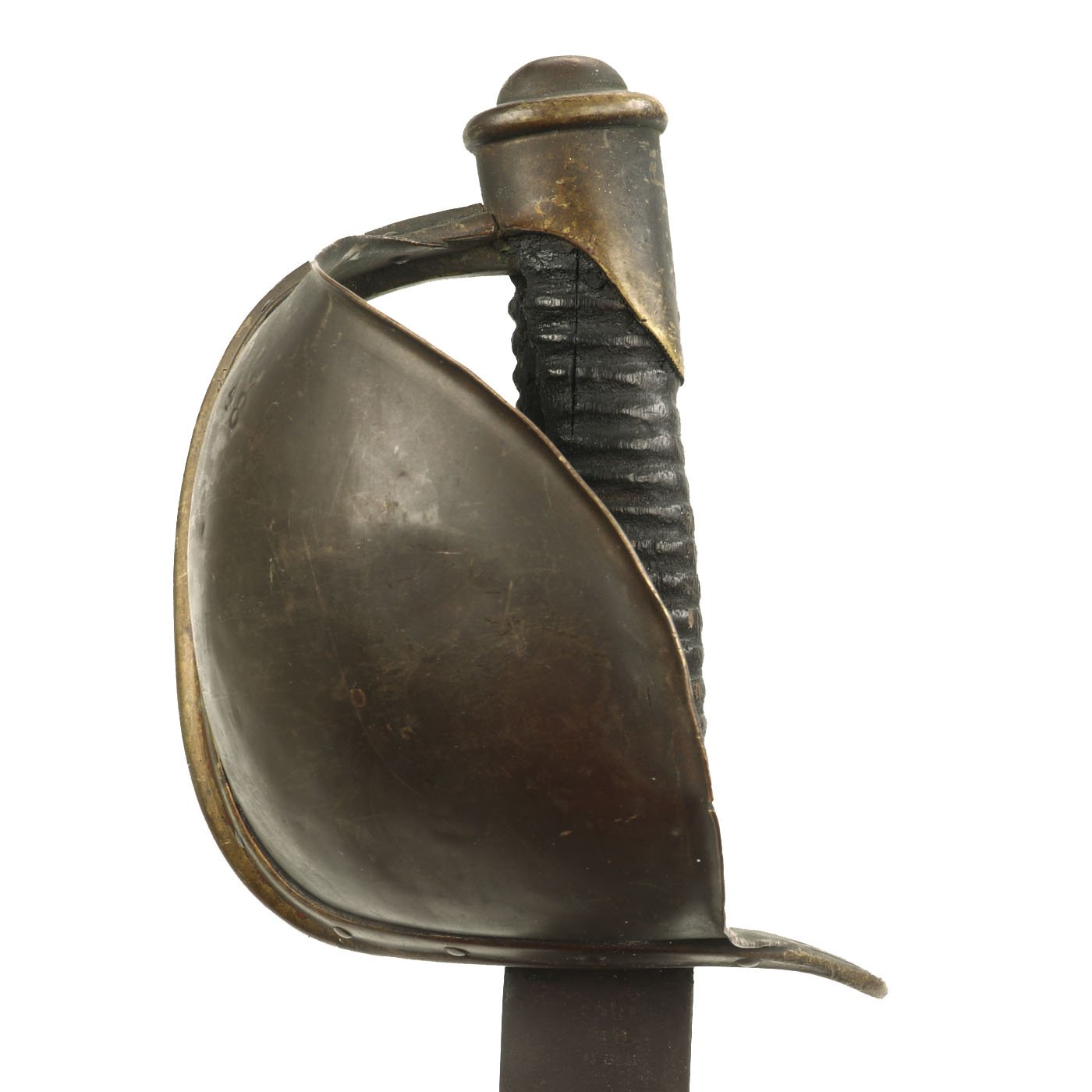 The blade now has a dark oxidized patina, very common for Naval Cutlasses due to the environment they were used in. It does not look to have any major damage to the edge, just wear from years of cleaning and oxidation. There is an additional inspector D.R. mark on the pommel, indicating inspection by Daniel Reynolds, one of many inspectors working at Ames during the U.S. Civil War. The underside of the guard is marked with rack number 2 5 M / 3 .09.