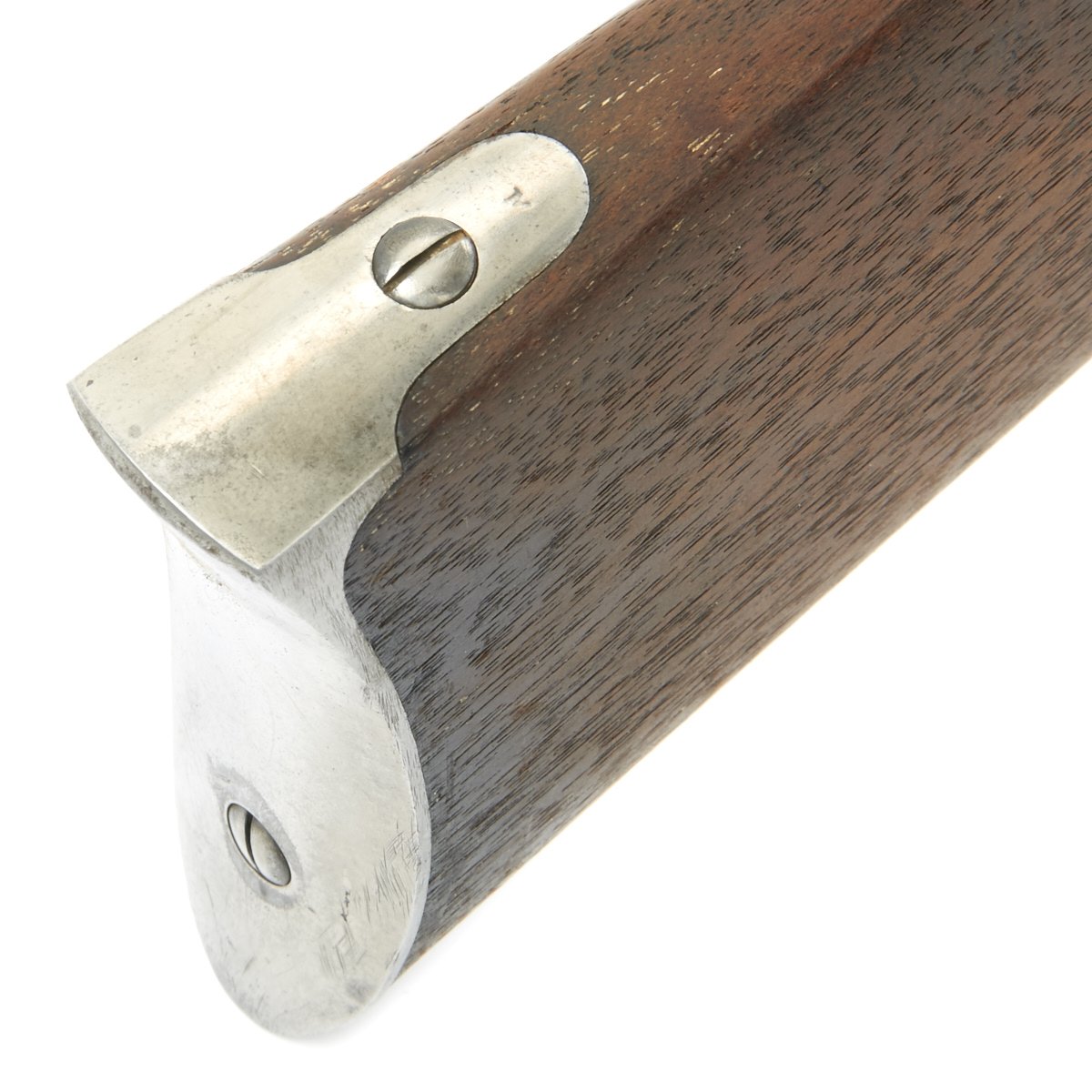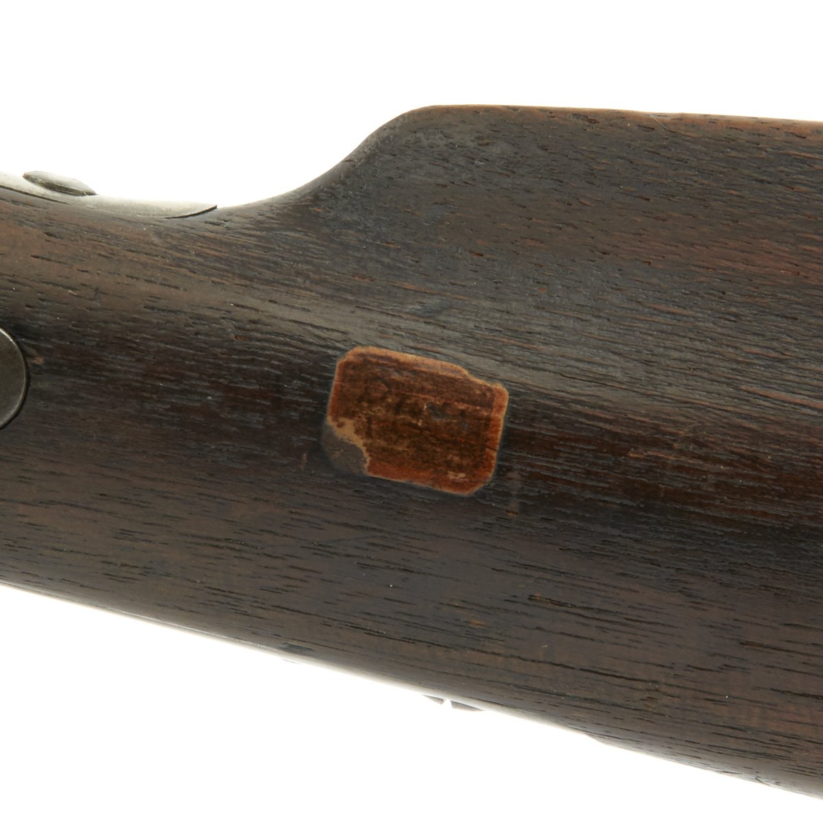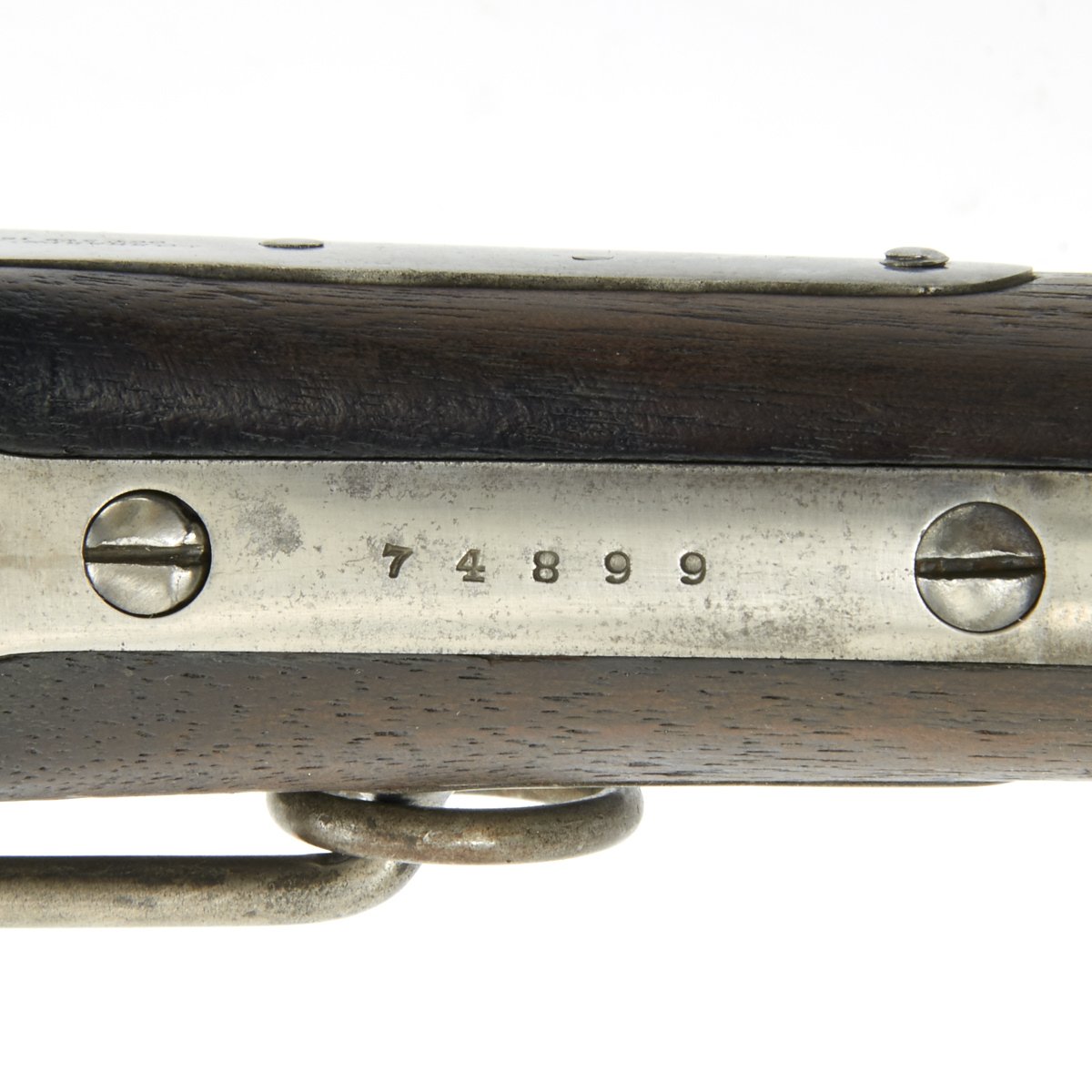 There were approximately 60,000 of this model made, serial numbers 71235 to 99999, and then second series C1 to C49528. This example was made very early in the production, so it was most likely made in 1863. The walnut wood stocks are in very good condition, with the expected chips and dents from use and age. There do not appear to have been any wood repairs made. The butt plate is in the correct 1863 configuration, with no patch box.