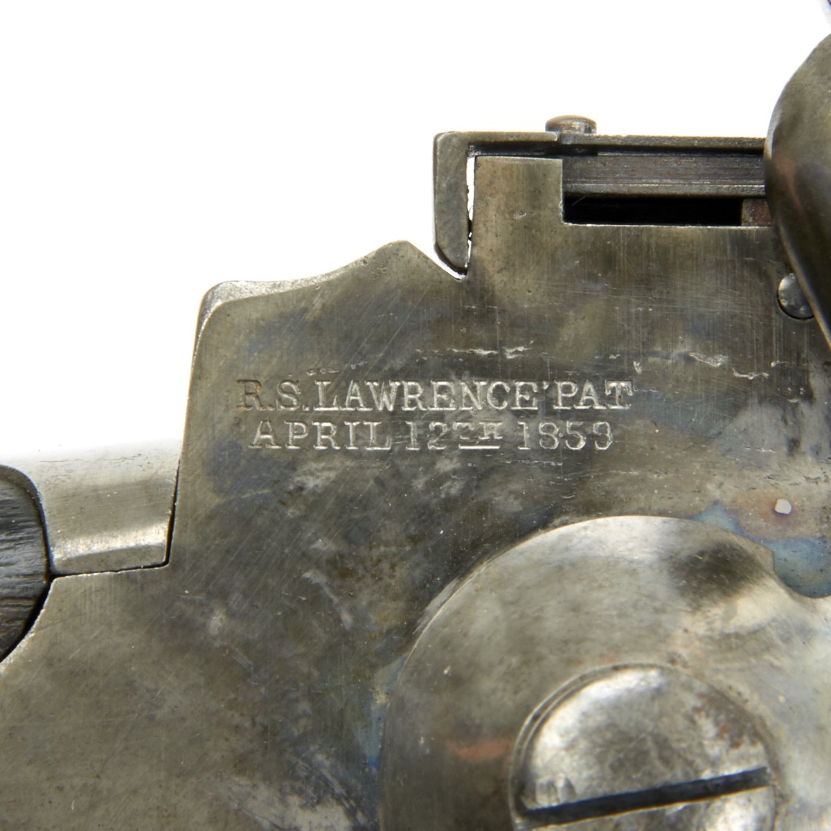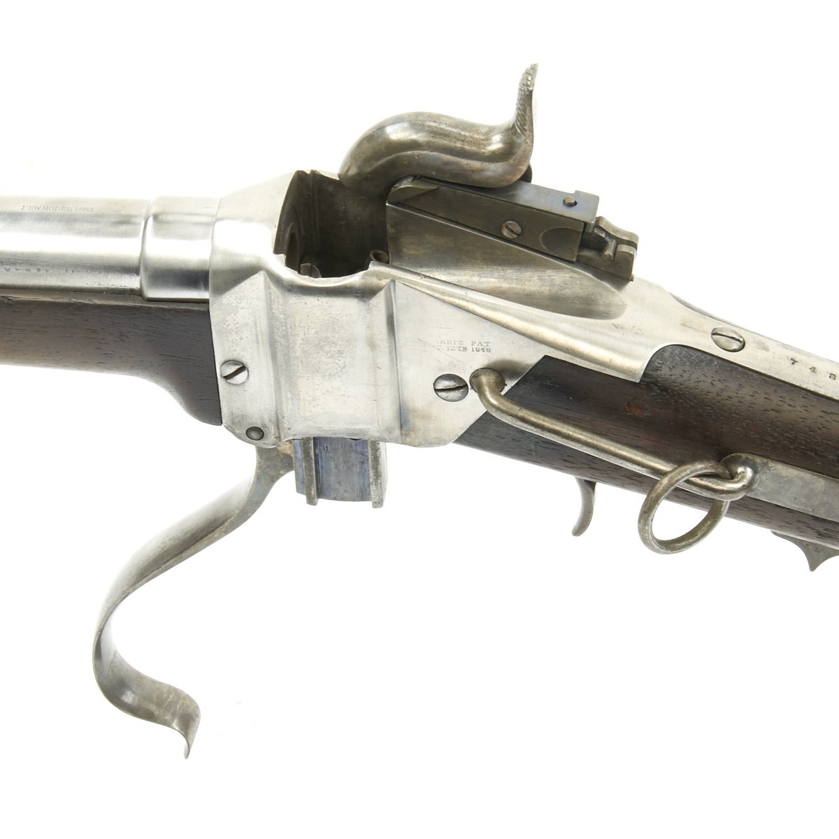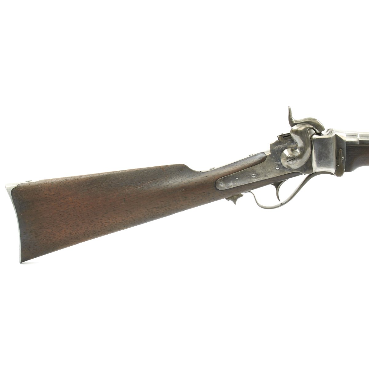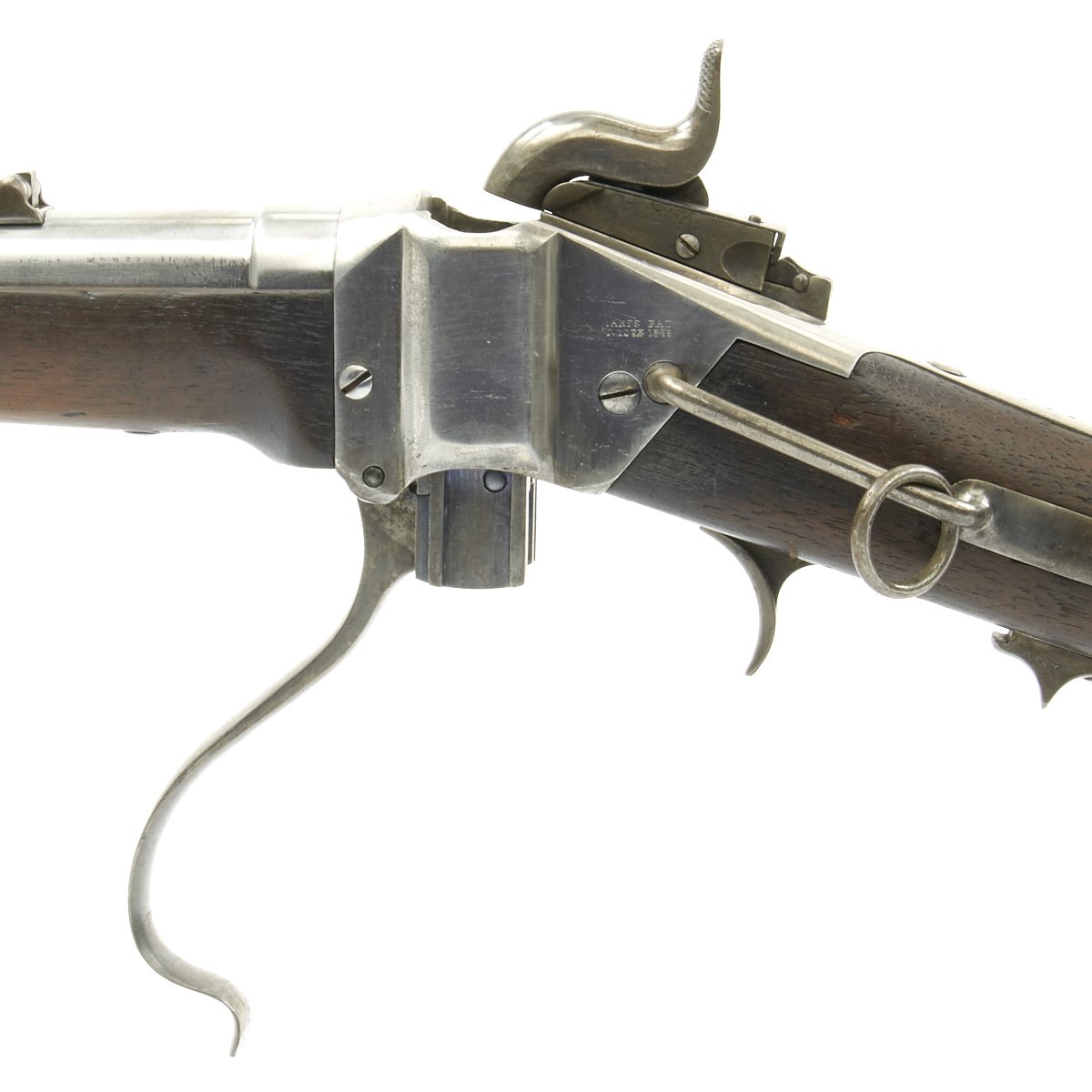 The New Model 1863's were made without patch boxes, a wartime procedure to do away with extras. It has a 21 1/2-inch barrel, measures 37 1/2 inches overall, and has a two- piece walnut stock. The barrel and, on some, the buttplate were blued. The frame, lock, and barrel band were casehardened in mottled colors. The fact that the Confederates manufactured copies of the Sharps carbine in Richmond, Virginia, in quantity testifies to its general popularity. This carbine was based on Christian Sharps' patents of 1848 and 1852 and on Richard S. Lawrence's patents of 1859.