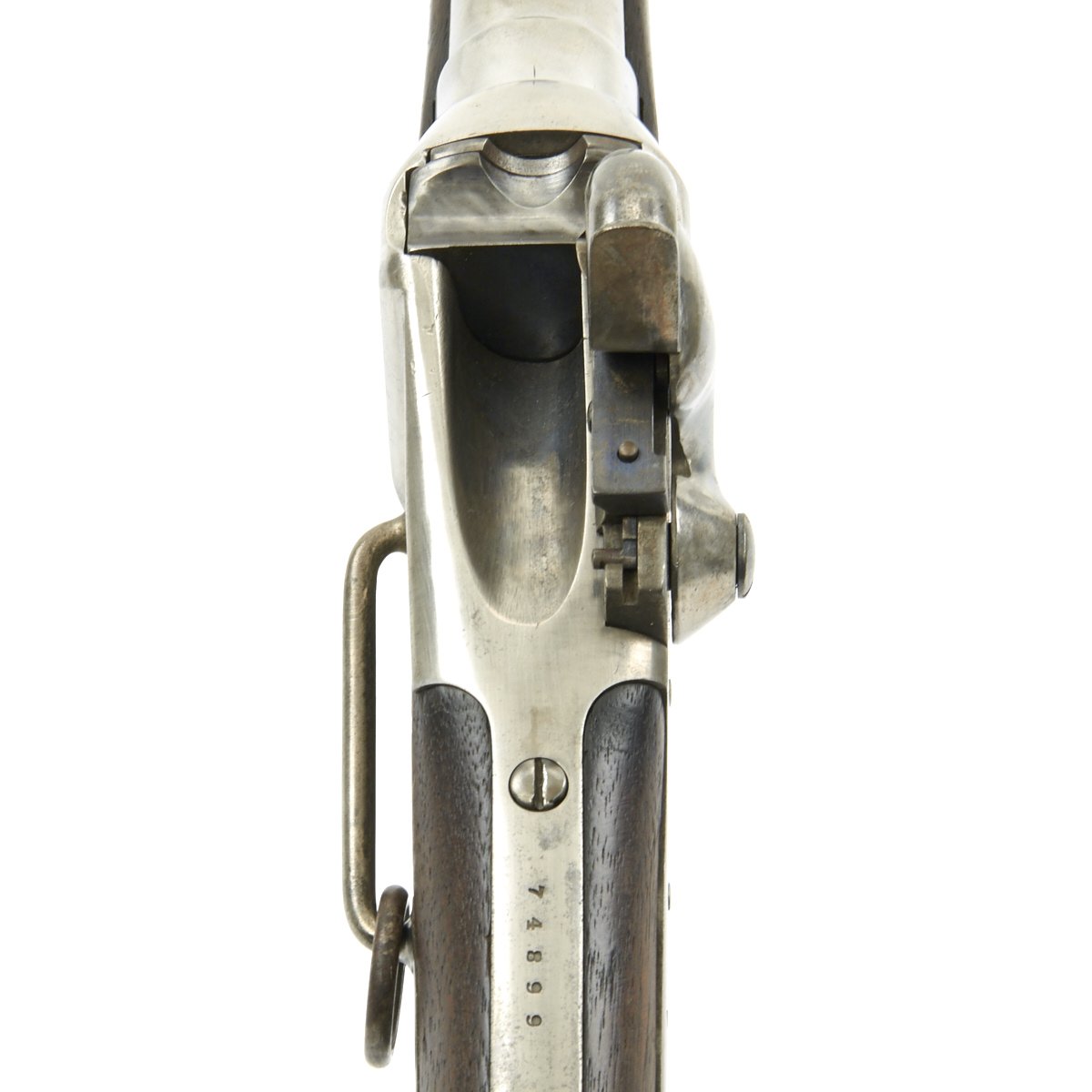 Original Item: Only One Available. This is an excellent stunning example of an original New Model 1863 Military Vertical Breech Carbine in .52 caliber, serial number 74899. This features a later version of the Sharps action with an improved gas seal and vertical breech. Has a nice bright polished finish on most the metal components, with a few traces of past pitting. Bore has clear lands and grooves, with a mostly bright finish.