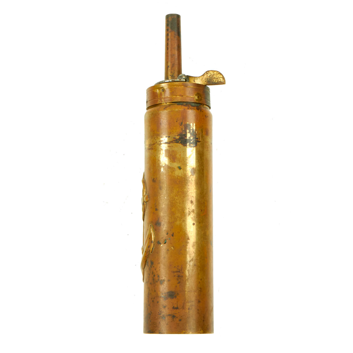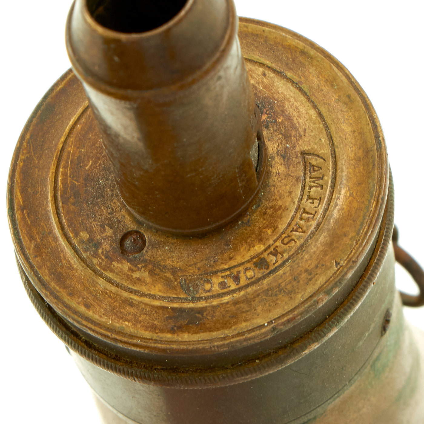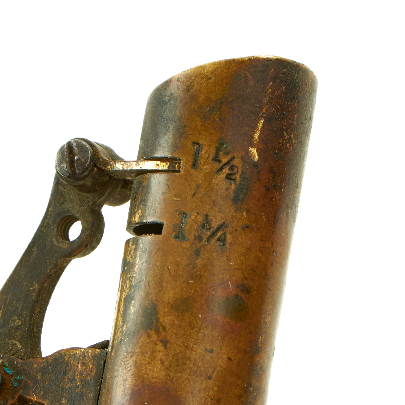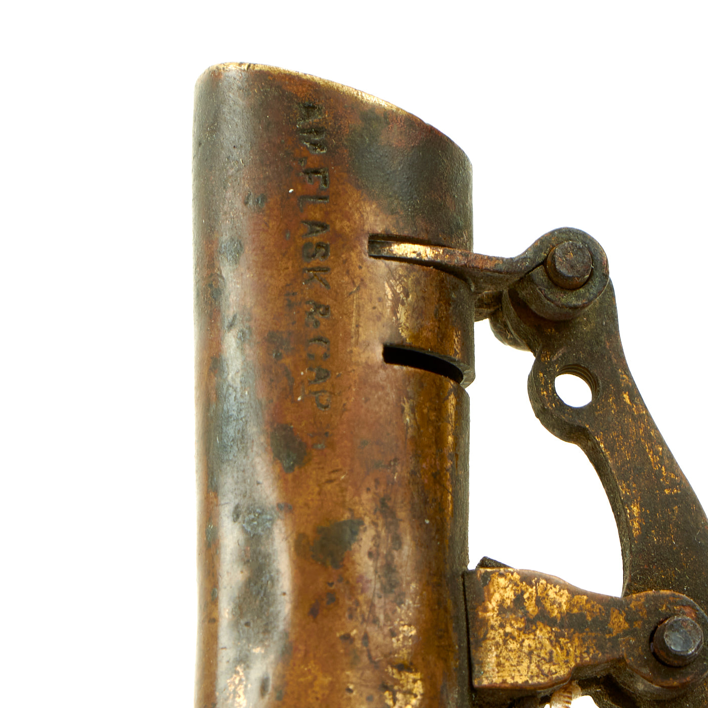 The flasks still have a functional stopper as well as a functioning charger head. The brass English Style Shot Flask charger head has a quick cut-off gate, operated by a side lever, which is marked to throw 1-1/2 and 1-1/4 volume of shot. The brass charger head is easily unscrewed from the brass neck and even still has lead shot inside!