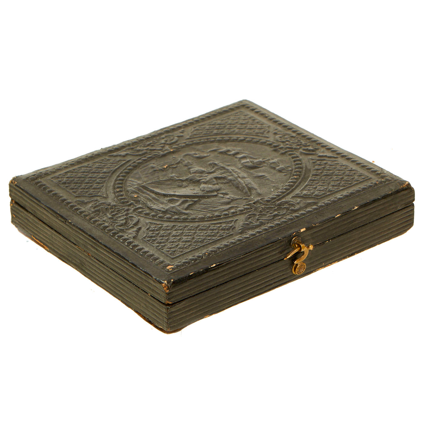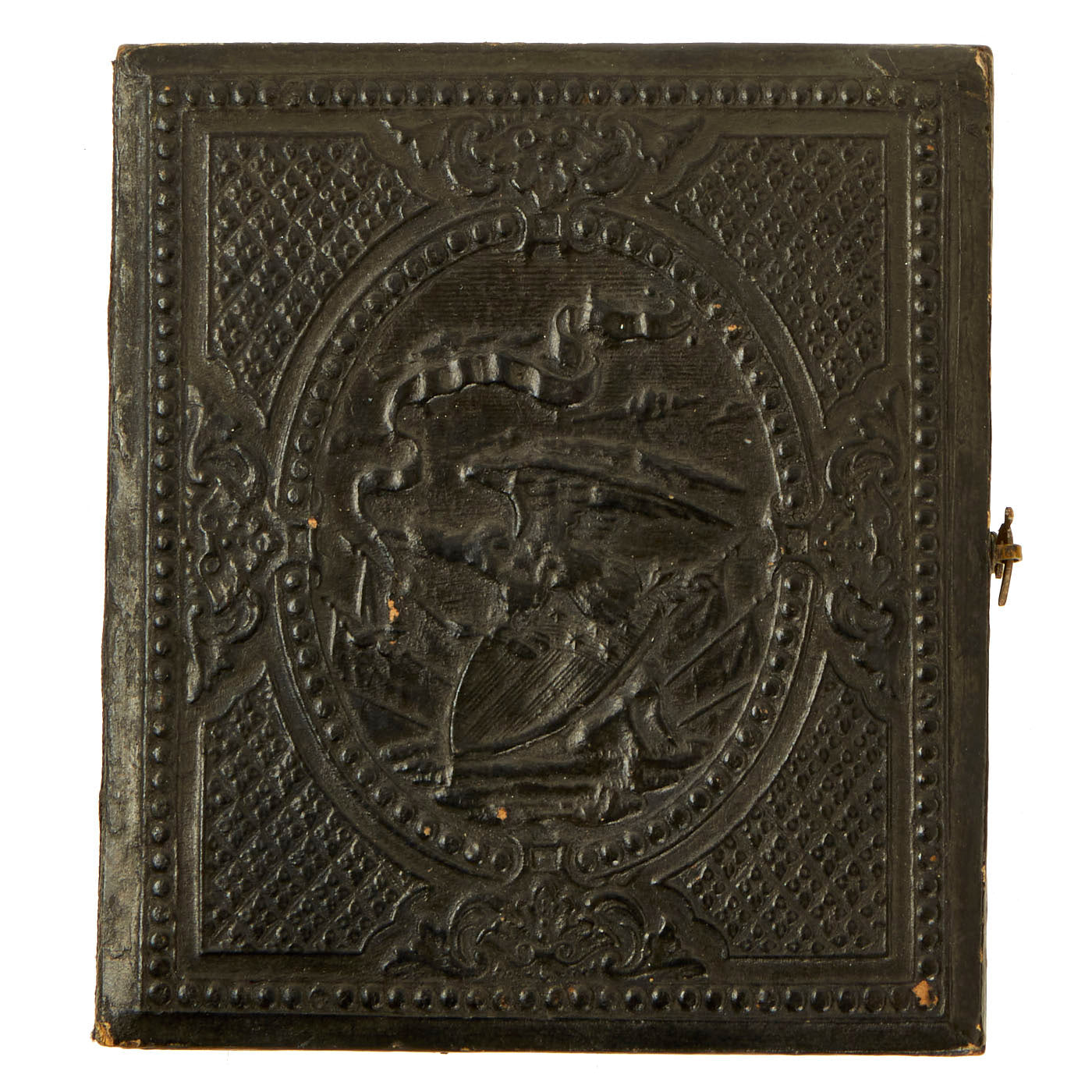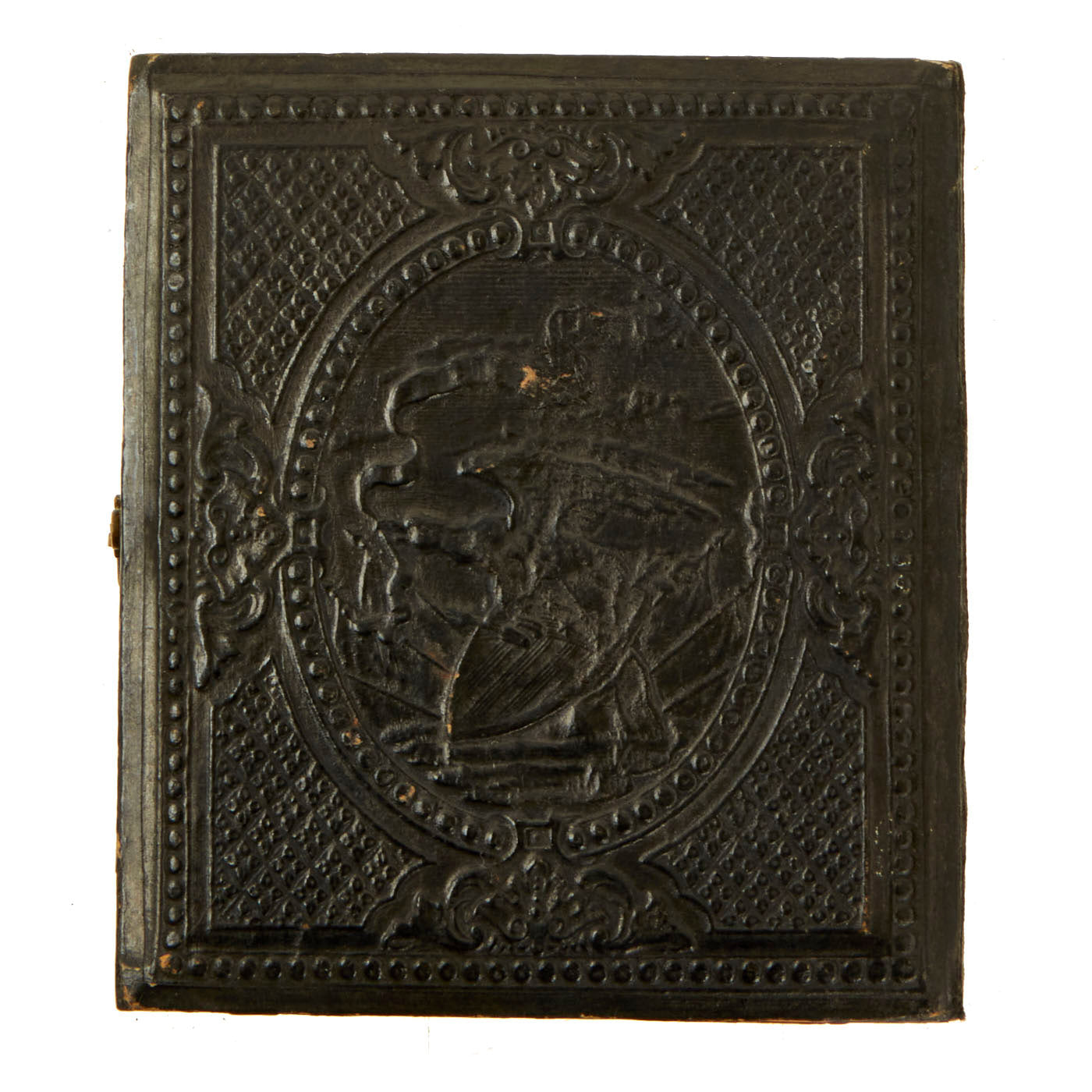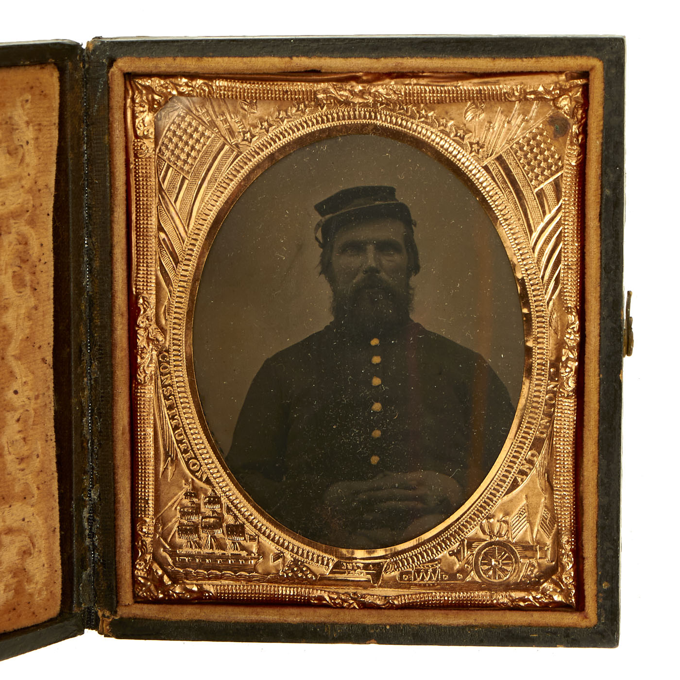 The image is behind glass held in an ornate brass mat loaded with intricate designs edging the tintype. A leatherette case molded front and back with decorative patriotic designs completes the piece. Interior of the case is lined in velvet type material. The hinges and locking mechanism are still present and fully functional.