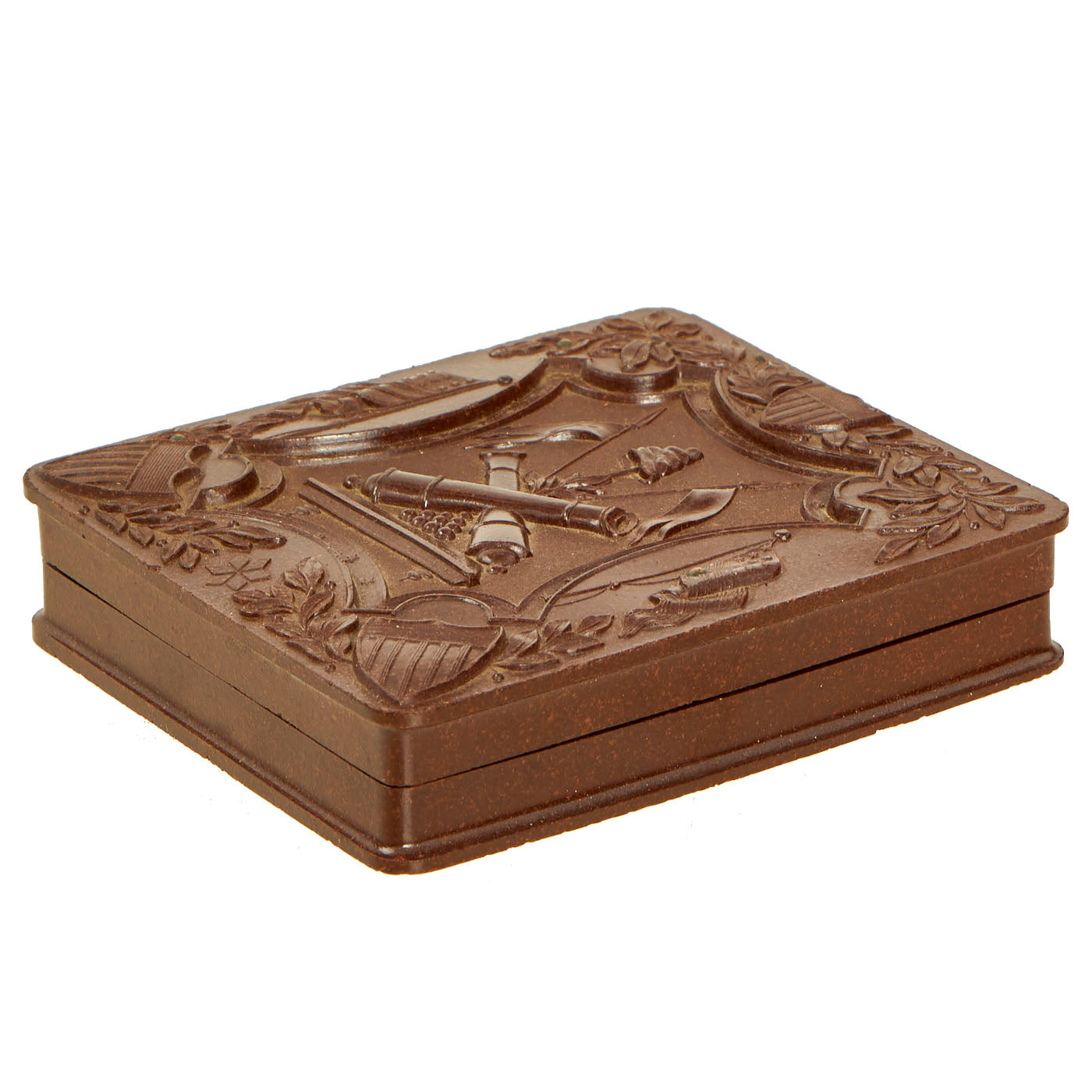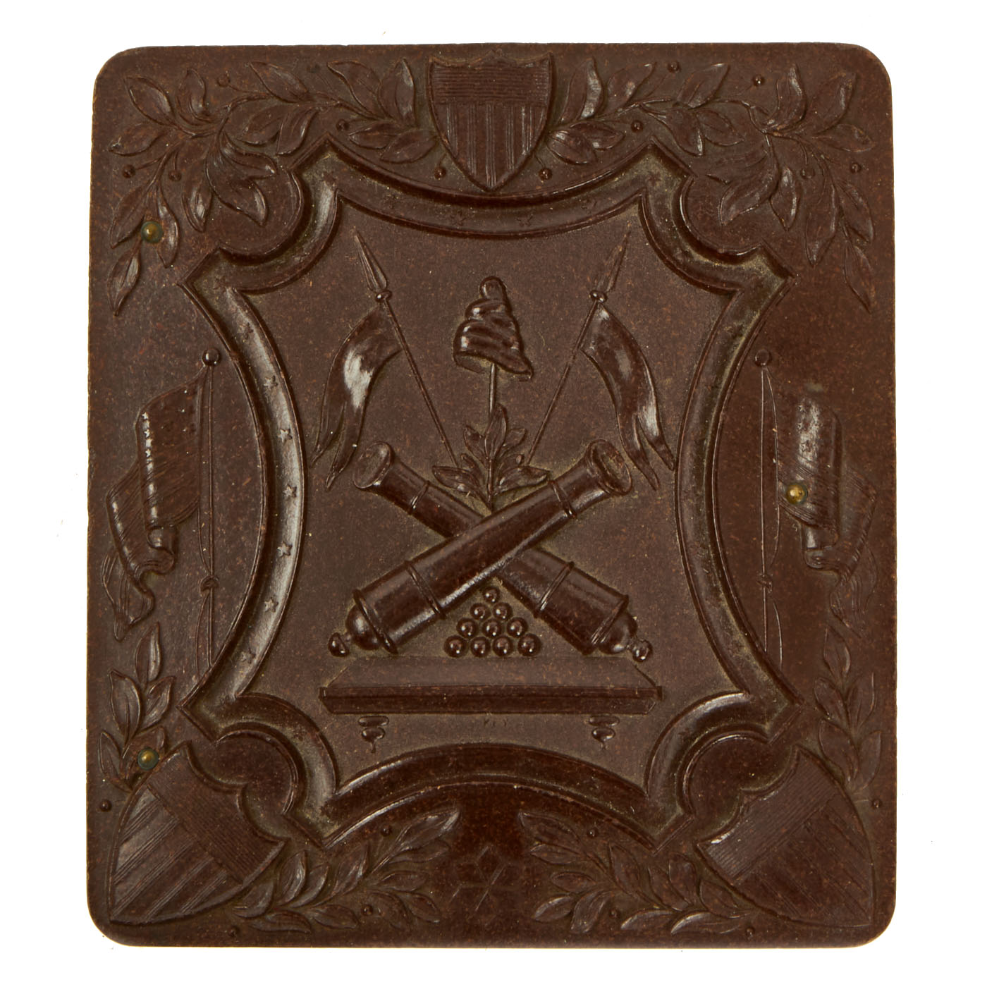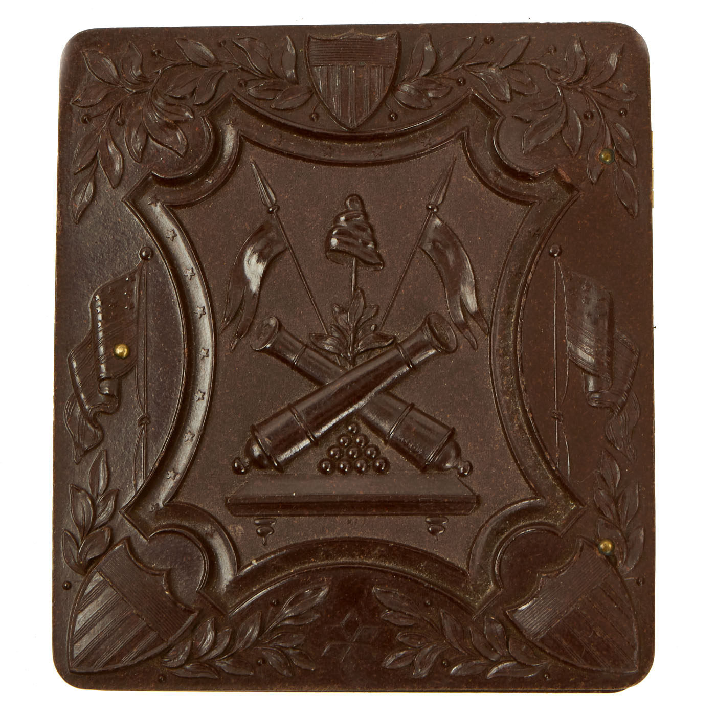 The image is behind glass held in an ornate brass mat loaded with intricate designs edging the tintype. A gutta-percha case molded front and back with decorative designs of artillery cannons and Federal Shields completes the piece. Interior of the case is lined in velvet type material. The hinges and locking mechanism are still present and fully functional.