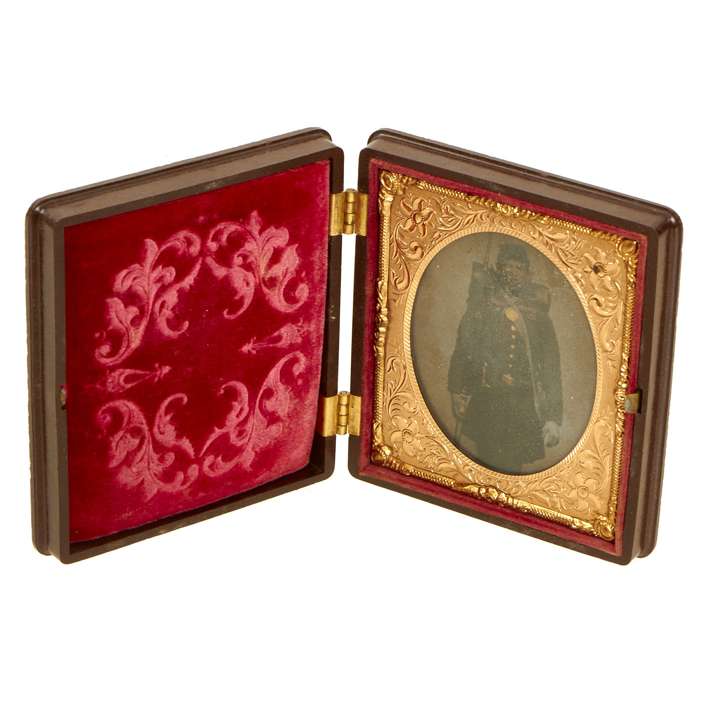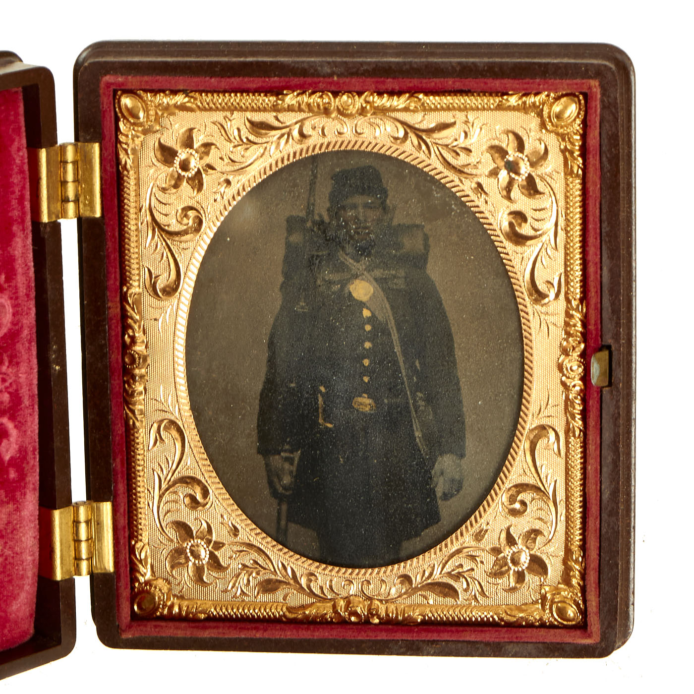 Original Item: Only One Available. Everything about this image, including its presentation, makes it a splendid memento of the Civil War. This Civil War cased "Sixth Plate" (2.75 x 3.25 inch) tintype portrait shows an unidentified solider. He wears a bummer hat or kepi and a standard nine-button frock coat of northern Federal or Union issue. He is equipped with a Sharps Rifle and Saber bayonet. We believe this soldier to be a member of one of the two regiments of sharpshooters, know as the “Berdan Sharpshooters”.