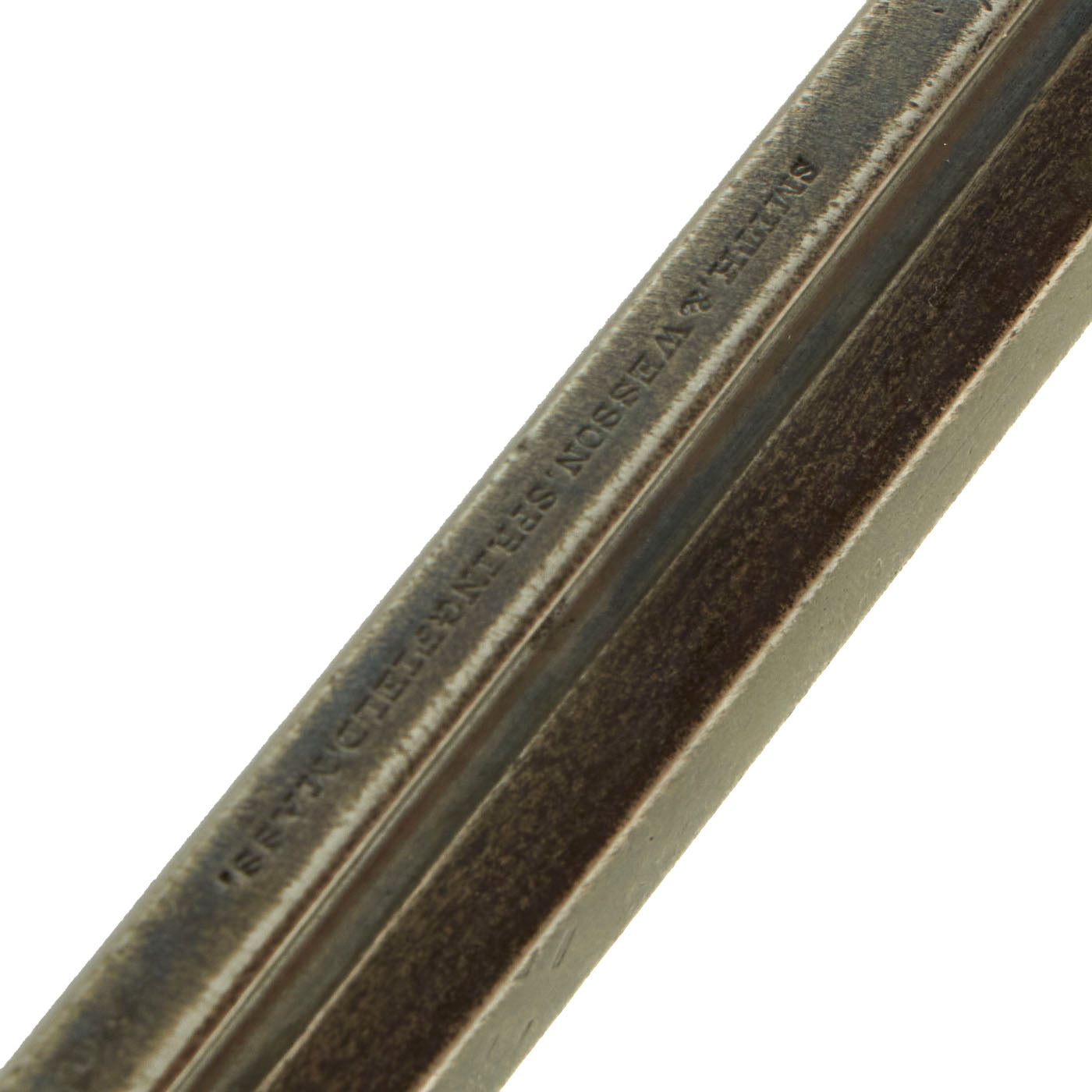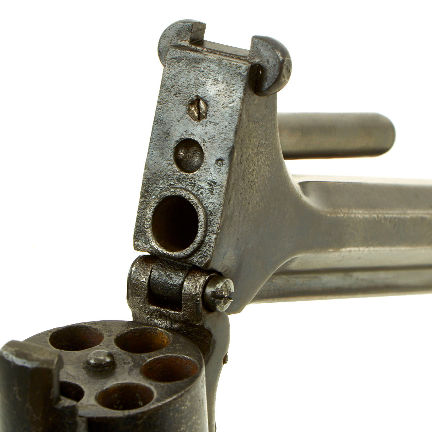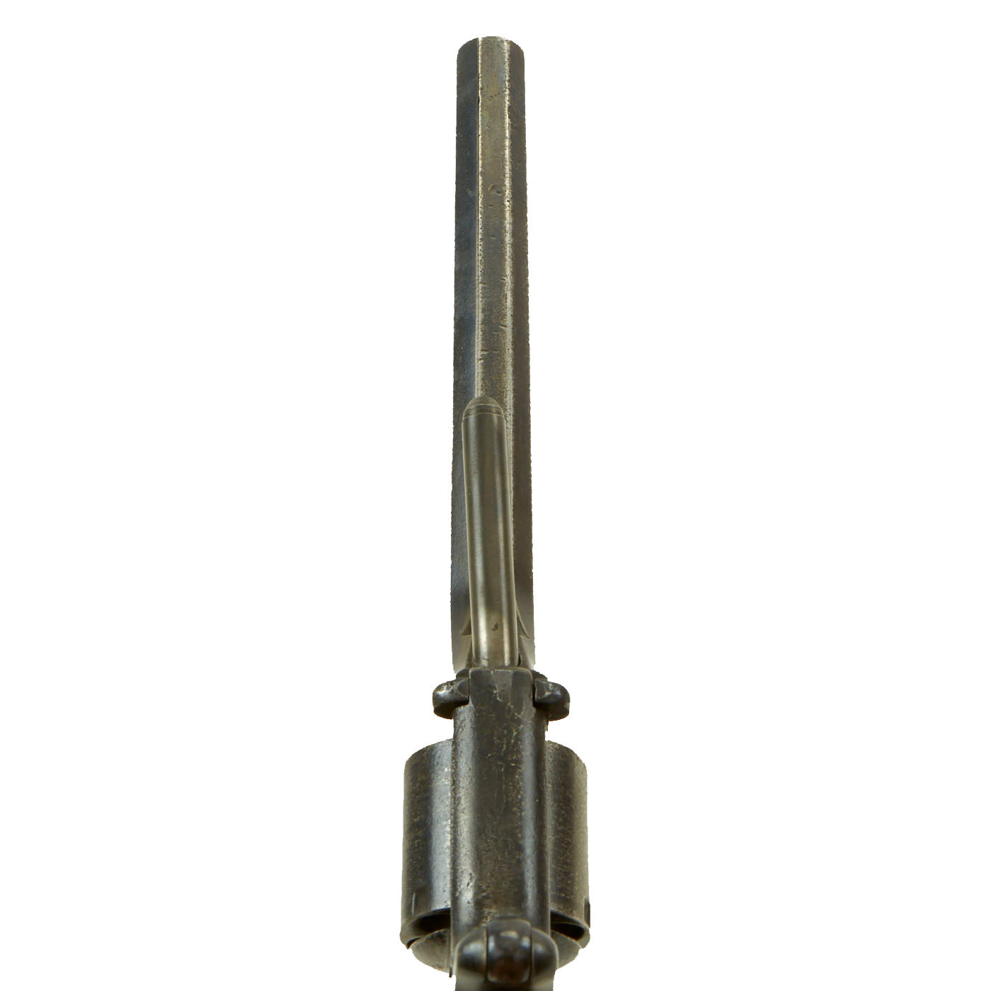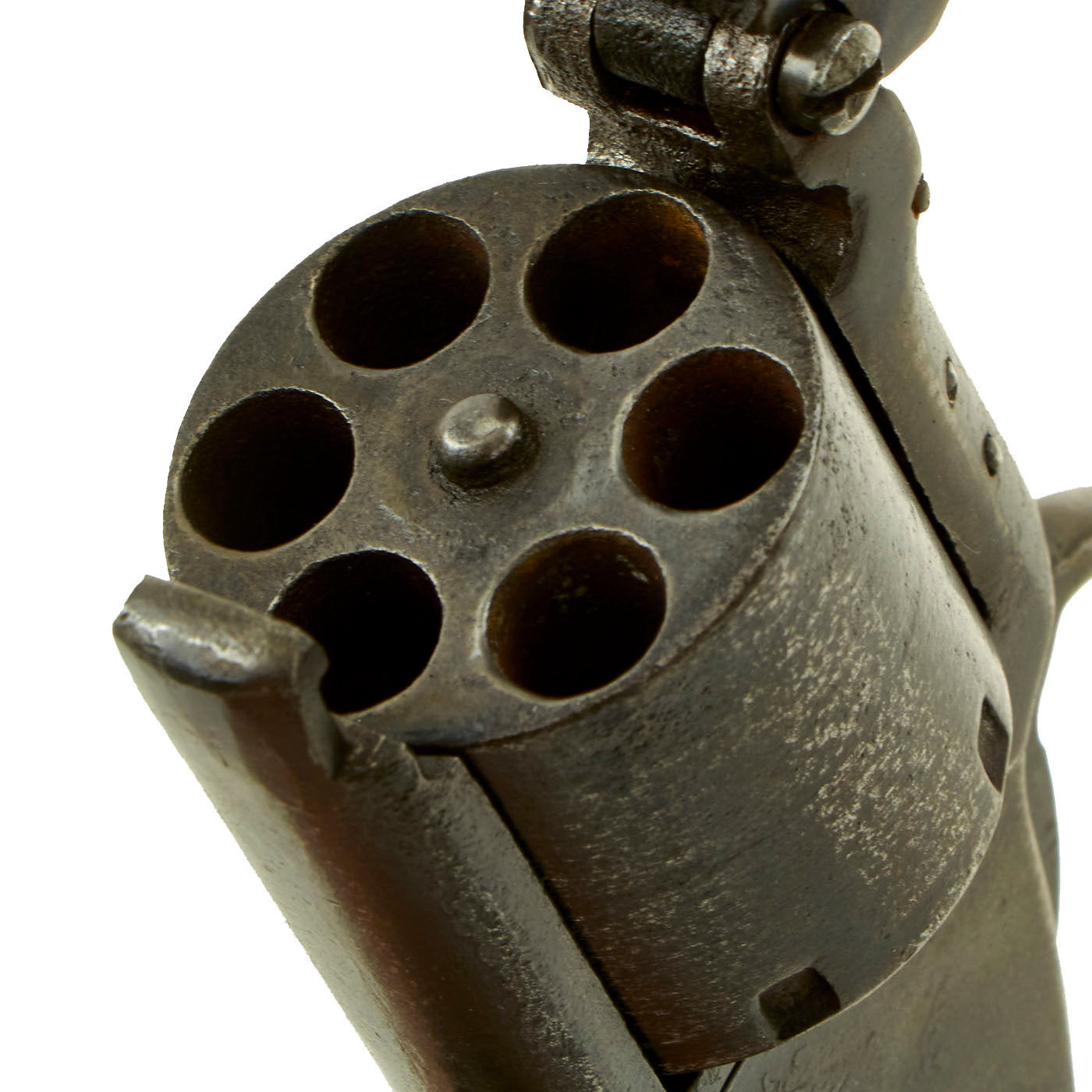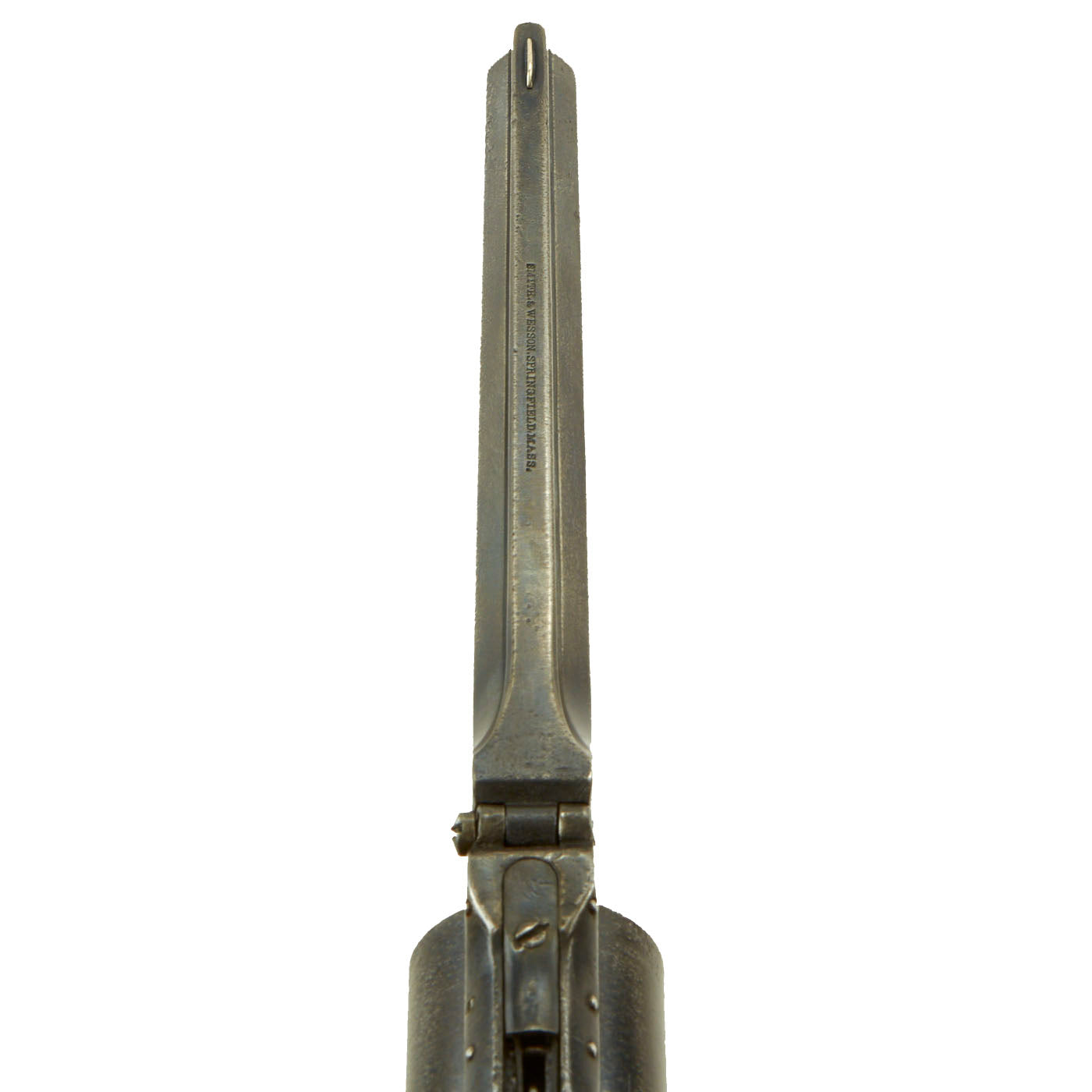 Due to the long service this example saw, it unfortunately does not cycle at present, as the hand does not engage the cylinder ratchet due to wear. The cylinder stop / rear sight on the top strap is broken off to the rear of the third frame pin as well. The bore is in good condition, with clear lands and grooves and a partly bright finish. There are a few spots of fouling and oxidation.