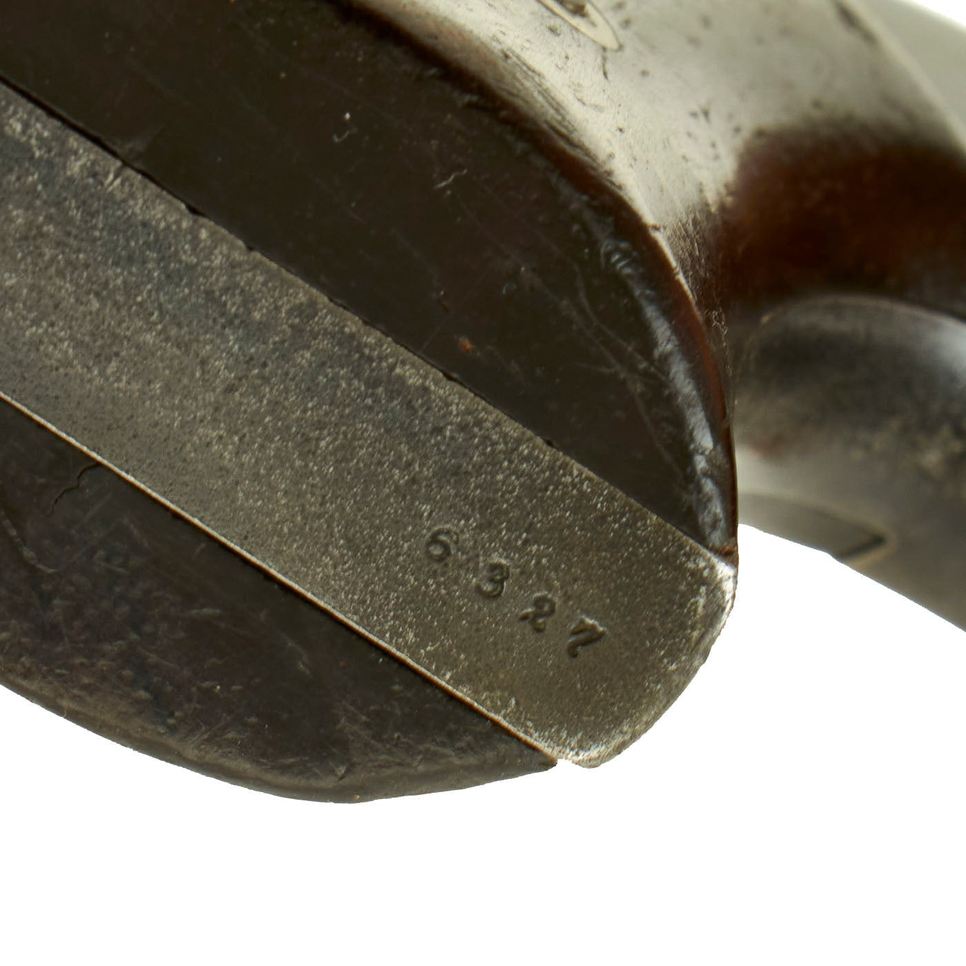 The patent information on the cylinder has completely worn away, as is usually seen on early examples such as this. It also does not have any assembly number noted under the grip or elsewhere, which is correct for an early example such as this.