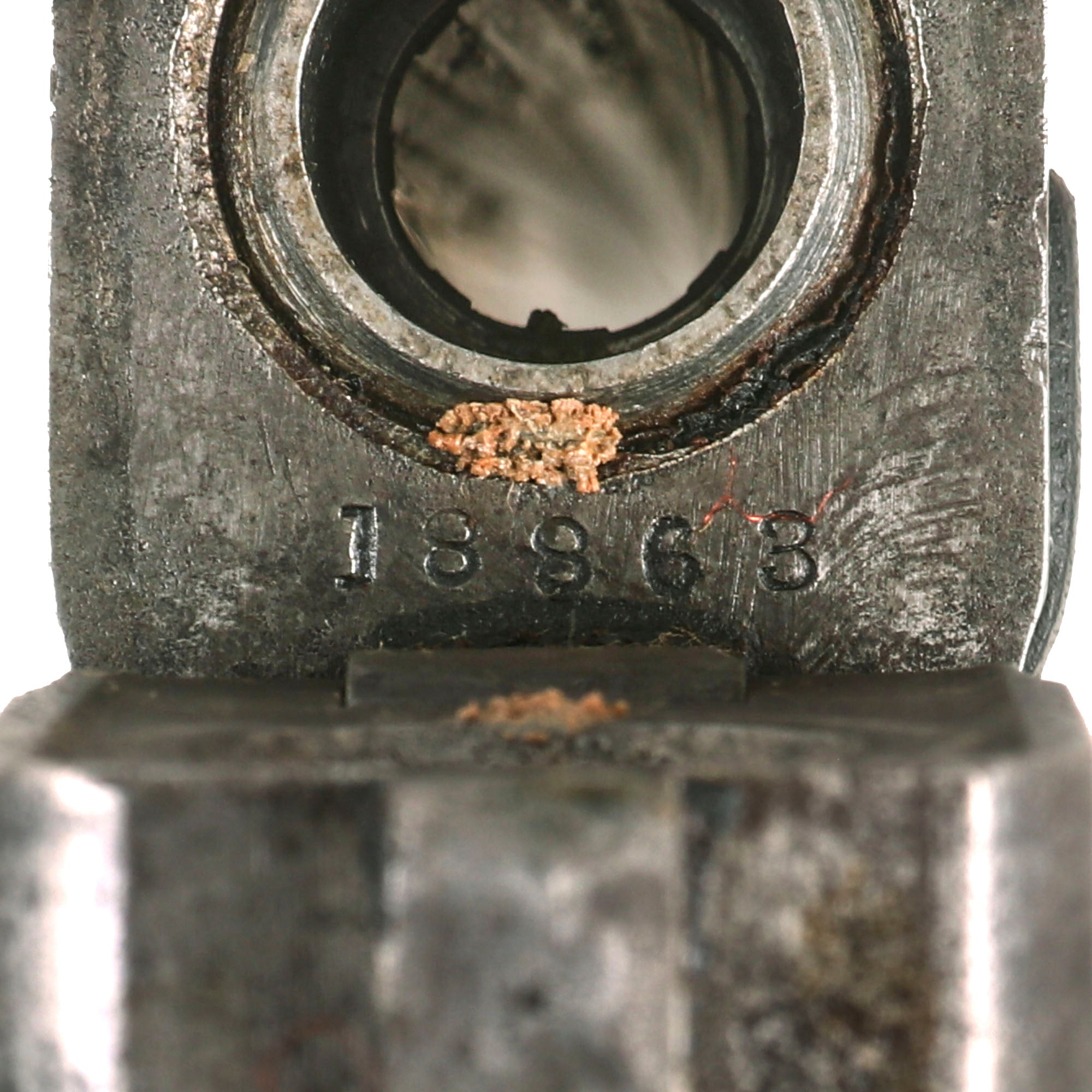 It also looks to have had some screws replaced with brass examples, and there is a hex screw on the end of the trigger guard. Most likely some parts were no longer serviceable, and were replaced during the modern era. The fore stock looks to be an arsenal spare, while the butt stock is original, and missing some wood near the receiver era. We can also see where some of the metal was peened a bit to give it a tighter fit.