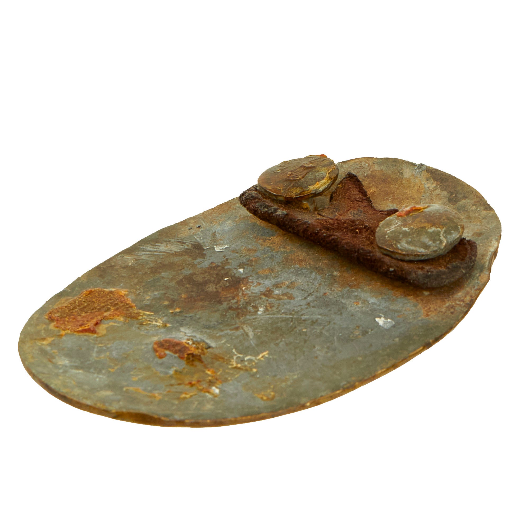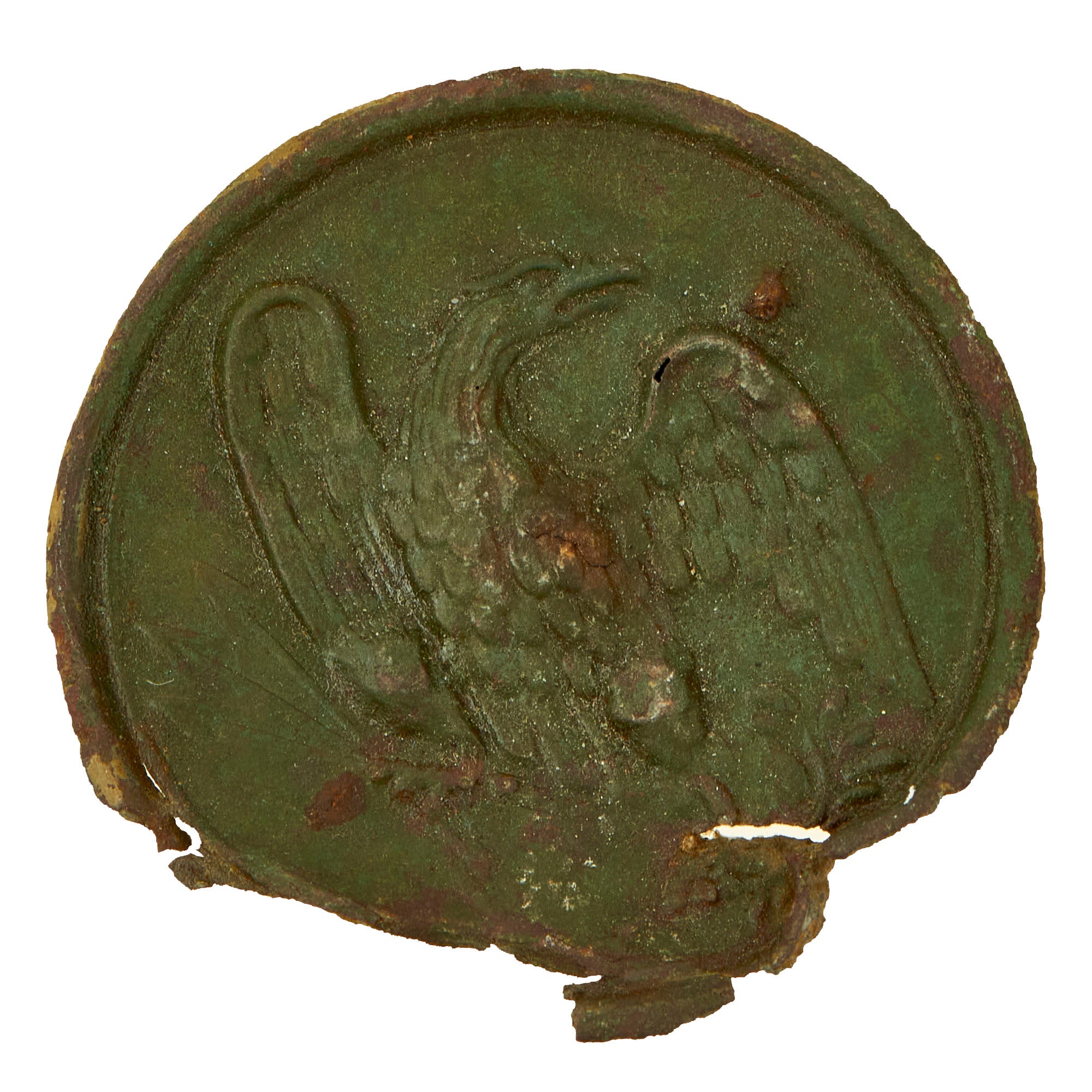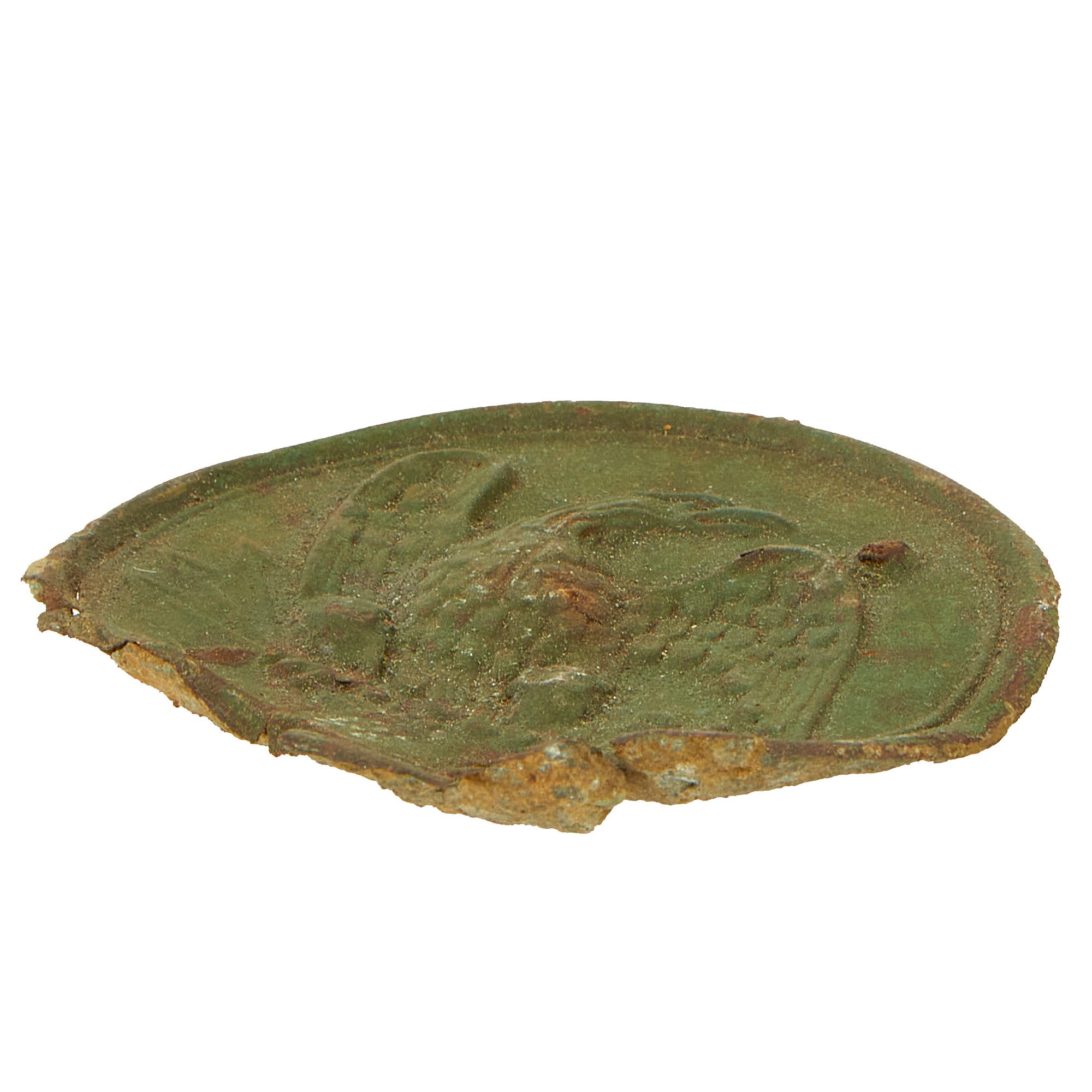 Cartridge Box Sling Eagle Breast Plate: Pattern 1826 Eagle Breast Plate with lead filled back. Both mounting loops are no longer present. The front brass face has fantastic crisp details and has aged wonderfully. It looks as if the plate was struck by something causing it to shatter and have this broken appearance.