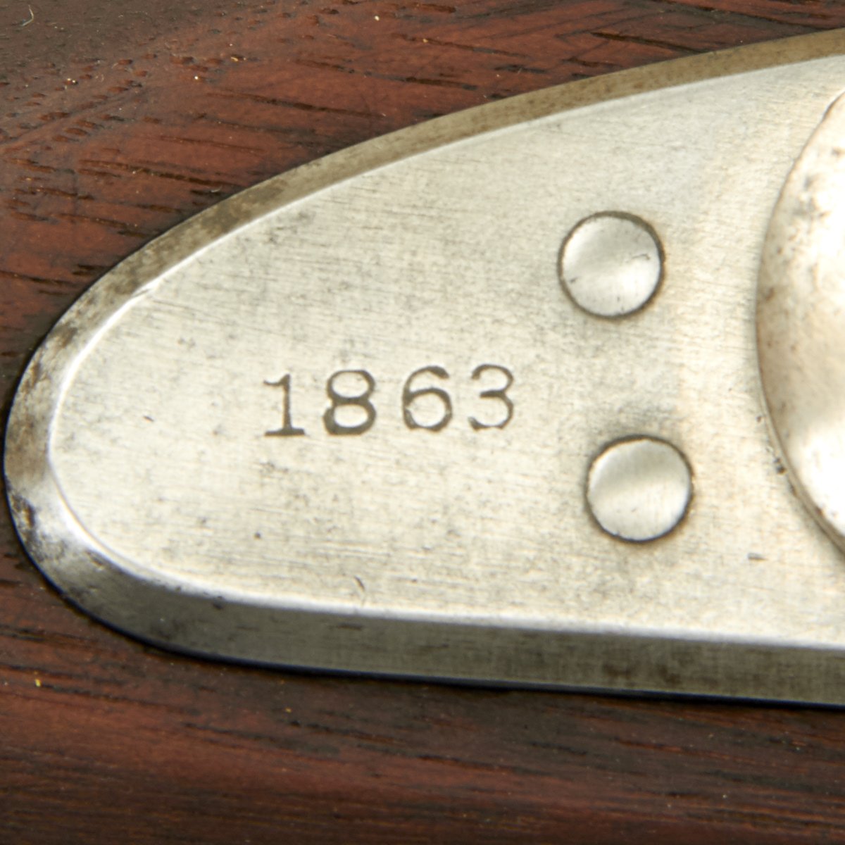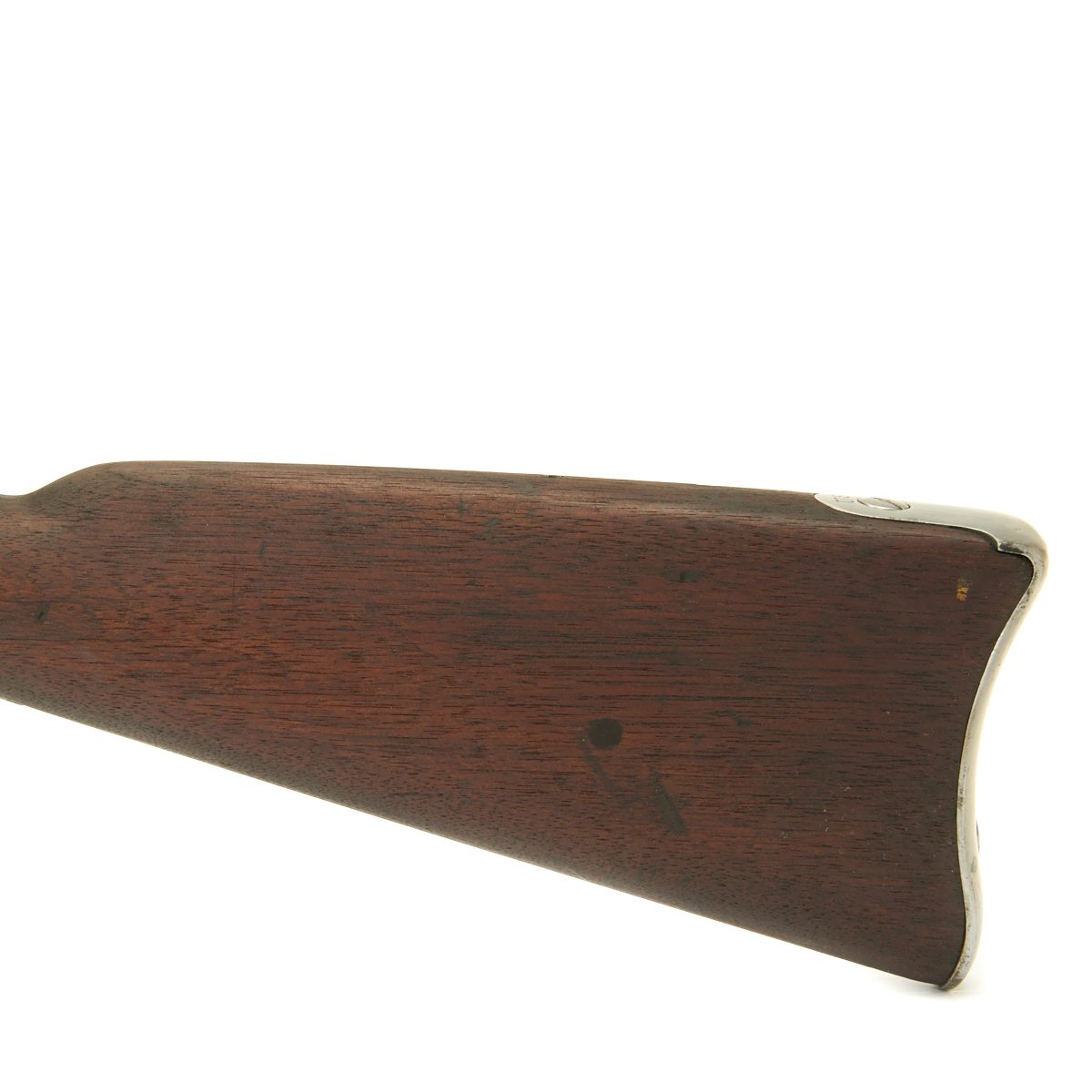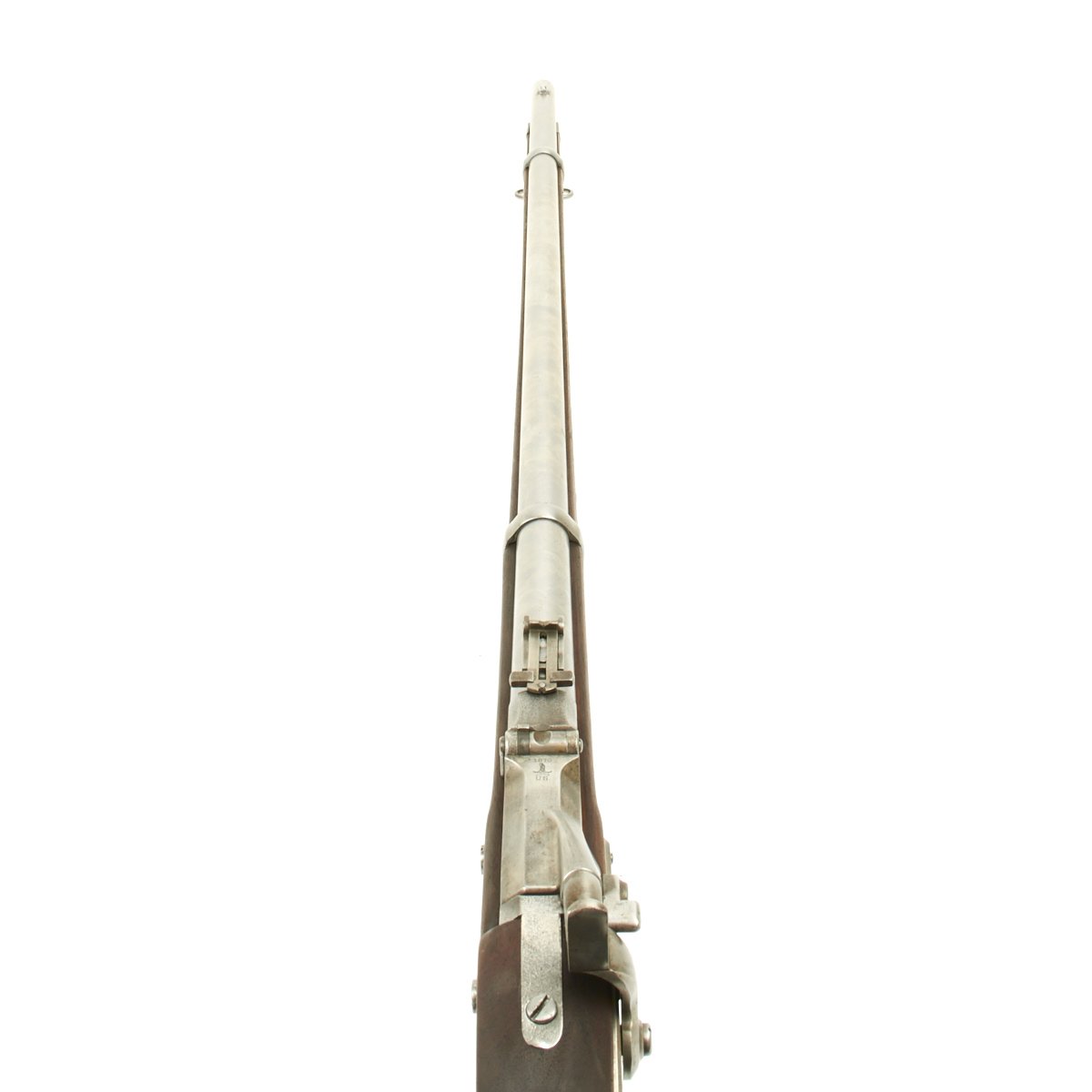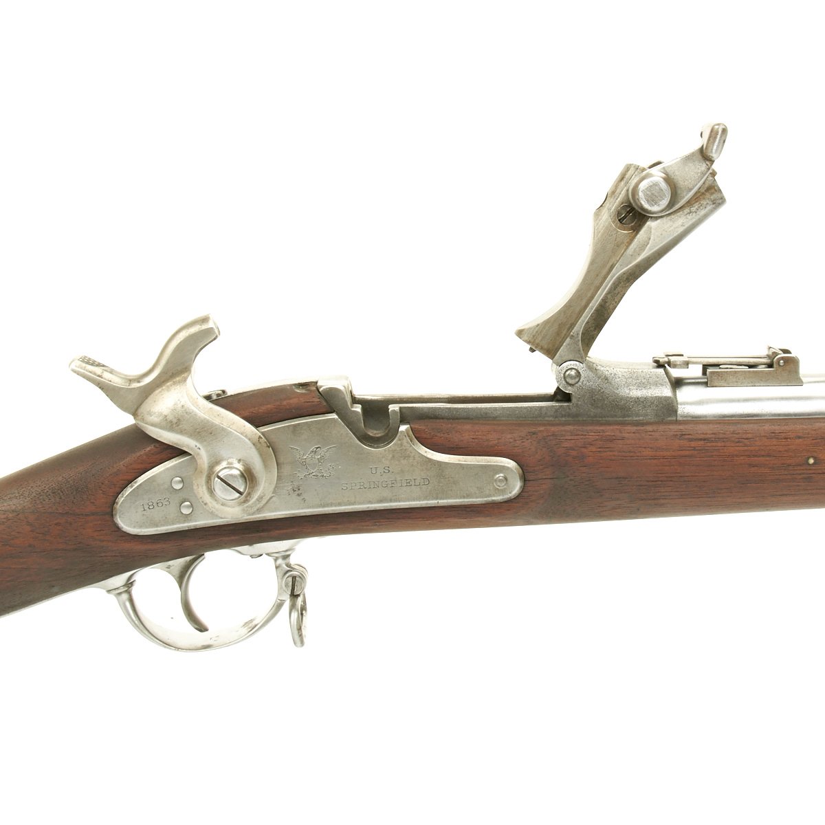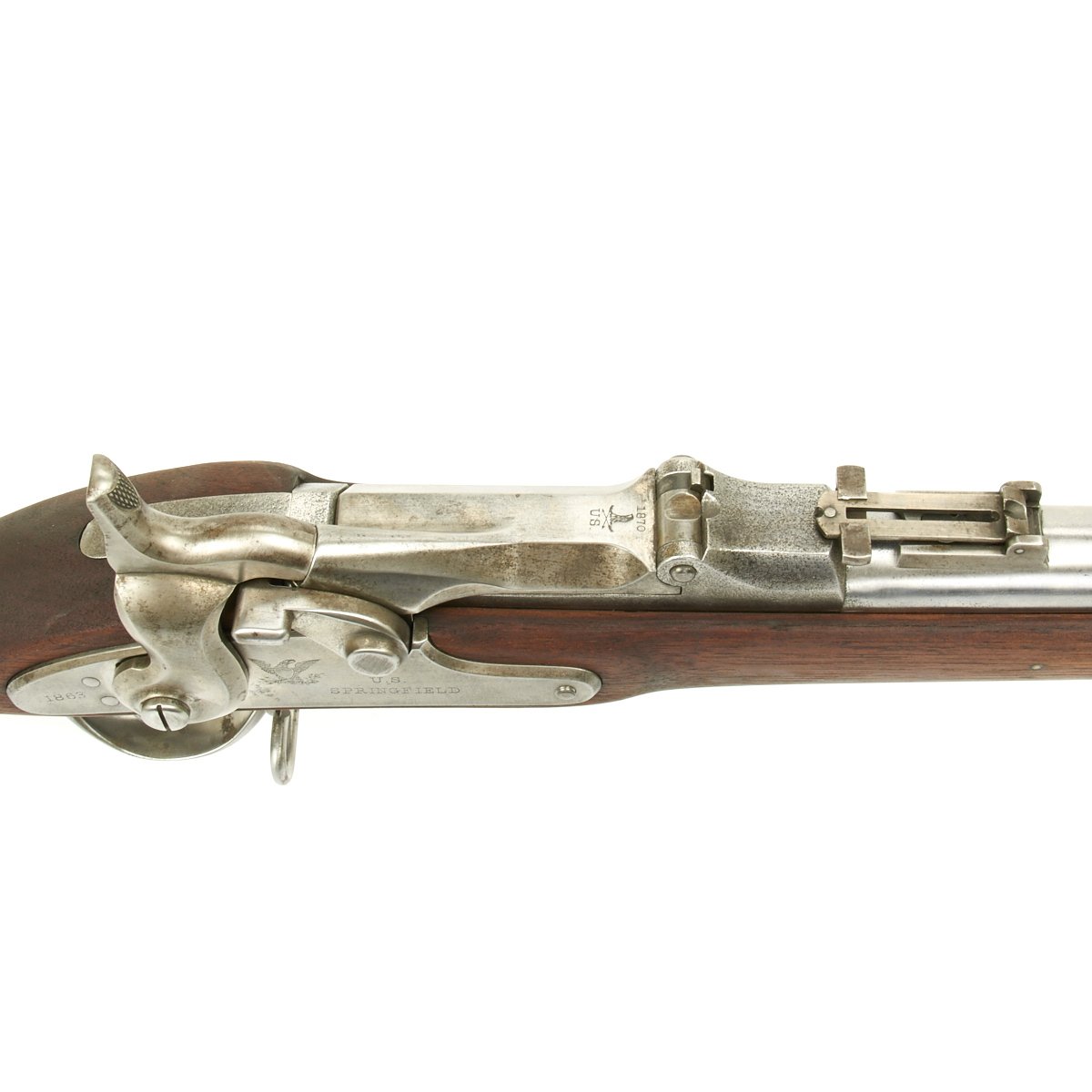 The butt plate is marked "U.S." and both barrel bands are "U" marked. Center fire breechloader, two bands, two sling swivels, standard sliding sight, and standard ramrod. Lock is marked with an eagle and U.S. SPRINGFIELD, manufactured by Springfield Armory, Springfield Massachusetts, and is marked 1863 on the tail of the lock plate.