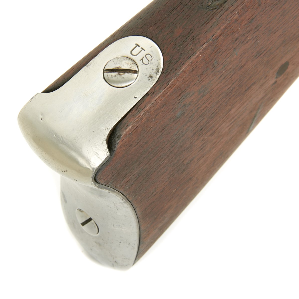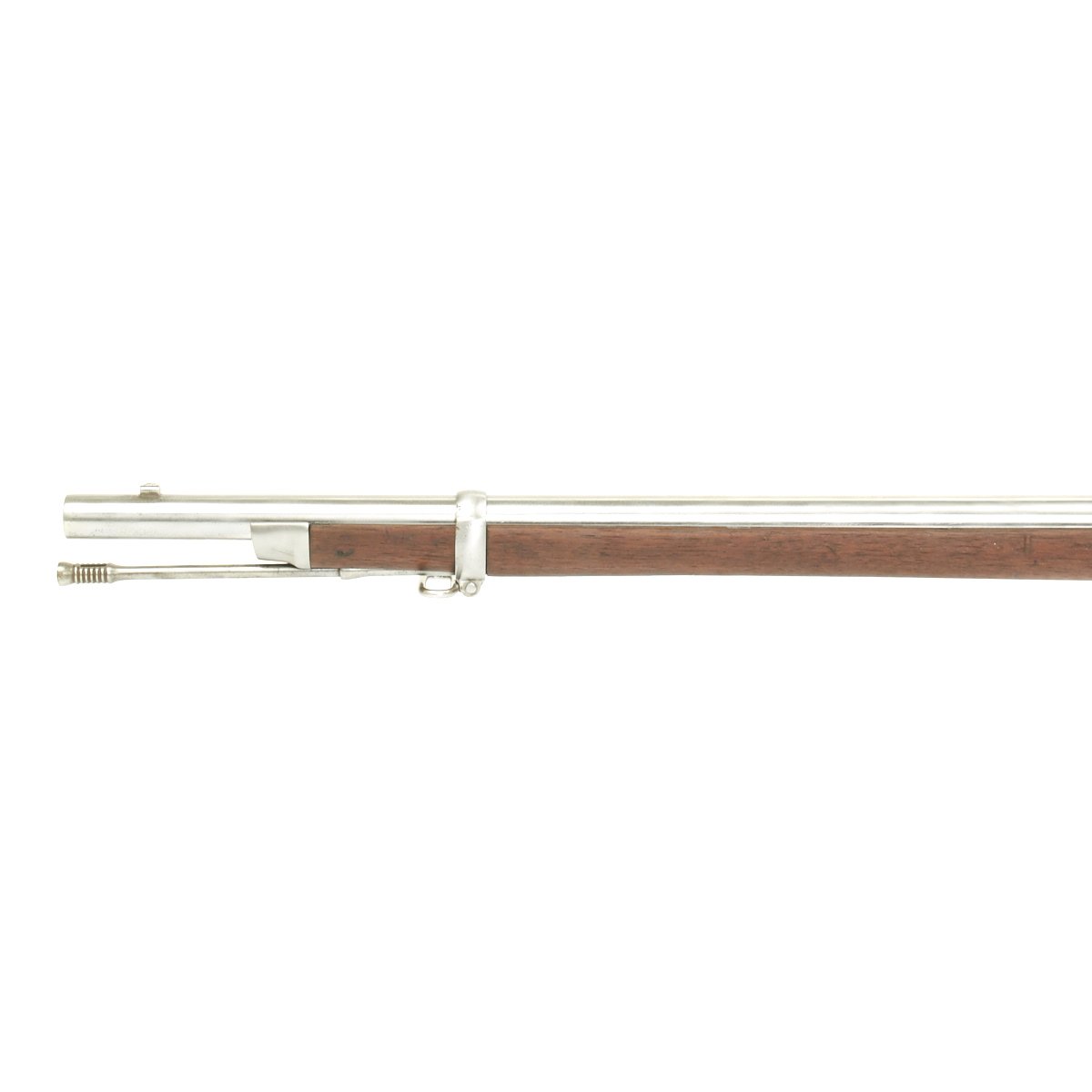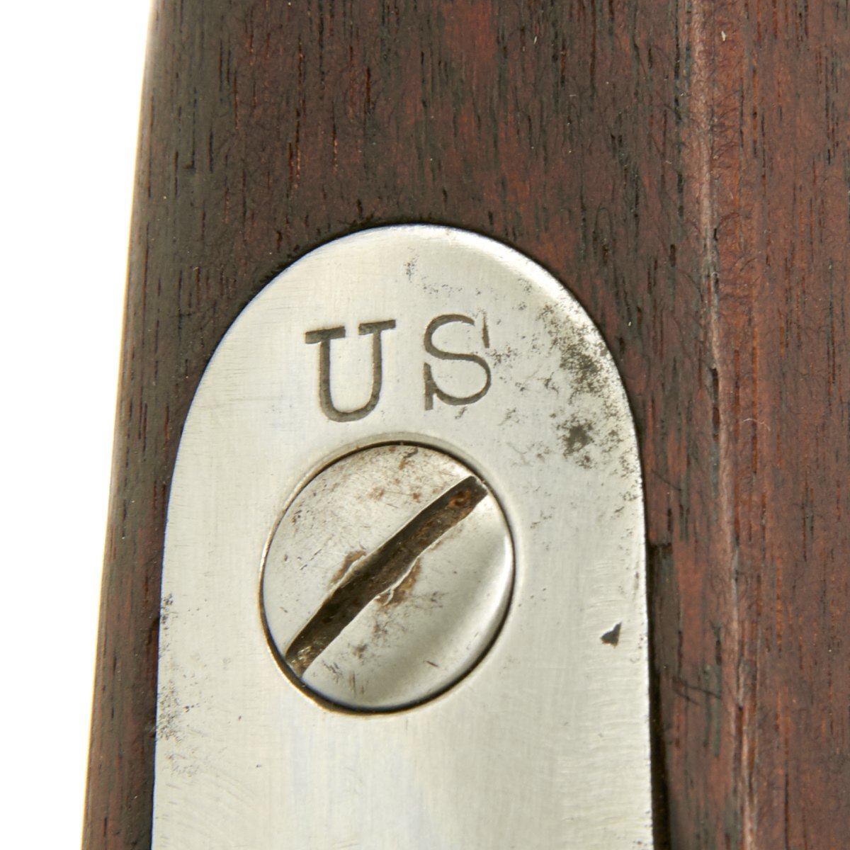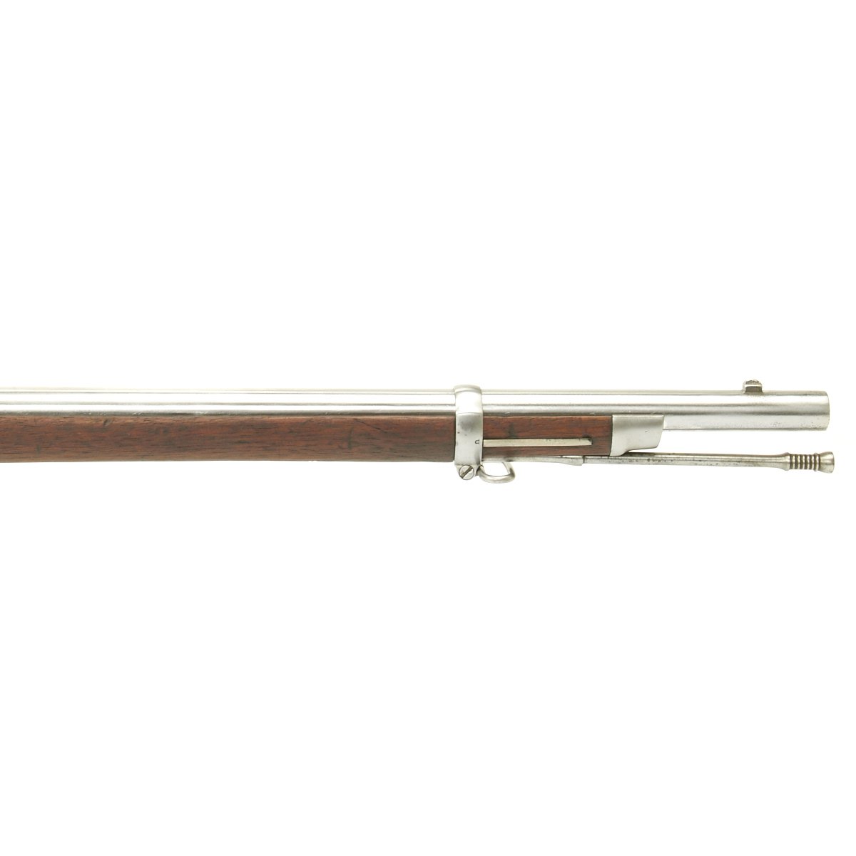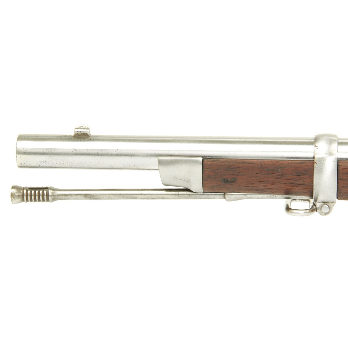 The butt plate is marked "U.S." and both barrel bands are "U" marked. Center fire breechloader, two bands, two sling swivels, standard sliding sight, and standard ramrod. Lock is marked with an eagle and U.S. SPRINGFIELD, manufactured by Springfield Armory, Springfield Massachusetts, and is marked 1863 on the tail of the lock plate.