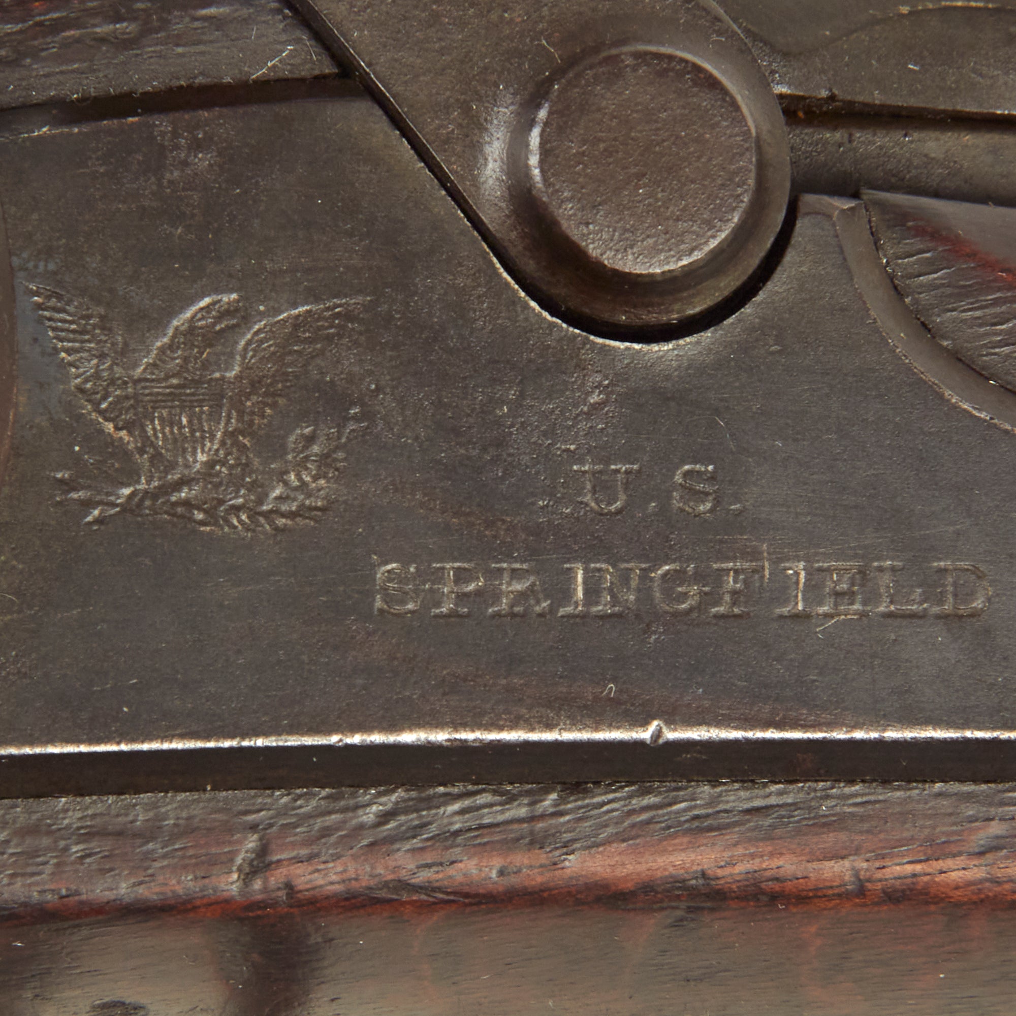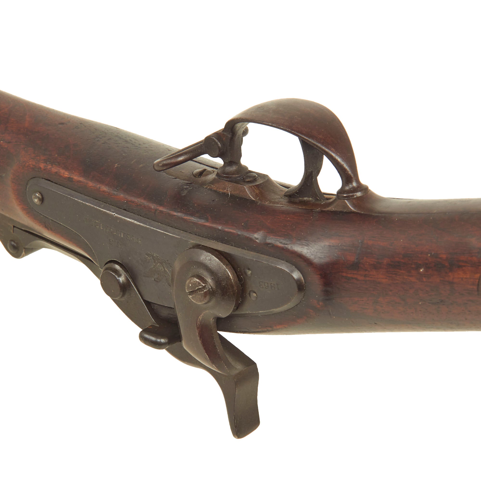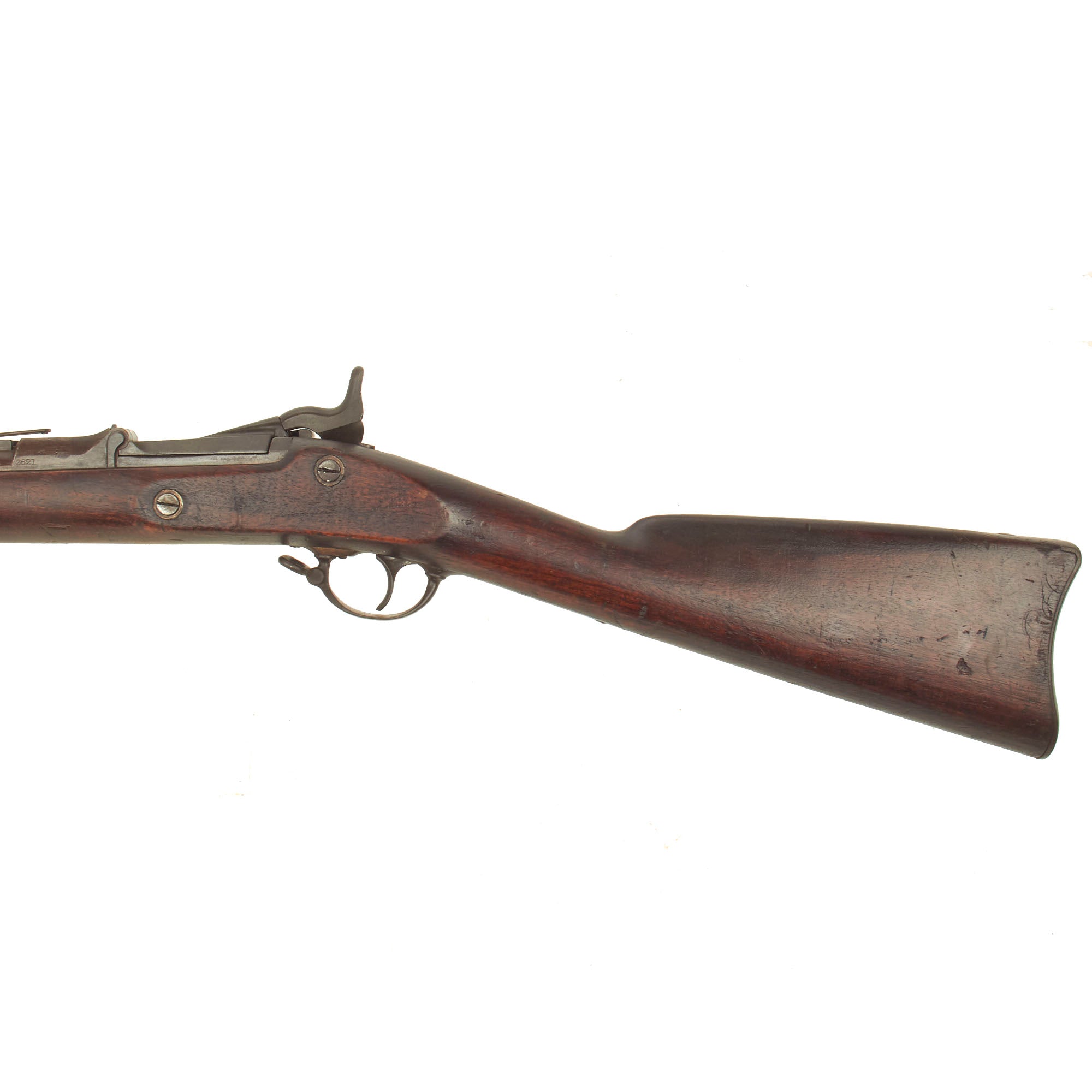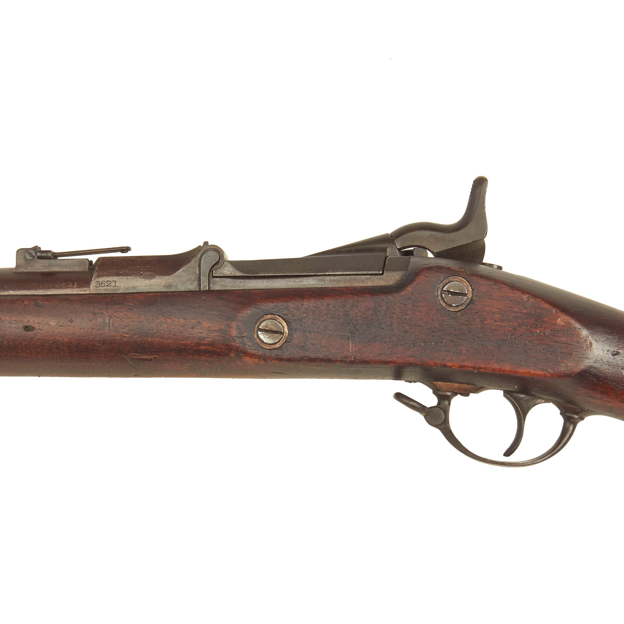 In very good condition, the lock is marked 1863 with an EAGLE next to U.S. / SPRINGFIELD, indicating production at the United States Armory and Arsenal at Springfield, in Springfield, Massachusetts. The Breech Block is marked 1870 with an Eagle head / Crossed Arrows / U.S. cartouche underneath, and the receiver and barrel breech are marked with serial number 3621 on the left hand side. There is also a faint ESA oval cartouche, for Erskine. S. Allin, Master Armorer at Springfield Armory from 1853 until his death in 1879, as well as the designer of the trapdoor system. In very nice condition this is a rare U.S. Military Rifle that led to the the legendary Model of 1873.