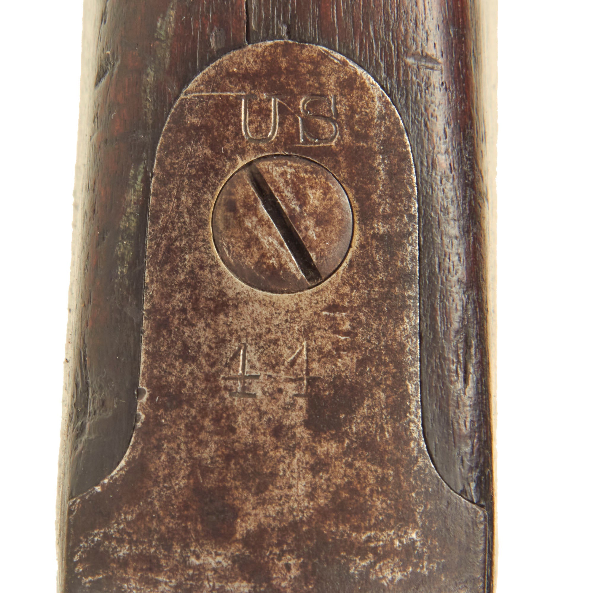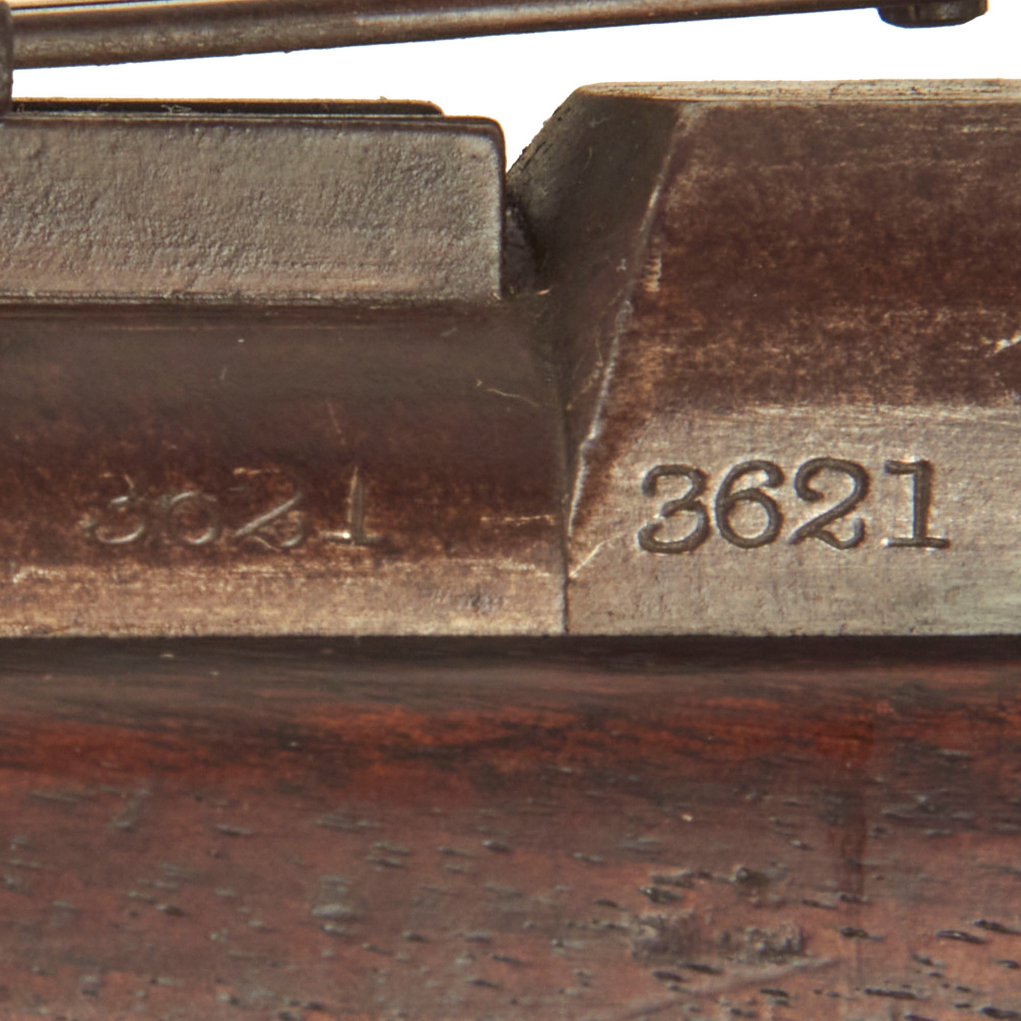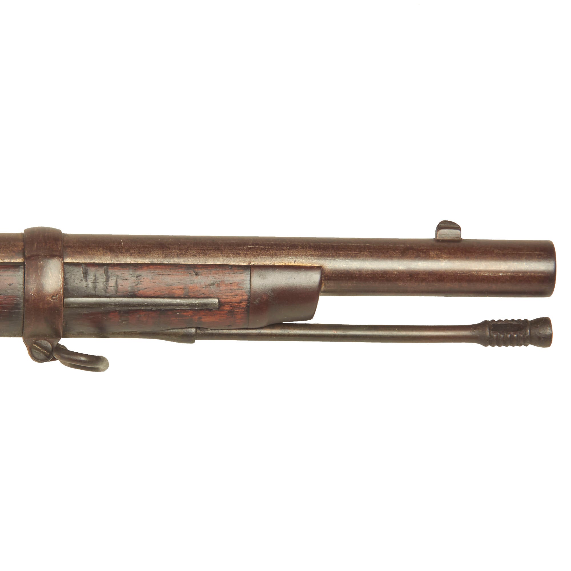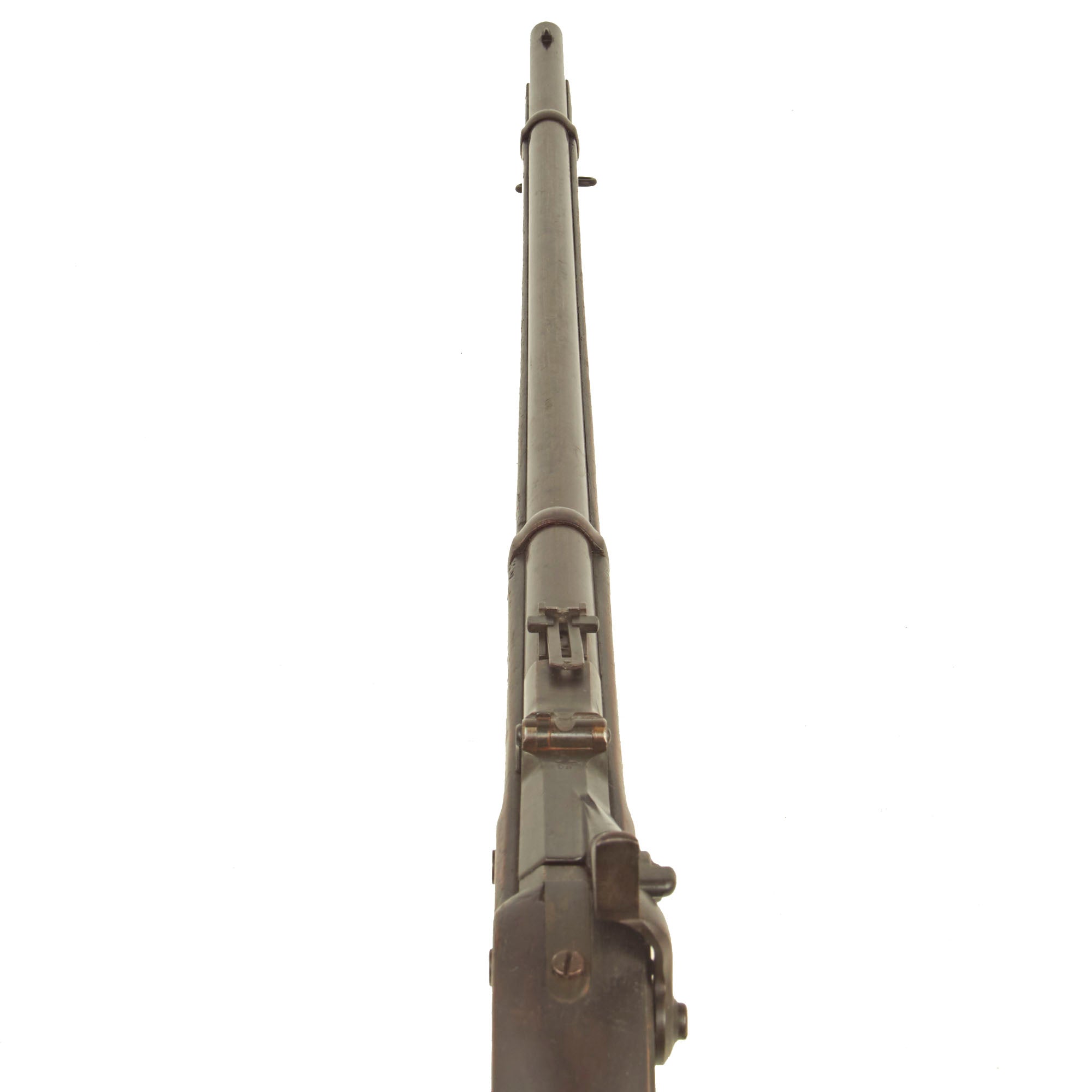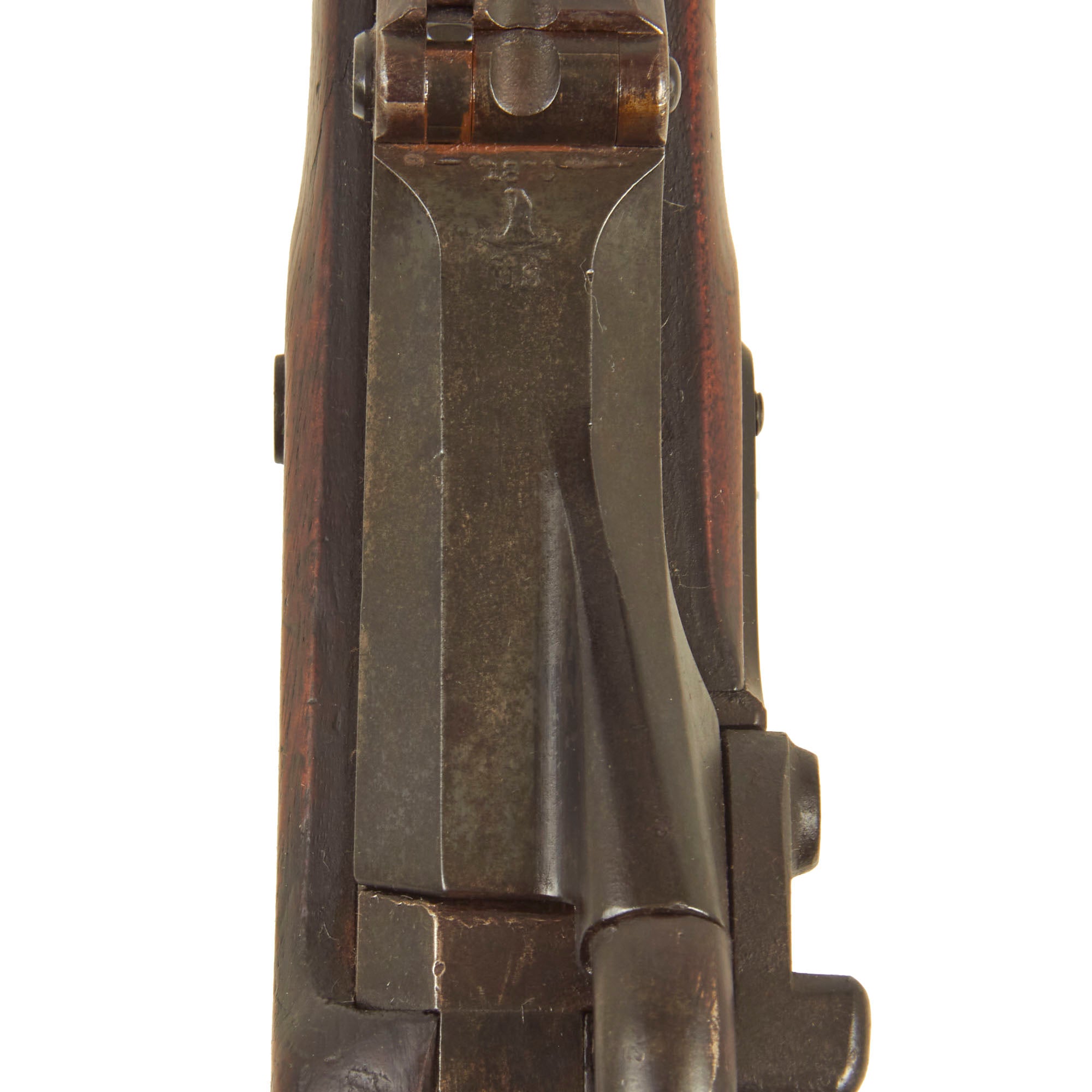 The bore is in very good condition, showing a mostly bright finish with crisp lands and grooves. There are just a few areas of light oxidation and fouling, which are mostly confined to the grooves. The cartridge extractor is present and functional, though we have not tested its ability to eject spent brass. The metalwork has a lovely plum patina in most areas, with the receiver and lock still showing strong bluing from the arsenal. The receiver has a bit of a mottled oxidized patina now. The rifle still has both sling swivels, and the correct original cleaning rod with a single shoulder. The rear sight is fully intact and functional, something that we do not see very often.