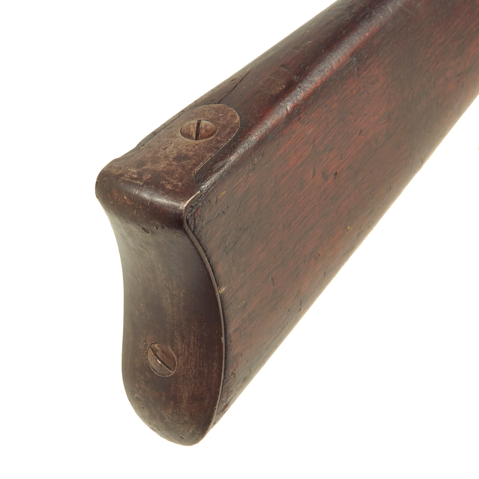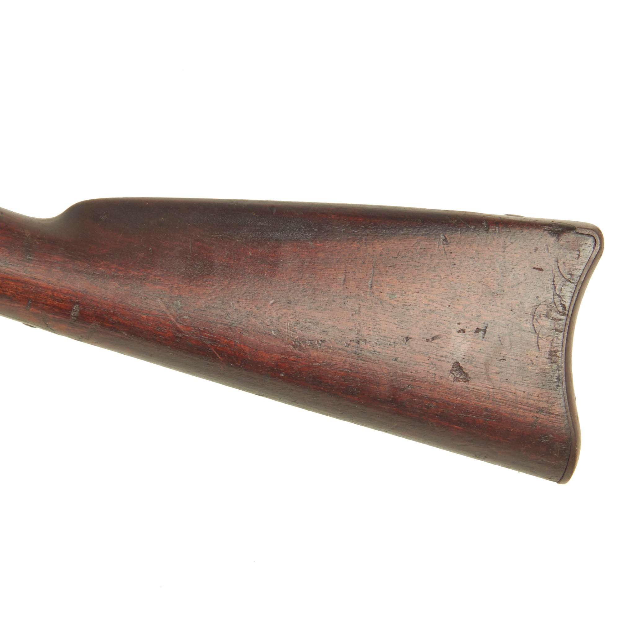 The stock is in very good condition, with nice grain and a lovely dark red brown color to the walnut. It has a lovely color and oiled finish, and shows the expected dents, dings, and small gouges from long service. There is some chipping and cracking along the edges of the ramrod channel, usually acquired when the rifle fore stock is rested on something when aimed and fired.
