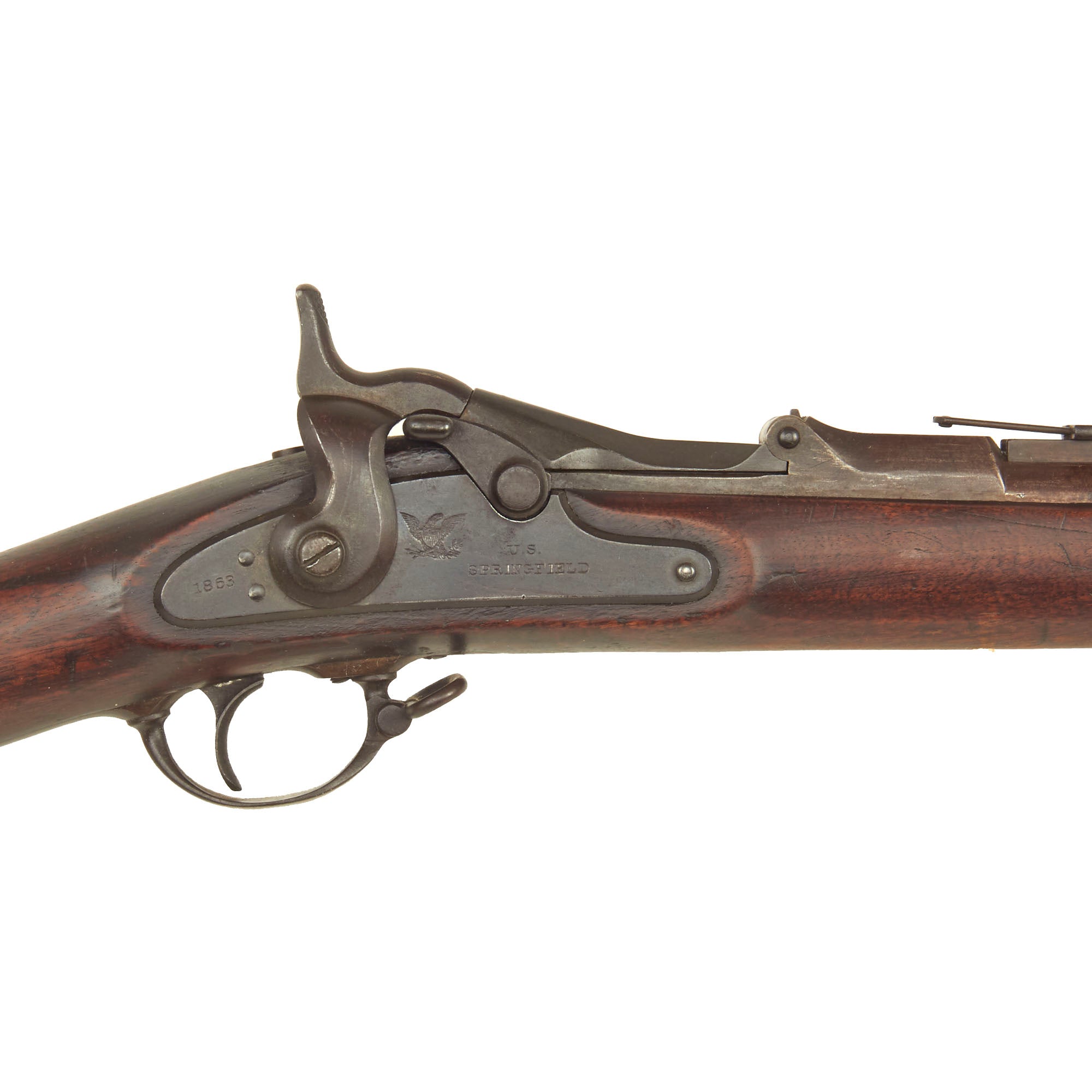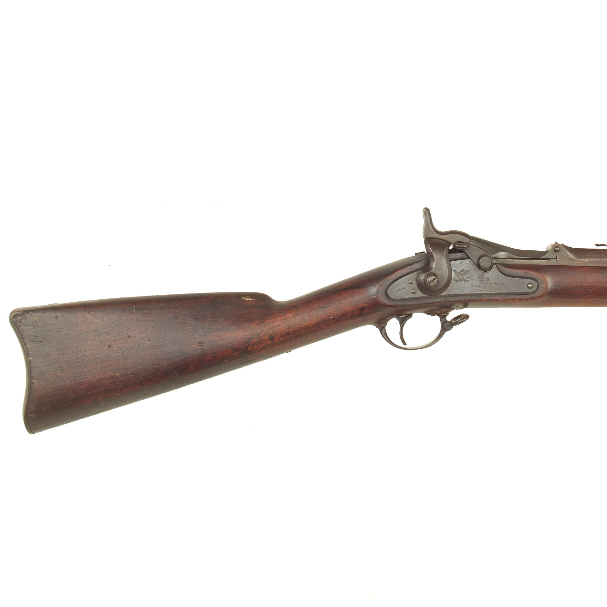 Original Item: Only One Available. Now this is a real peach! This rifle started out as a Civil War Springfield Rifle Musket, dated 1863, made by SPRINGFIELD ARMORY, as indicated on the lock plate. There is also the "Spread Eagle" and U.S. marking, indicating military production. This particular rifle looks to have been made during the change over from the Model 1863 Type I to Type II, as while it has the 1863 date, it has the solid bands held in place by strings. Definitely an interesting example! Around 700,000 of all Model 1863 types were produced from 1863 until the end of the Civil War in 186