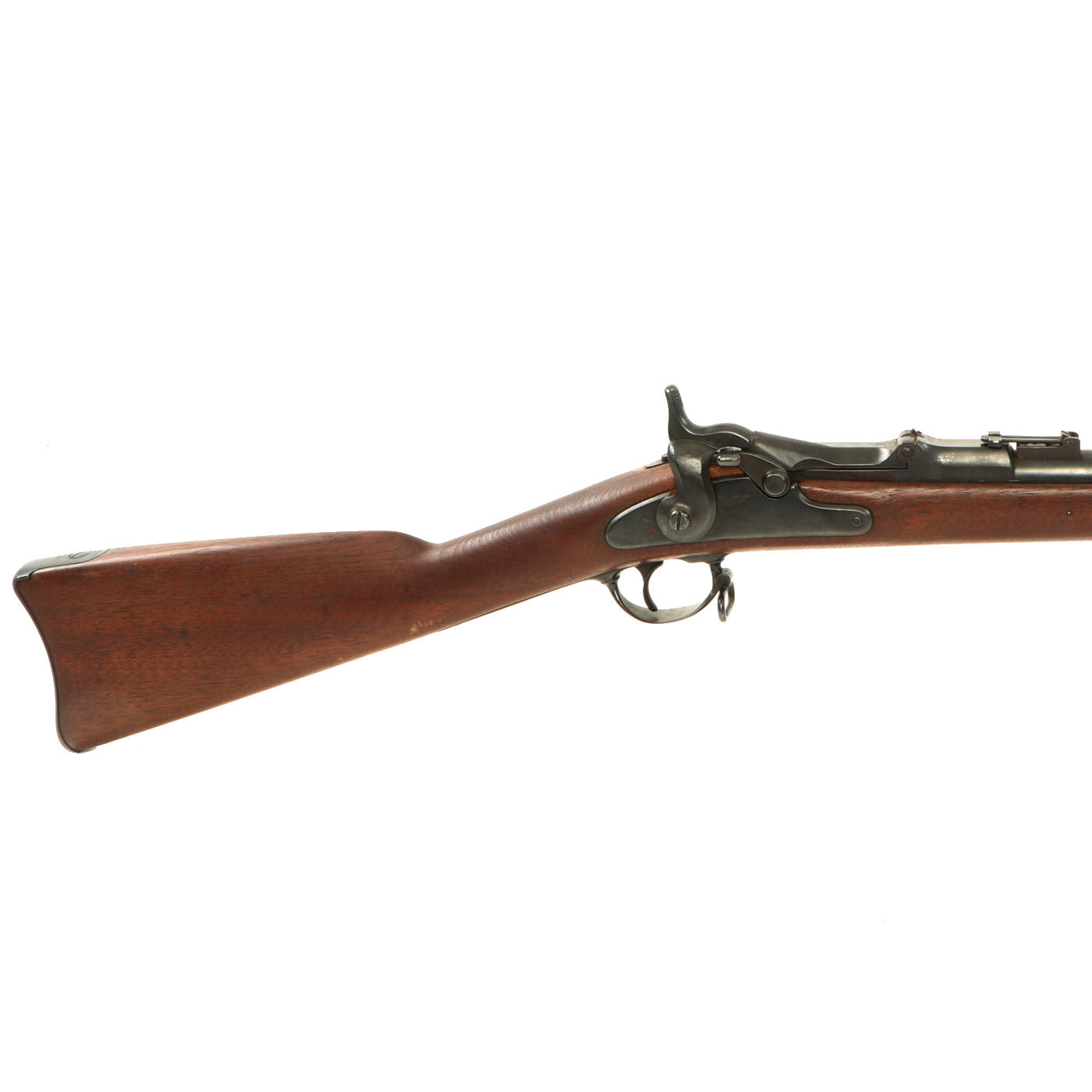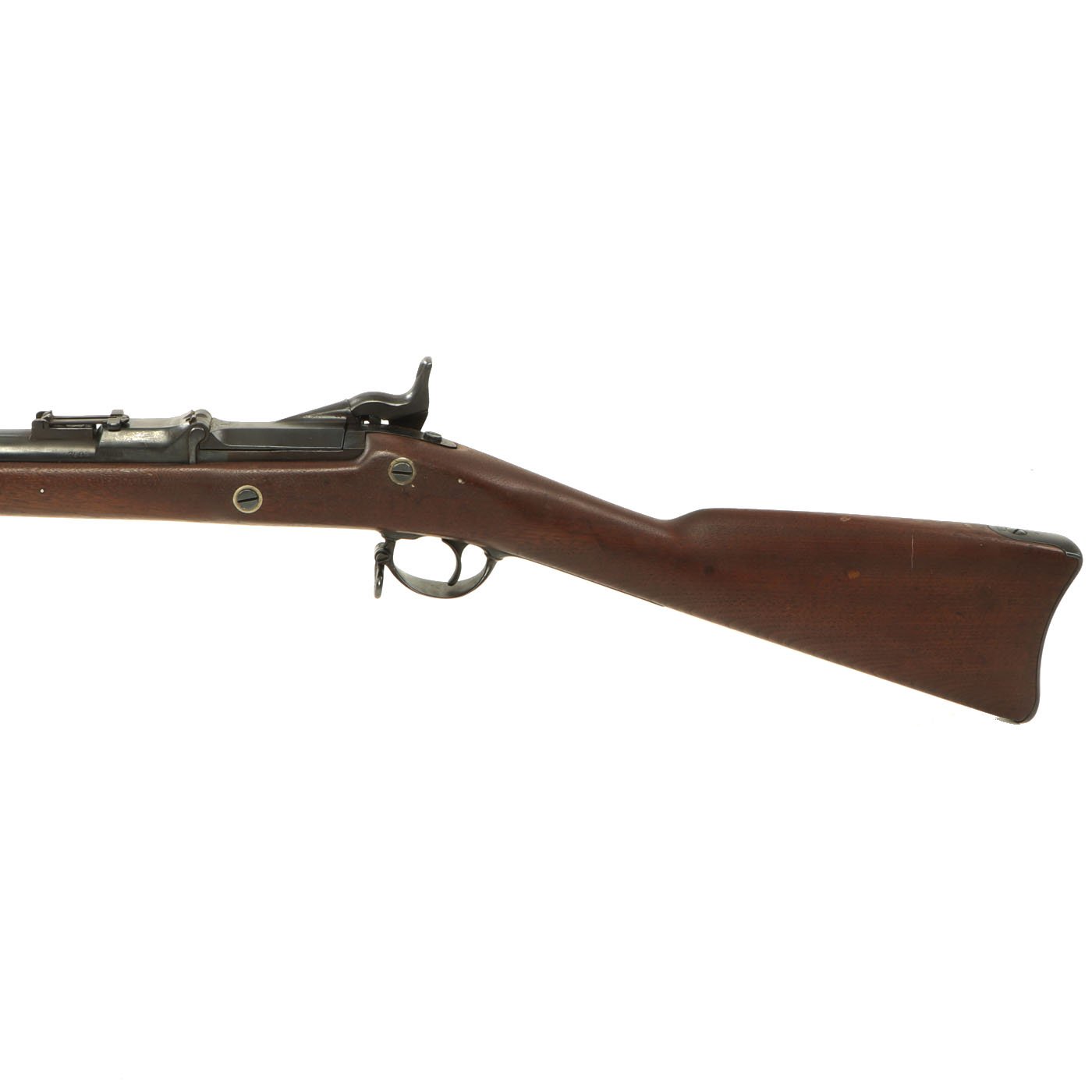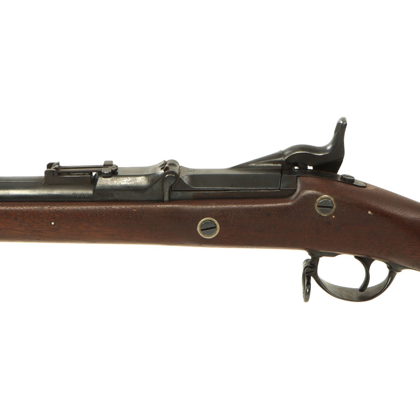 In excellent condition, the lock is marked 1863 and an EAGLE over U.S. next to SPRINGFIELD and the Breech Block is marked MODEL / 1870 with an Eagle head / Crossed Arrows / U.S. cartouche underneath. The barrel and receiver bear serial number 7803 on the left hand side. In great condition this is a rare U.S. Military Rifle that led to the the legendary Model of 1873.