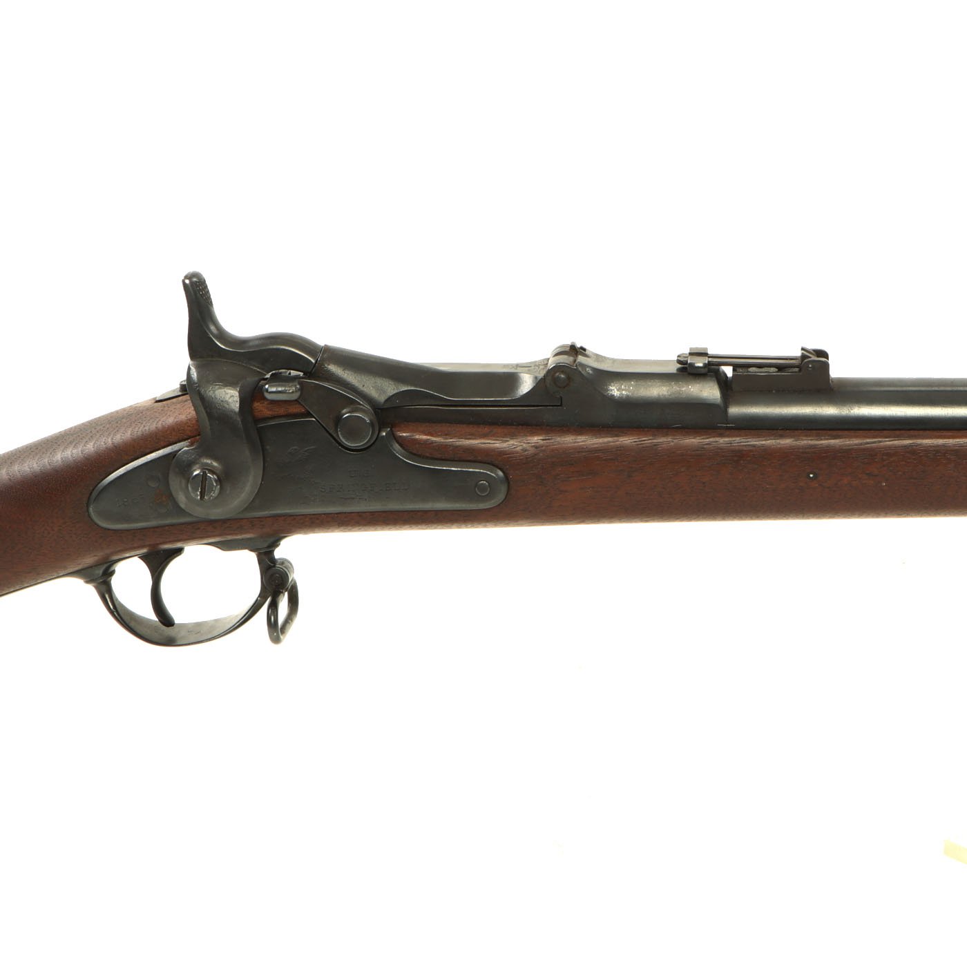 Original Item: Only One Available. This is really a Peach! This rifle started out as a Civil War Springfield Rifle Musket, dated 1863, made by SPRINGFIELD ARMORY, as indicated on the lock plate. There is also the "Spread Eagle" over U.S. marking, indicating military production. This particular rifle has both band springs and screw tightened barrel bands, so we assume it started life as a Model 1863 Type 1, which had the adjustable bands. Parts were often swapped during the conversion.
