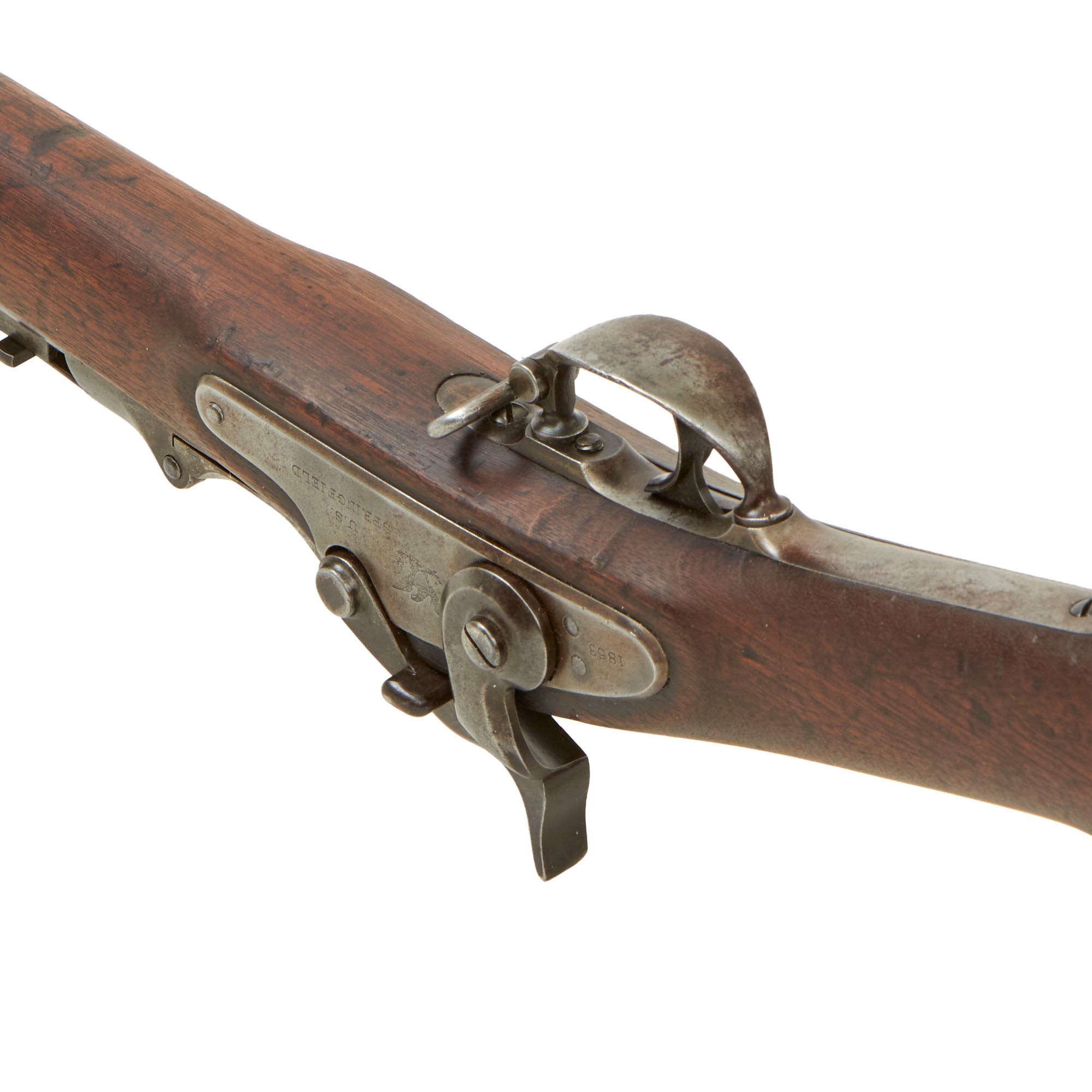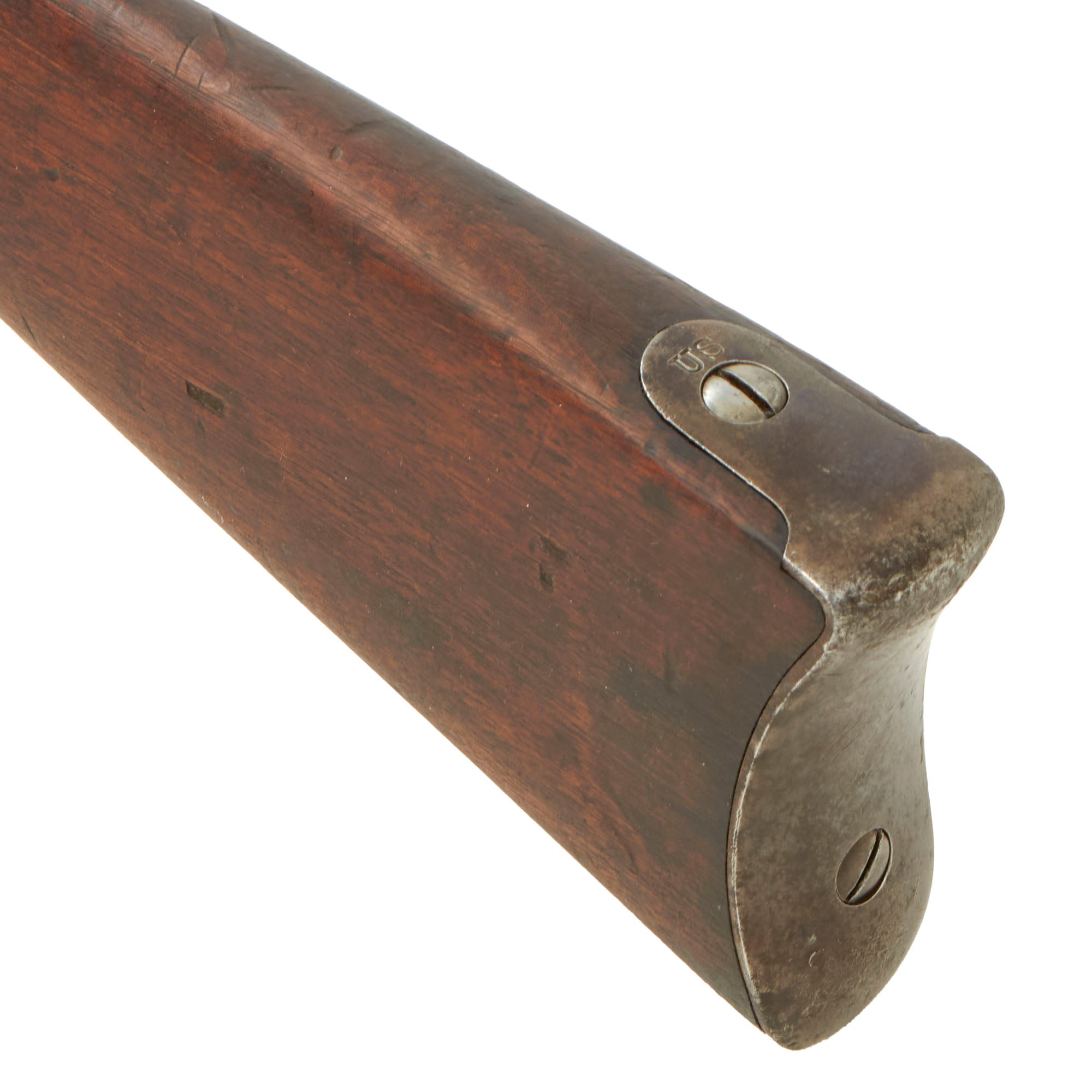 In lovely service used condition, this is a rare U.S. Military Rifle that led to the the legendary Model of 1873. The stock is in good condition with the expected dents and dings from age, as well as some gouges. It shows overall wear, but it still bears TWO oval ESA cartouches on the left side, one under by the breech block, and another fainter one at the bottom over the rear of the trigger guard. This is for Erskine. S. Allin, Master Armorer at Springfield Armory from 1853 until his death in 1879, as well as the designer of the trapdoor system. We believe this means that the rifle was inspected by Allin when it was first made as a Model 1863, and AGAIN when it was converted. Definitely some great markings here!