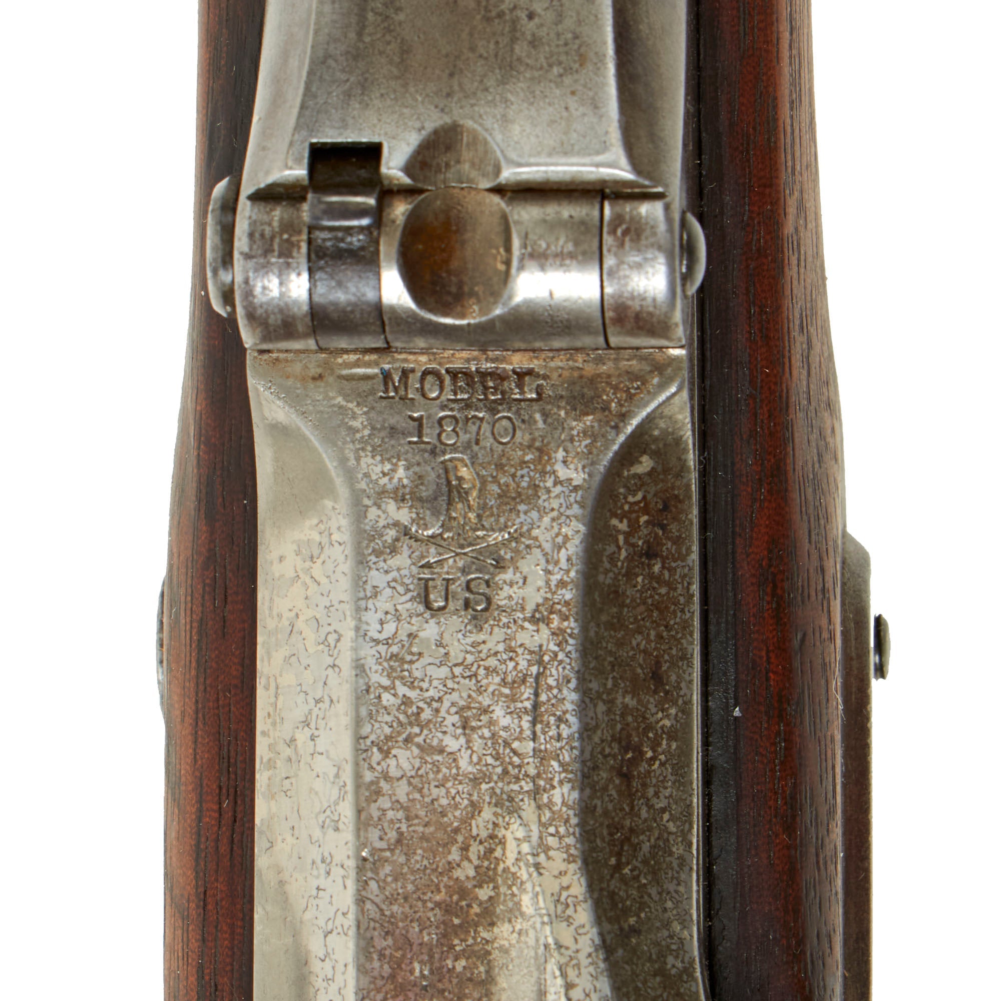 In fine condition, the lock is dated 1863 across the tail and has an EAGLE over U.S. over SPRINGFIELD, indicating original manufacture at the United States Armory and Arsenal at Springfield, in Springfield, Massachusetts. The Breech Block is marked with MODEL / 1870 / Eagle's Head / Crossed Arrows / U.S., the correct marking for the 2nd version of the breech block. It has the correct long high arch on the underside, and an intact ejector, which we have not tested with actual brass.