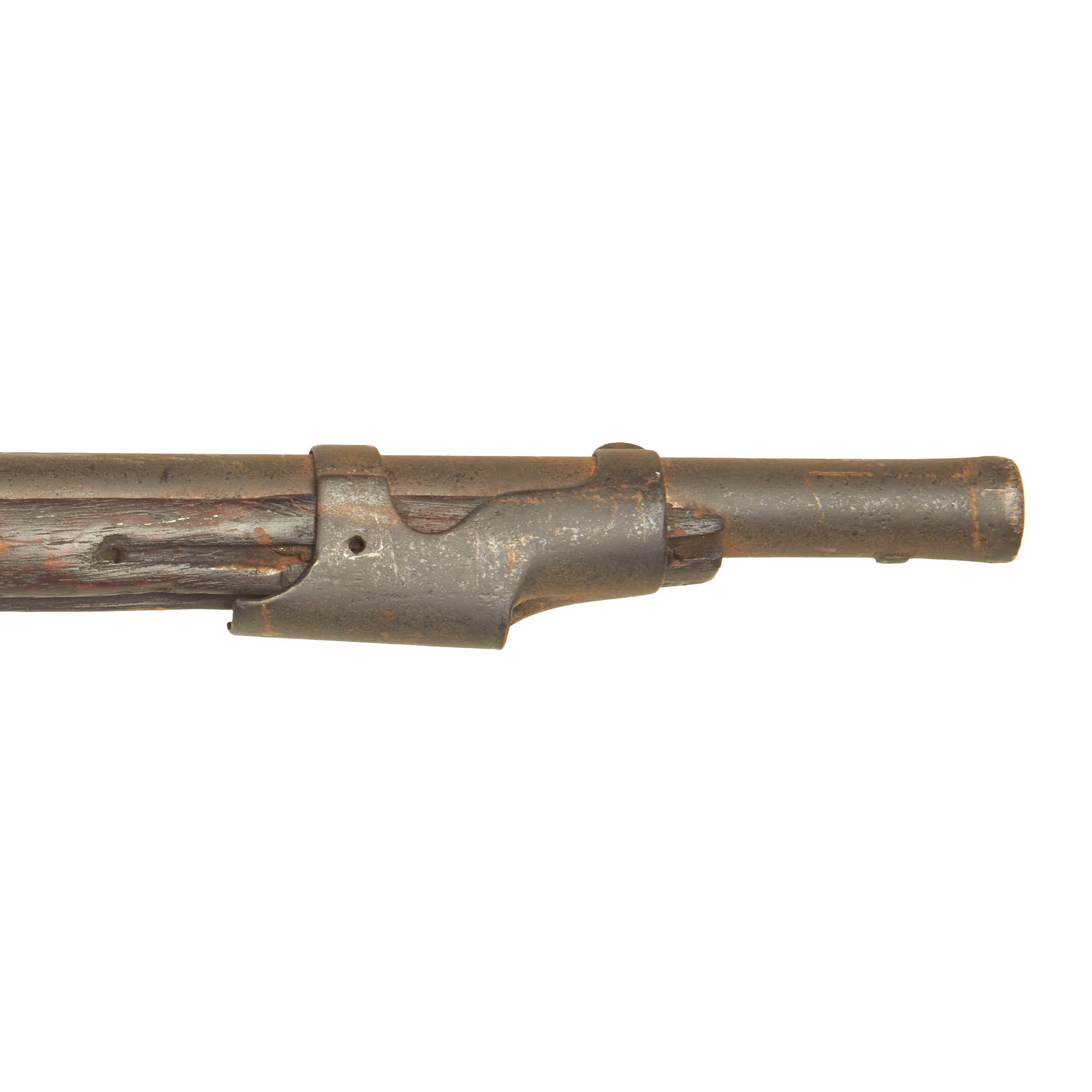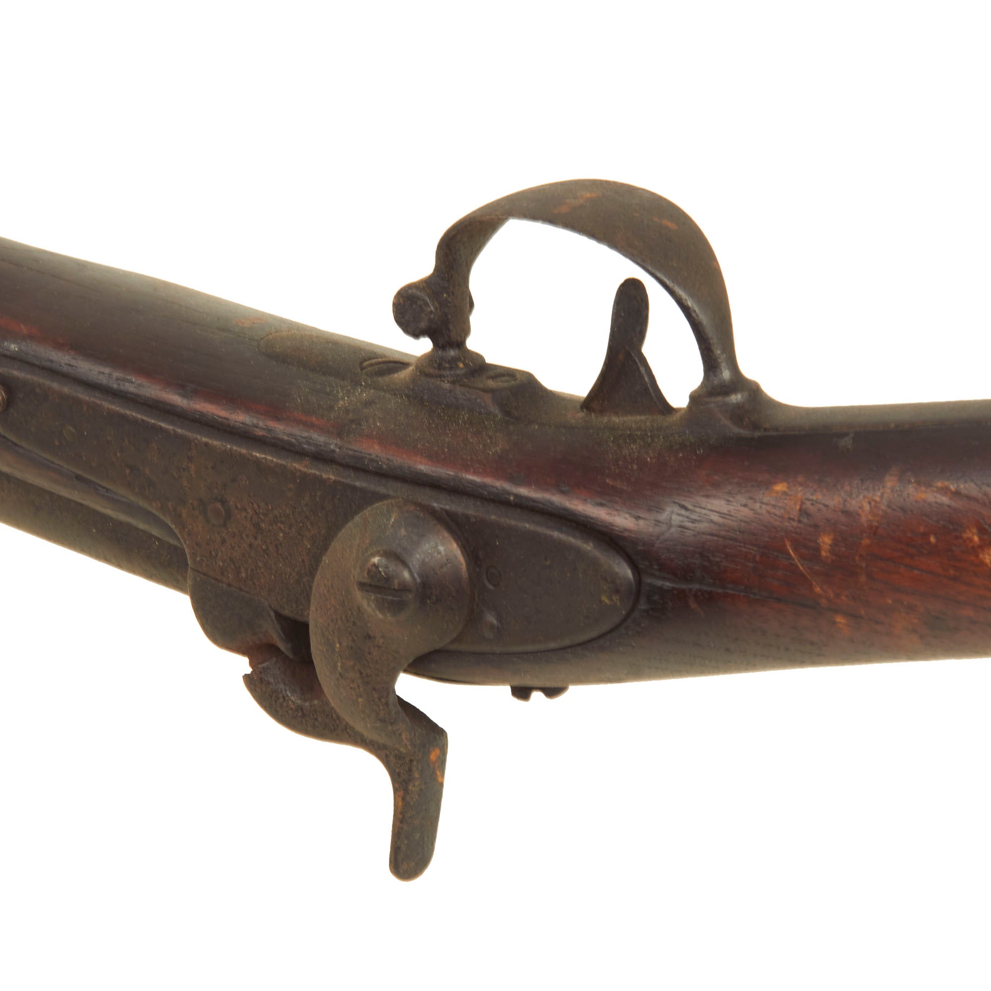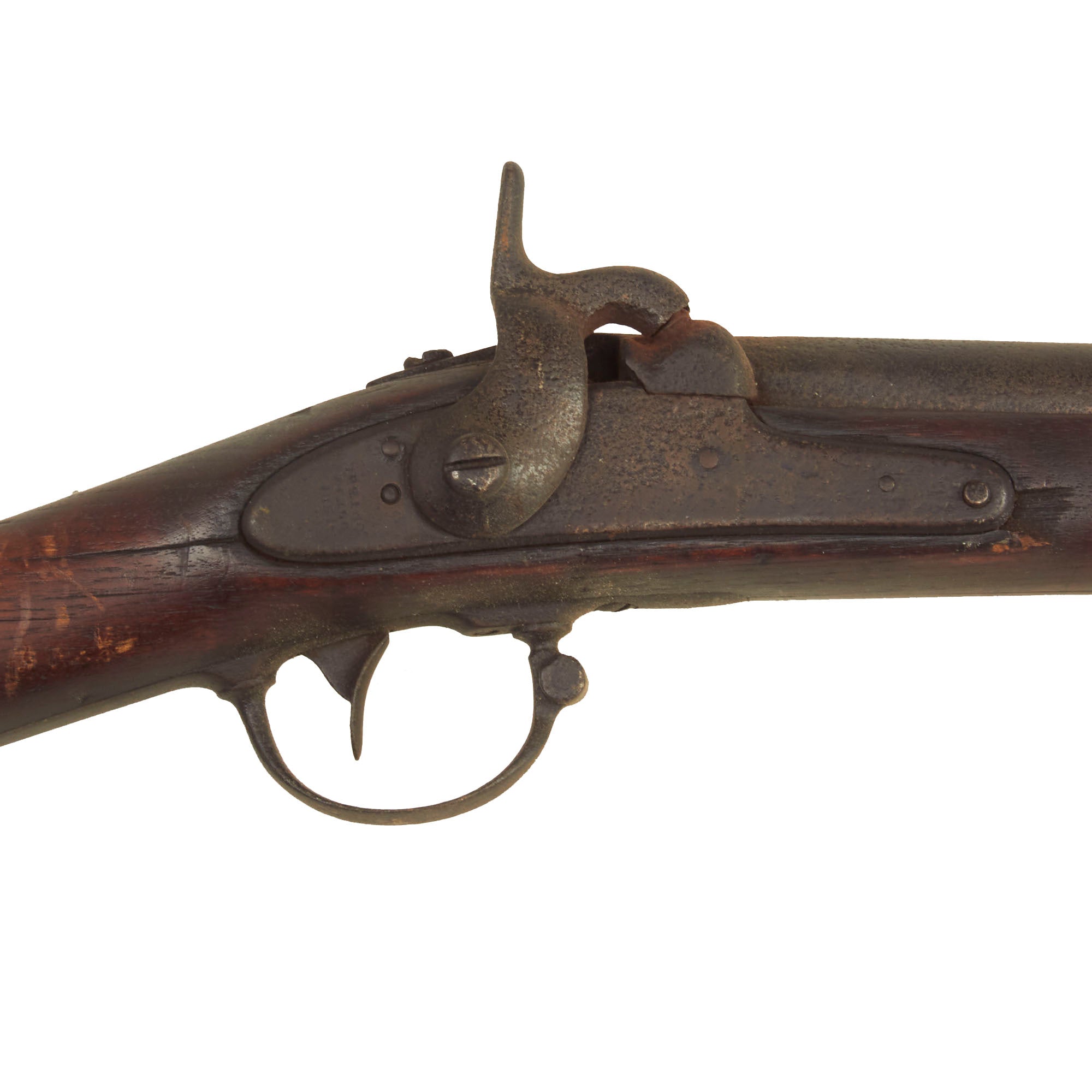 The Models 1840 & 1842 were made with thicker barrel walls, with the intention that they could be rifled later, however this example is still in the original smoothbore configuration. The lock plate is oxidized and worn, which has removed some of the markings. The lock plate tail however still has a fairly clear SPRING / FIELD / 1851 marking. Many of these muskets were produced under contract, however this example was made at the United States Armory and Arsenal at Springfield itself, located in Springfield, Mass. The musket side plate is thin and not bulged, as typical of the Model 1842 Musket. The markings on the breech end of the barrel are completely gone due to oxidation and powder burn.