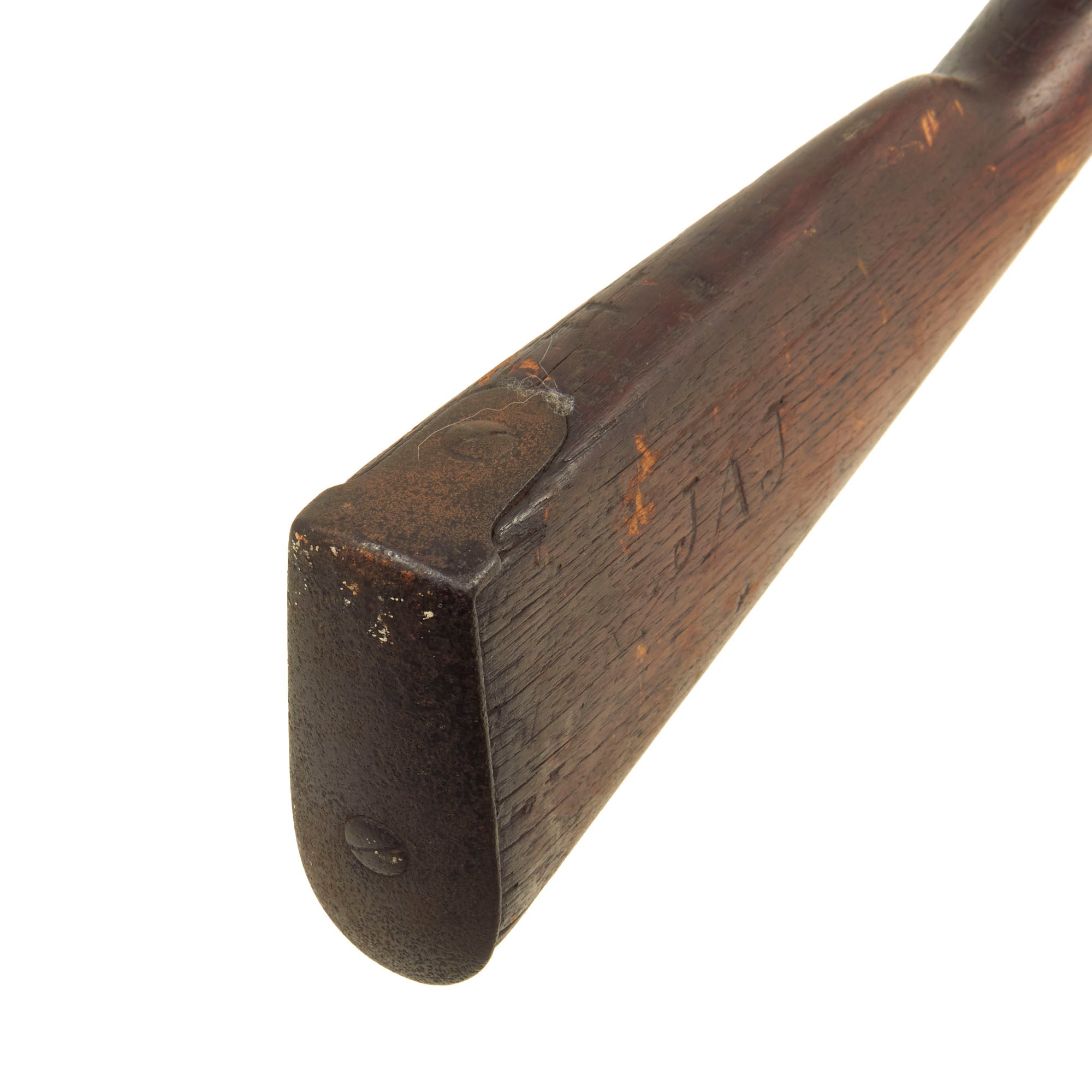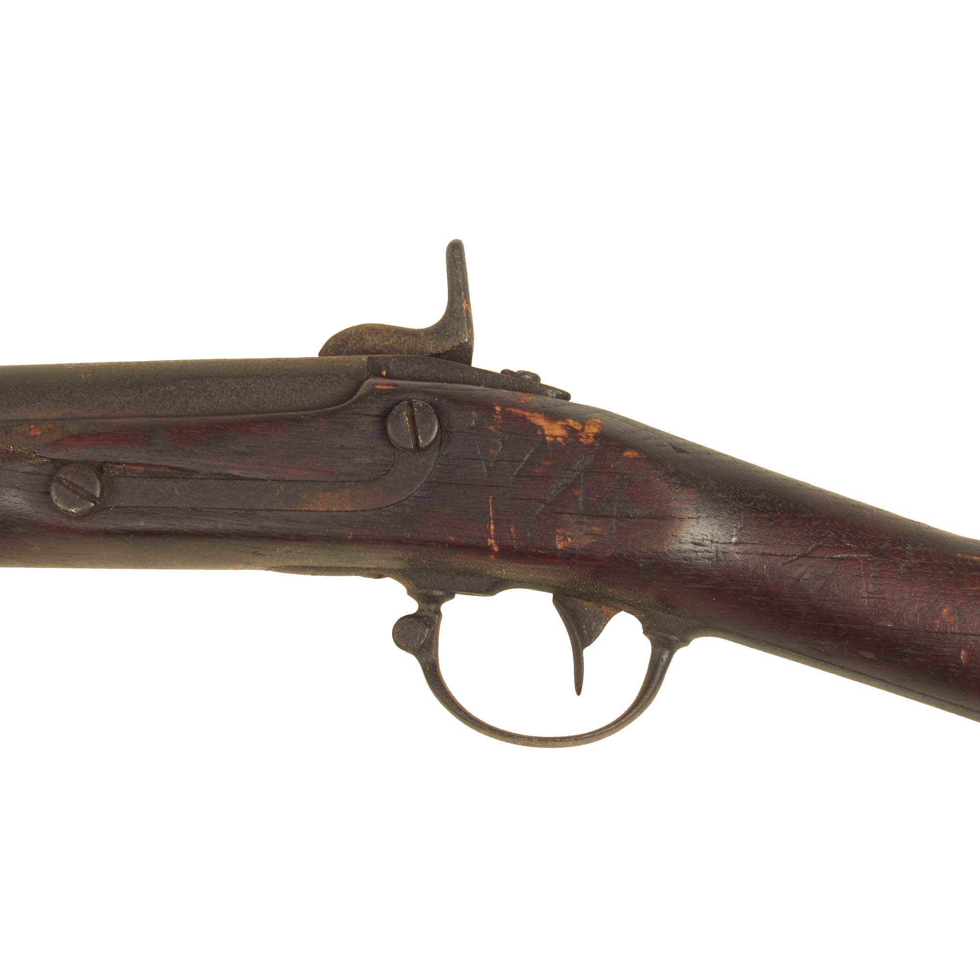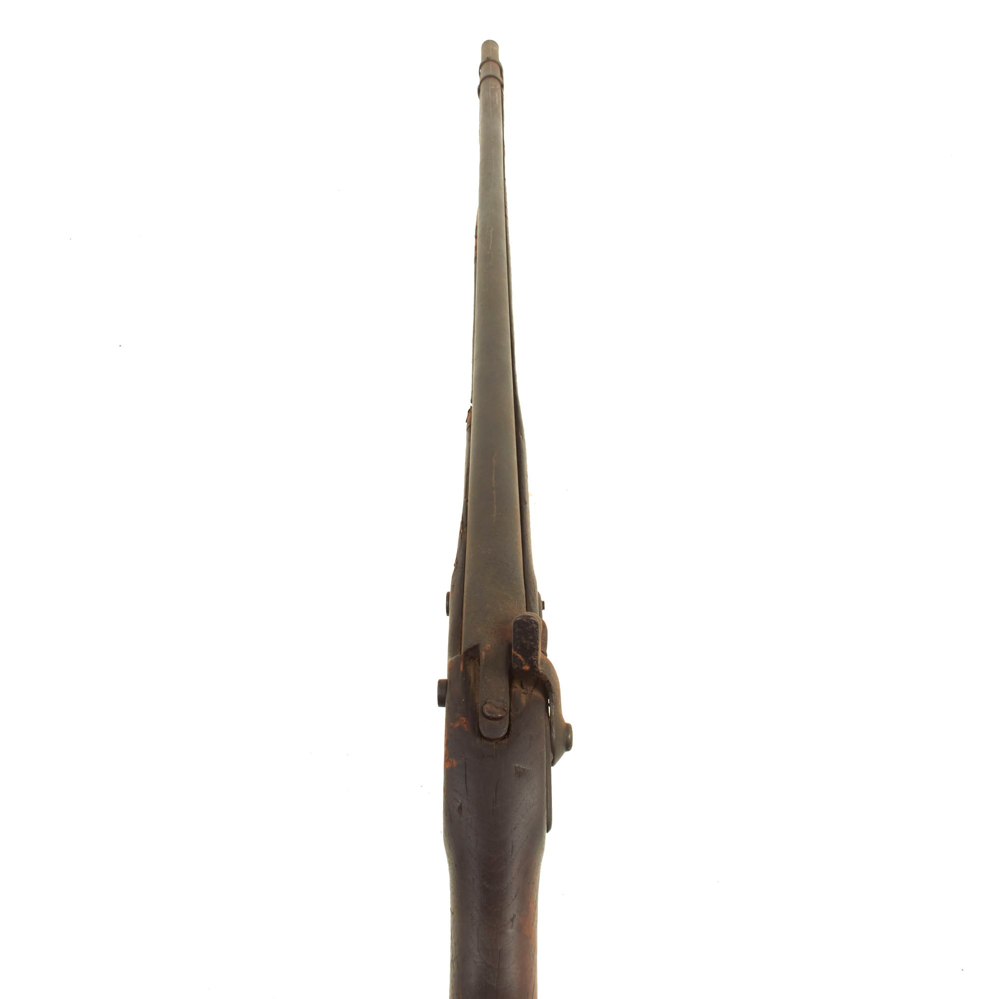 The Models 1840 & 1842 were made with thicker barrel walls, with the intention that they could be rifled later, however this example is still in the original smoothbore configuration. The lock plate is oxidized and worn, which has removed some of the markings. The lock plate tail however still has a fairly clear SPRING / FIELD / 1851 marking. Many of these muskets were produced under contract, however this example was made at the United States Armory and Arsenal at Springfield itself, located in Springfield, Mass. The musket side plate is thin and not bulged, as typical of the Model 1842 Musket. The markings on the breech end of the barrel are completely gone due to oxidation and powder burn.