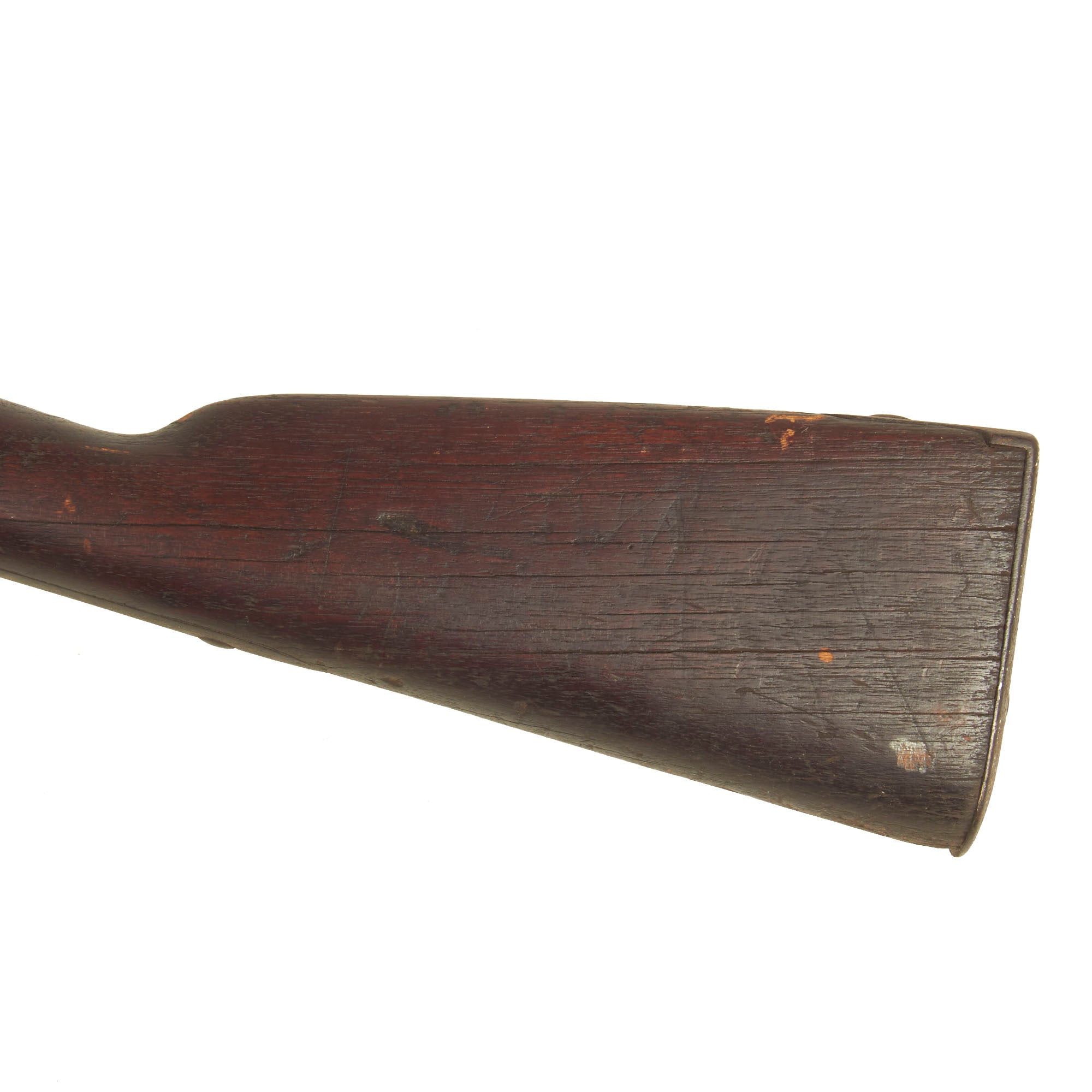 - Stock shows significant damage on the fore stock area, with splits and past repairs.