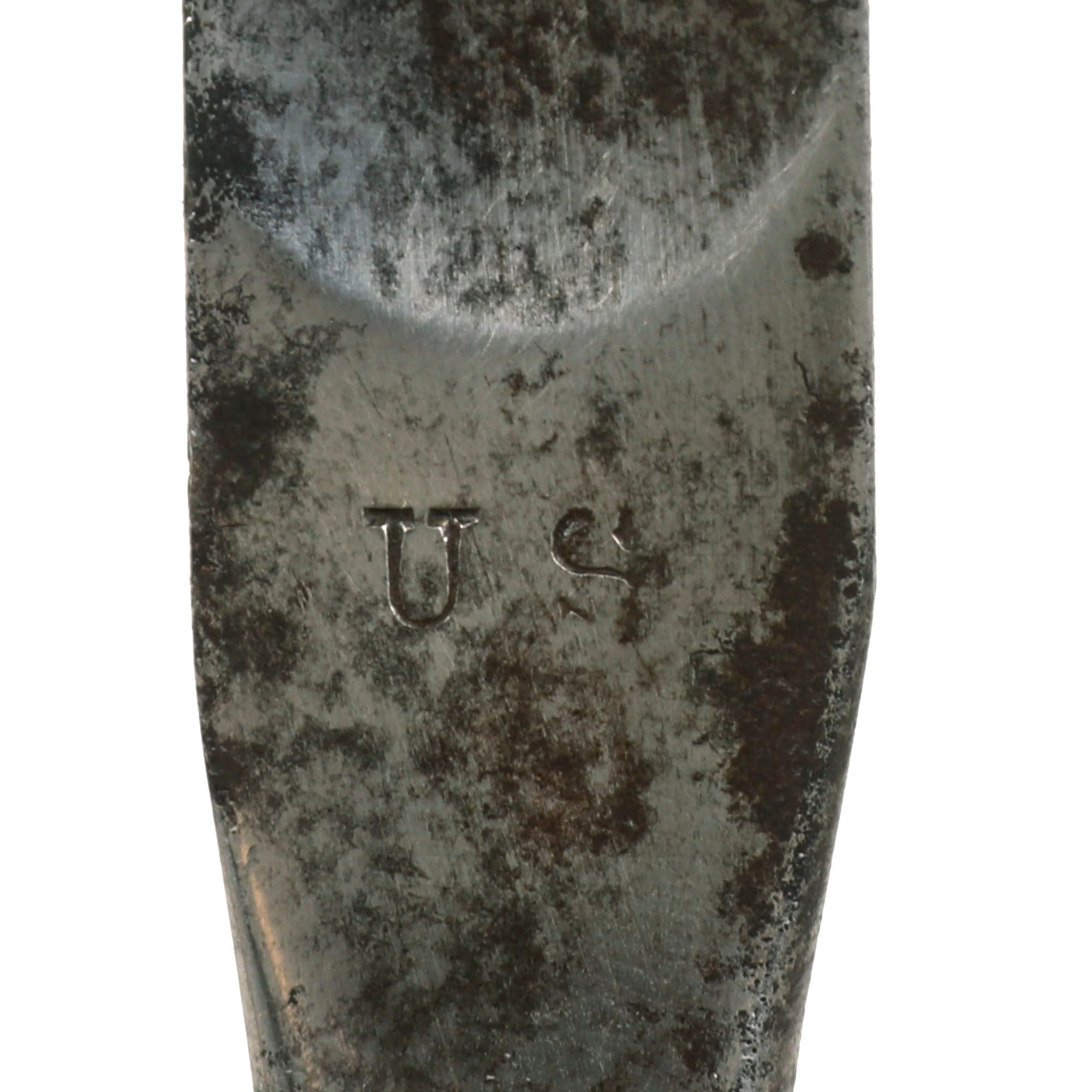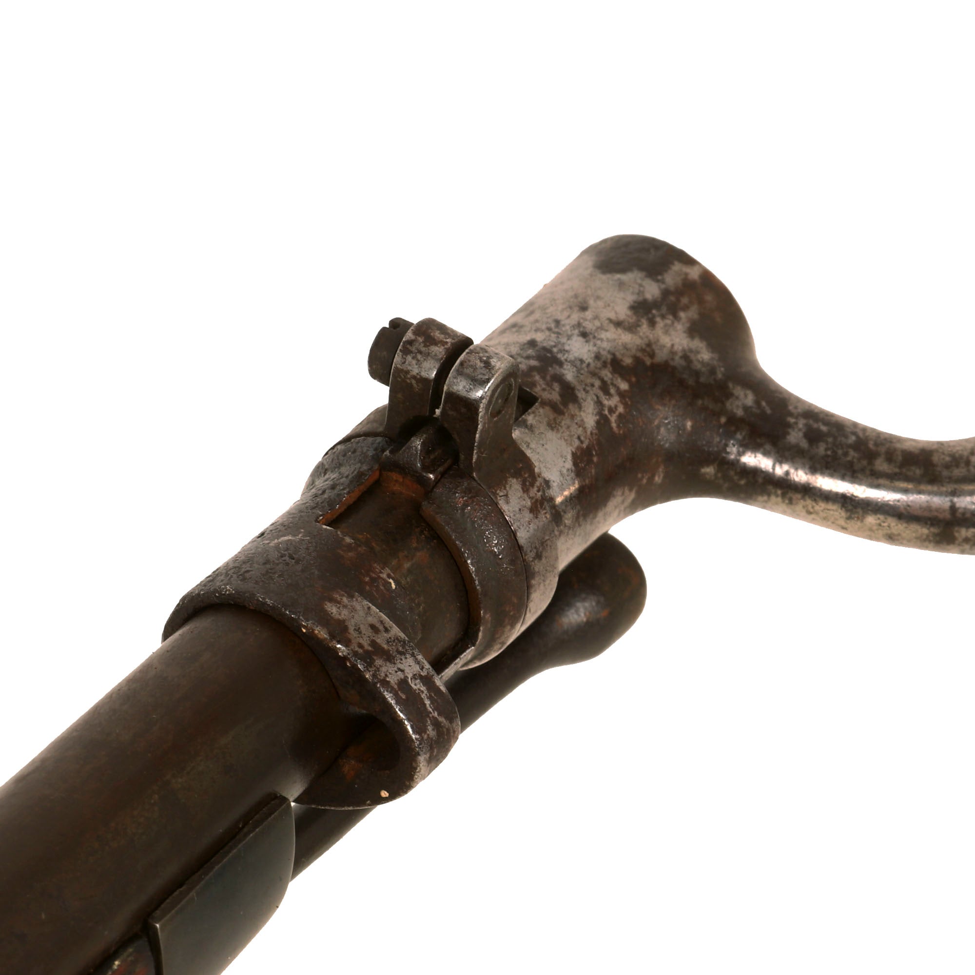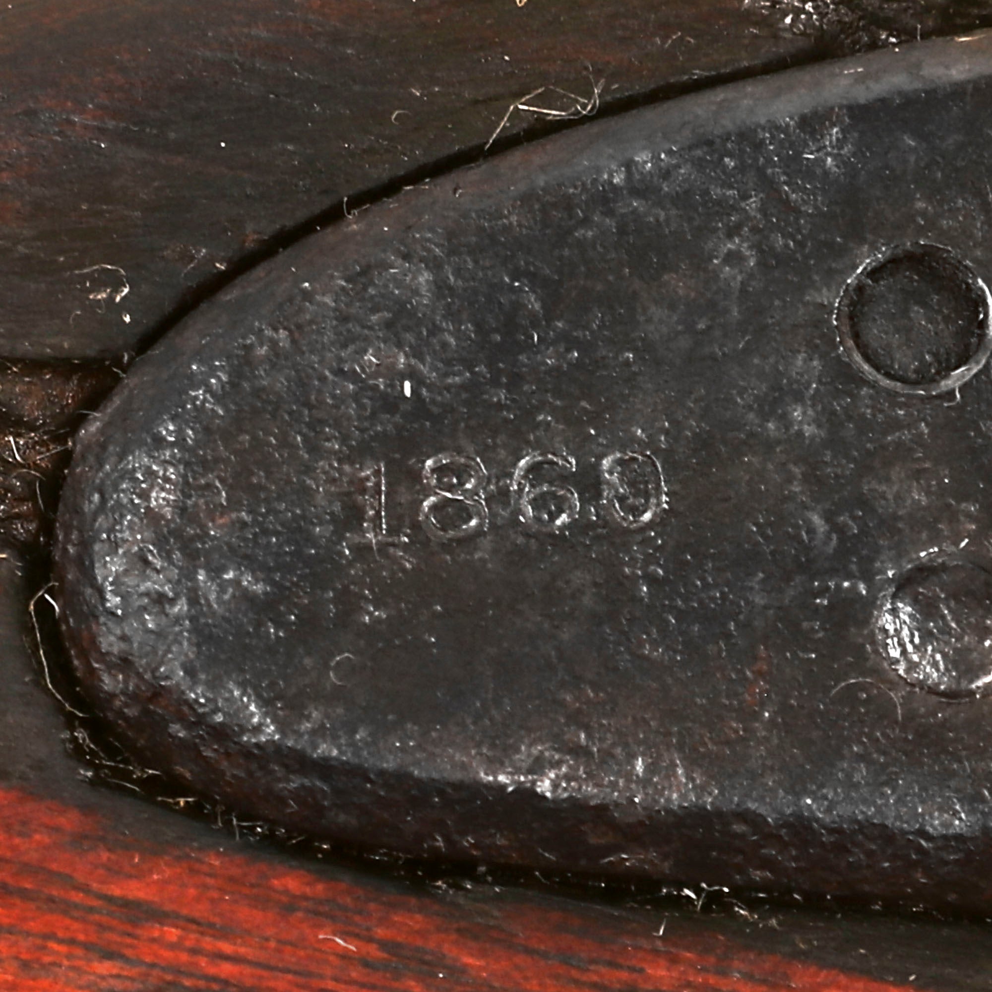 The metalwork overall has mostly aged to an oxidized patina, with some areas of peppering and light pitting and wear commensurate to the age and level of service that this rifled musket saw. The bore still shows strong three groove rifling, with the expected powder fouling and oxidation on the interior. The upper sling loop is still present, while the lower loop on the trigger guard has broken off. Under the barrel is the correct tulip headed cleaning rod with an enlarged shank. All three barrel bands are correctly U marked, however the marking on the butt plate has worn away.