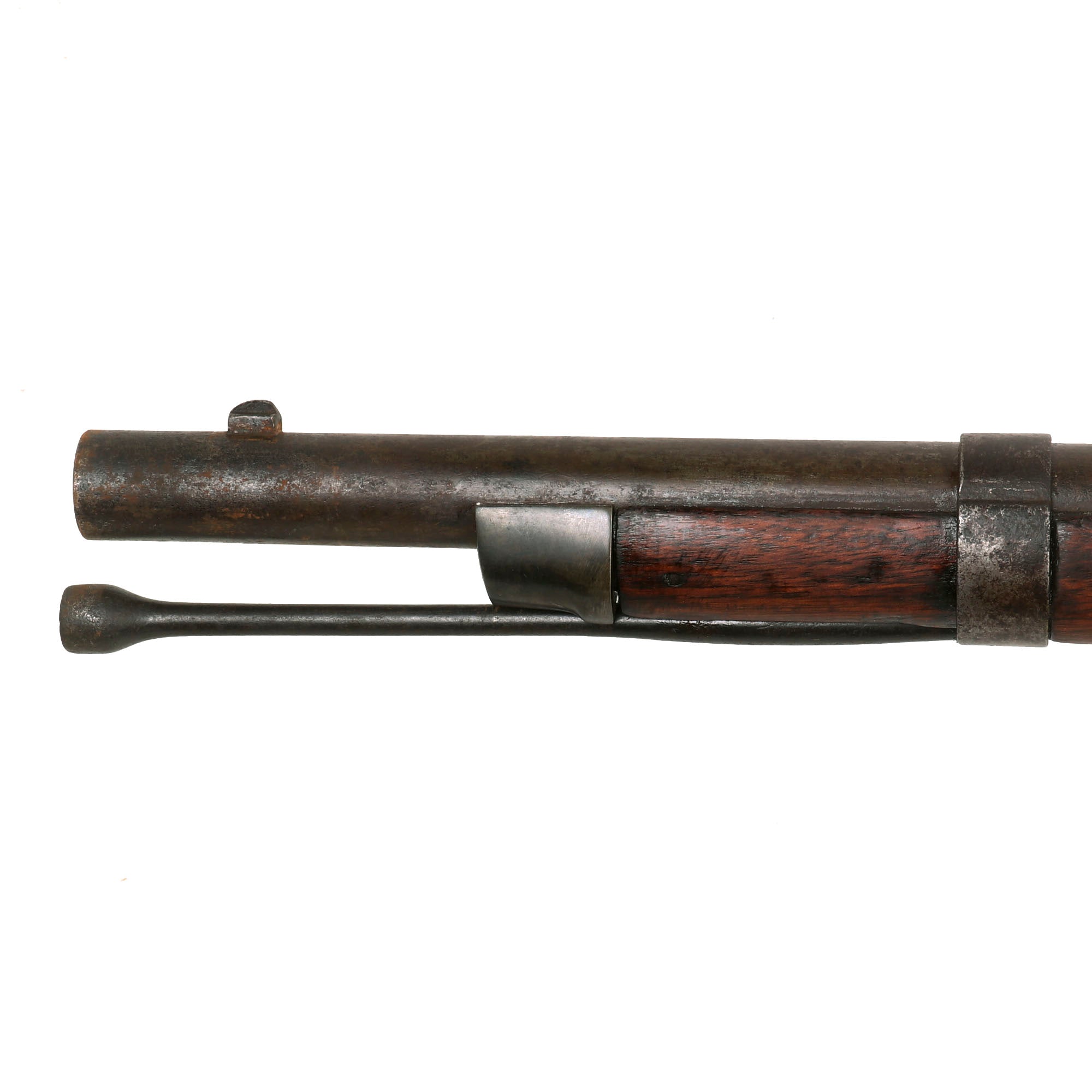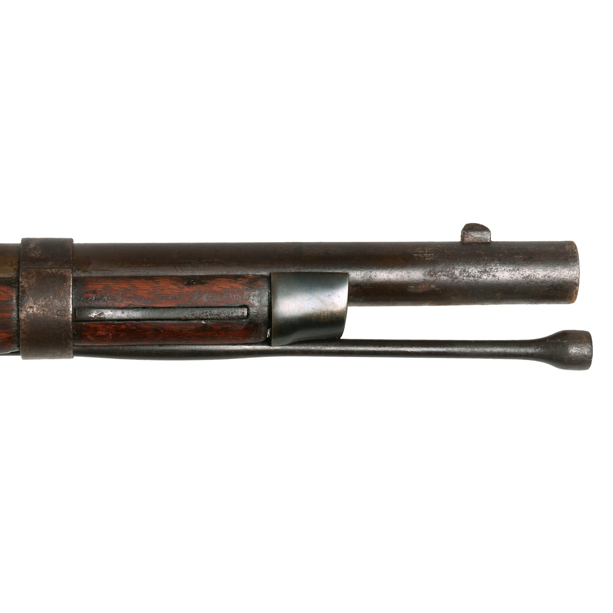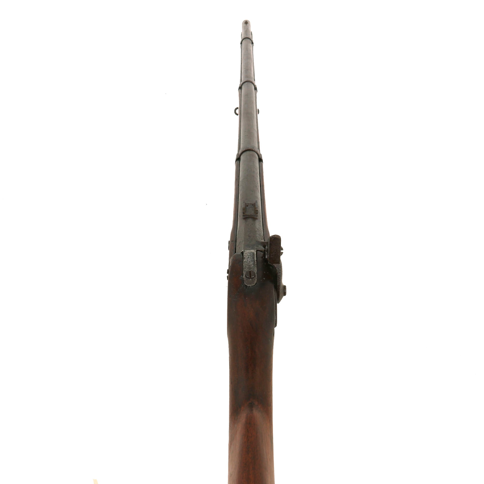 The metalwork overall has mostly aged to an oxidized patina, with some areas of peppering and light pitting and wear commensurate to the age and level of service that this rifled musket saw. The bore still shows strong three groove rifling, with the expected powder fouling and oxidation on the interior. The upper sling loop is still present, while the lower loop on the trigger guard has broken off. Under the barrel is the correct tulip headed cleaning rod with an enlarged shank. All three barrel bands are correctly U marked, however the marking on the butt plate has worn away.