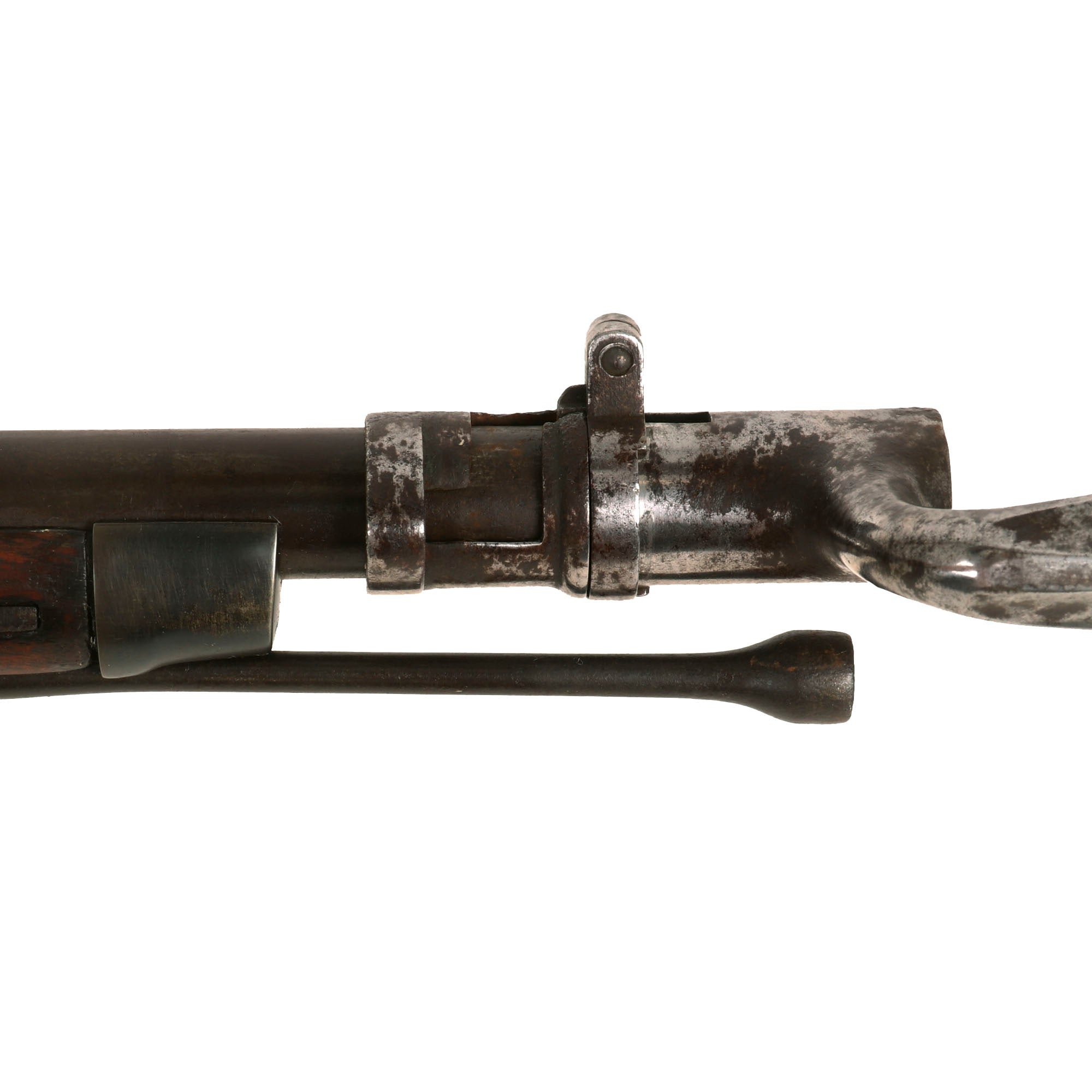 This example is still in the original configuration, and looks to have seen a good amount of service during the war, and possibly afterwards. It is one of the later produced examples, and has the rare steel patch box with spare nipple inlet on the right side of the butt stock.