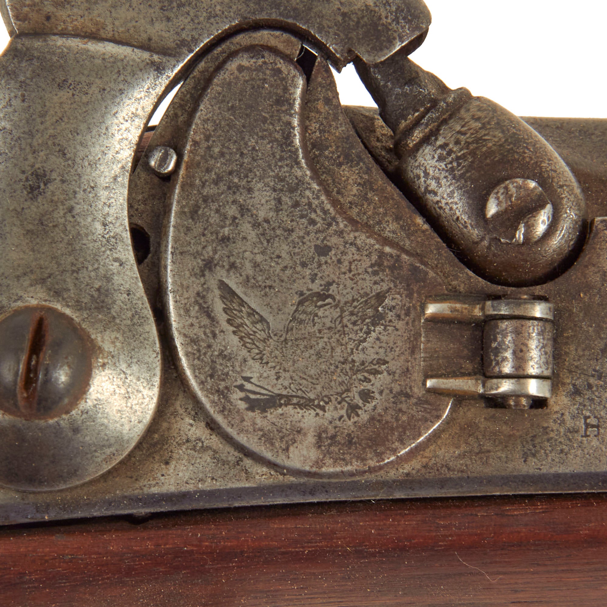 The V / P / Eagle Head proofs on the barrel nocks form are present, though very faint, and the date has been completely worn away. The cap nipple cone is present, though it shows wear and oxidation from use. The cap bolster cleanout screw is still present, but definitely "buggered", and we cannot currently open the cleanout. The rear sight base is present and two leaves are still intact, with the third broken off.