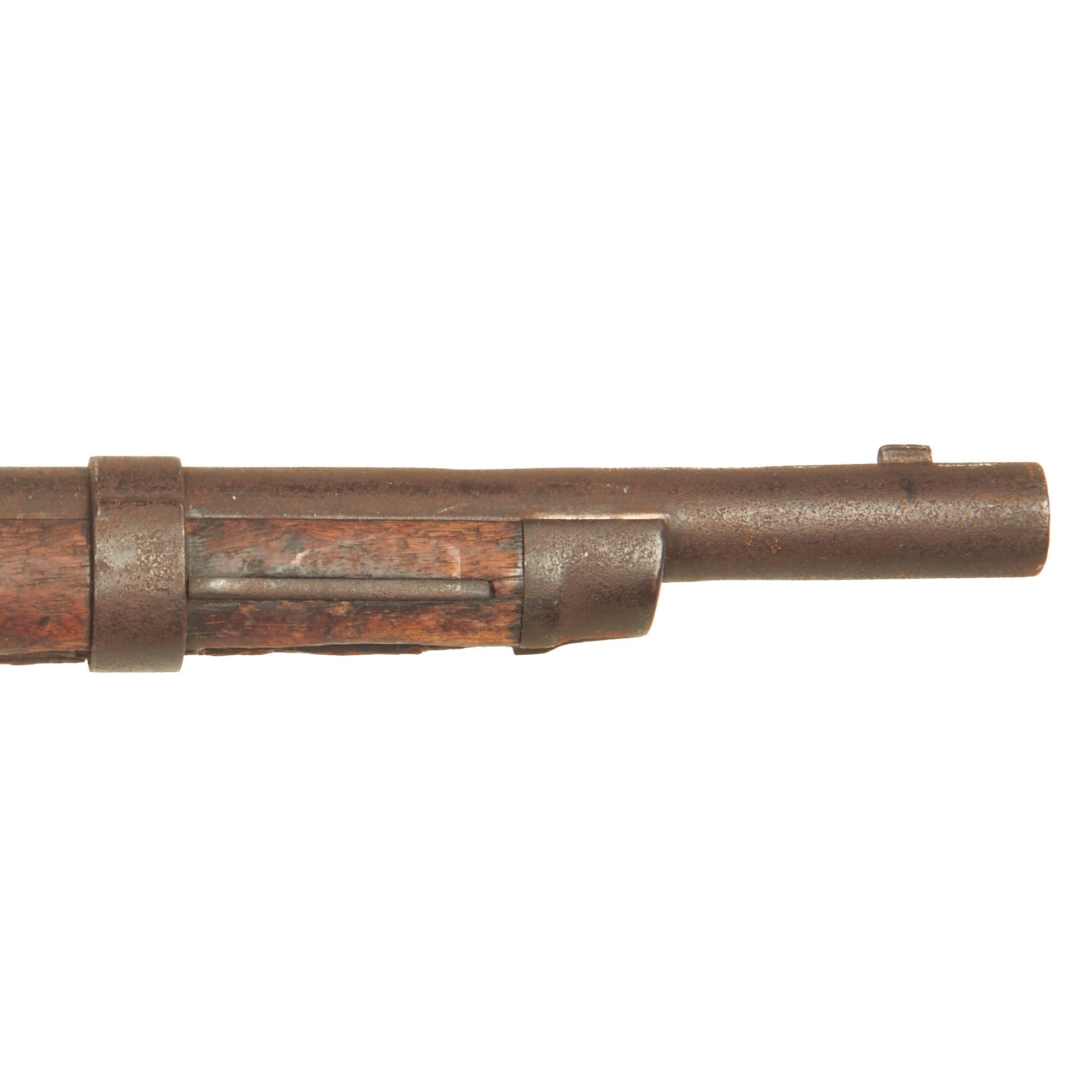This is a very nice "As Found" example of the Springfield Model 1861 Rifled musket, and was not made under contract, as many were. This example was produced at the United States Armory and Arsenal at Springfield, in Springfield, Massachusetts. It is dated 1862 on the lock plate tail, and also has a Federal Eagle stamped into the lock to the left of U.S. / SPRINGFIELD. The lock markings are somewhat worn due to rust and oxidation. The barrel nocks form bears the standard proof marks of V / P / Eagle's Head, though they are a bit hard to see.