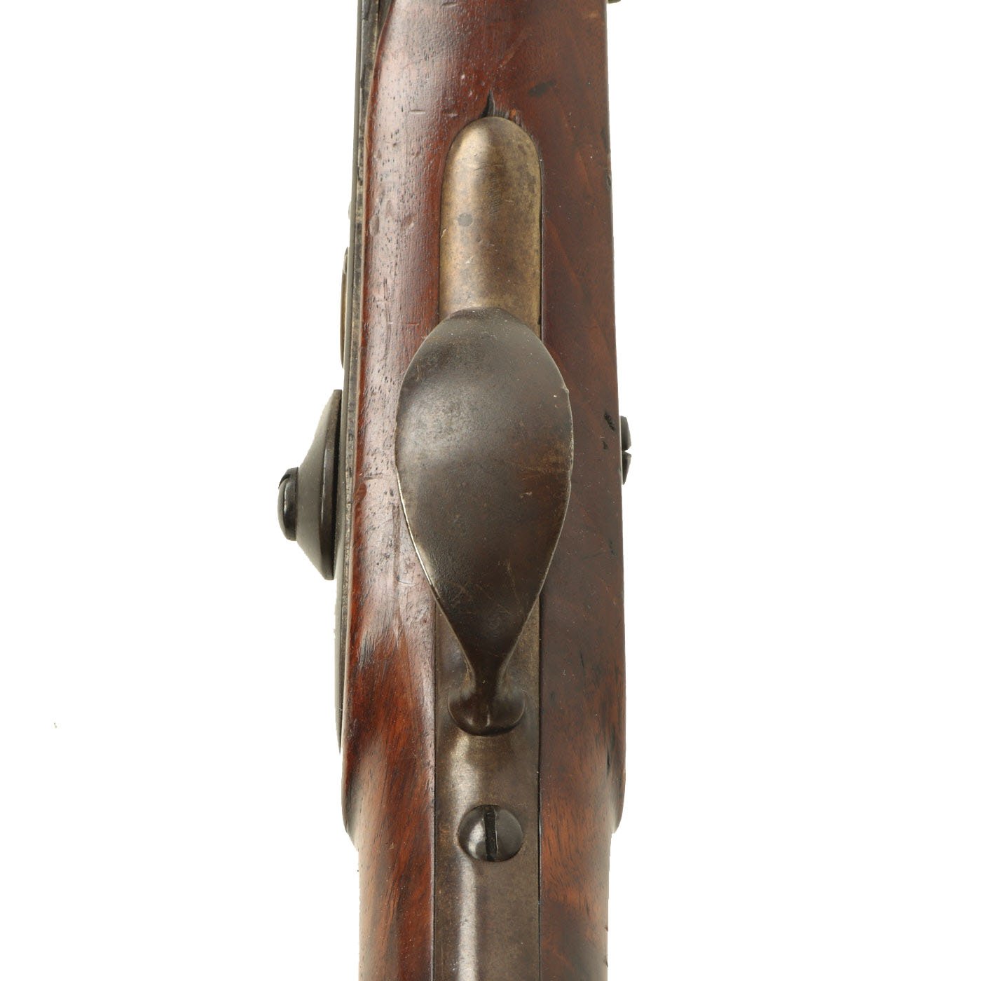 The musket's mounts are all of iron and have a lovely lightly oxidized patina over most parts. There is some powder burn around the original cap nipple on the barrel, but not a huge amount, so this musket did not see large amounts of use once converted to percussion. The remains of the brass flash pan can still be seen on the top of the lock plate. The lock functions correctly, holding at half cock and firing at full.