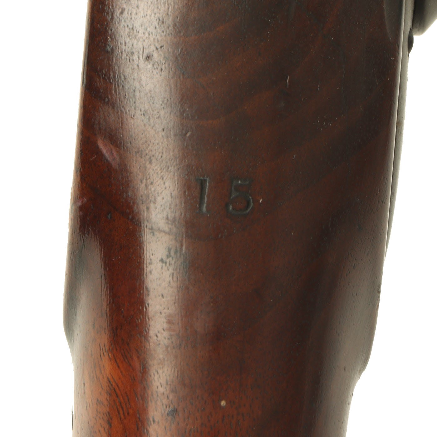 The iron butt plate is also stamped U.S. and the overall condition of the musket is just lovely. The stock has a lovely glow, and a nice luster, possibly due to being finished at some point. There is a good amount of curl to the grain in various parts of the stock, especially the butt stock and between the lower and middle barrel bands. The original sling swivels were both removed, including the bolster on the barrel band, though we do not know why. It still retains the original ramrod.