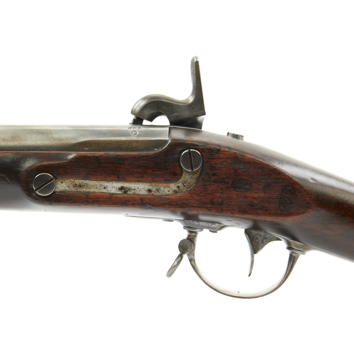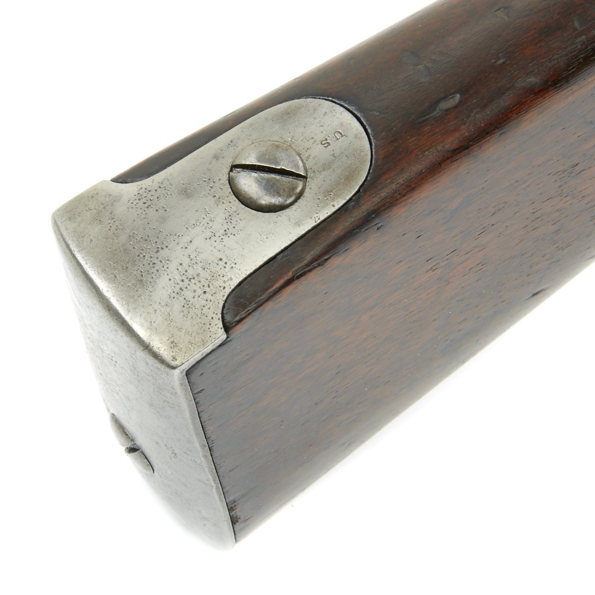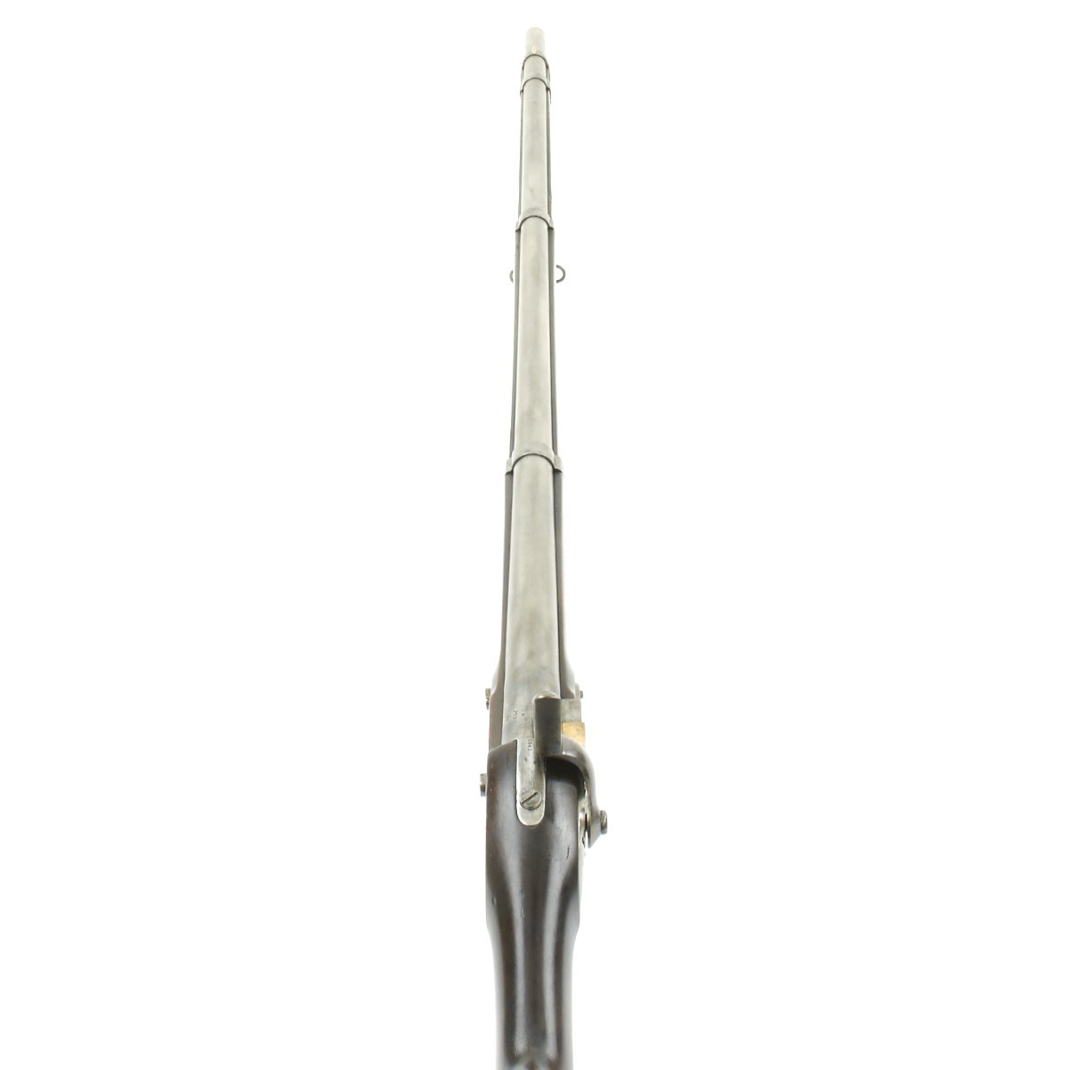 All of the Springfield muskets were themselves evolutions of the model 1816, and many Model 1835, 1840, and 1842 muskets were later rifled, as this one has been. In particular, the Model 1840 and Model 1842 were produced with an intentionally thicker barrel than necessary, with the assumption that they would likely be rifled later, so they required less work. As the designers anticipated, many of the Model 1842 muskets had their barrels rifled later so that they could fire the newly developed Minié ball. When the barrels were rifled, graduated rear sights were added to take advantage of the improved accuracy. We checked this rifle, and the rifling can still be felt at the muzzle.