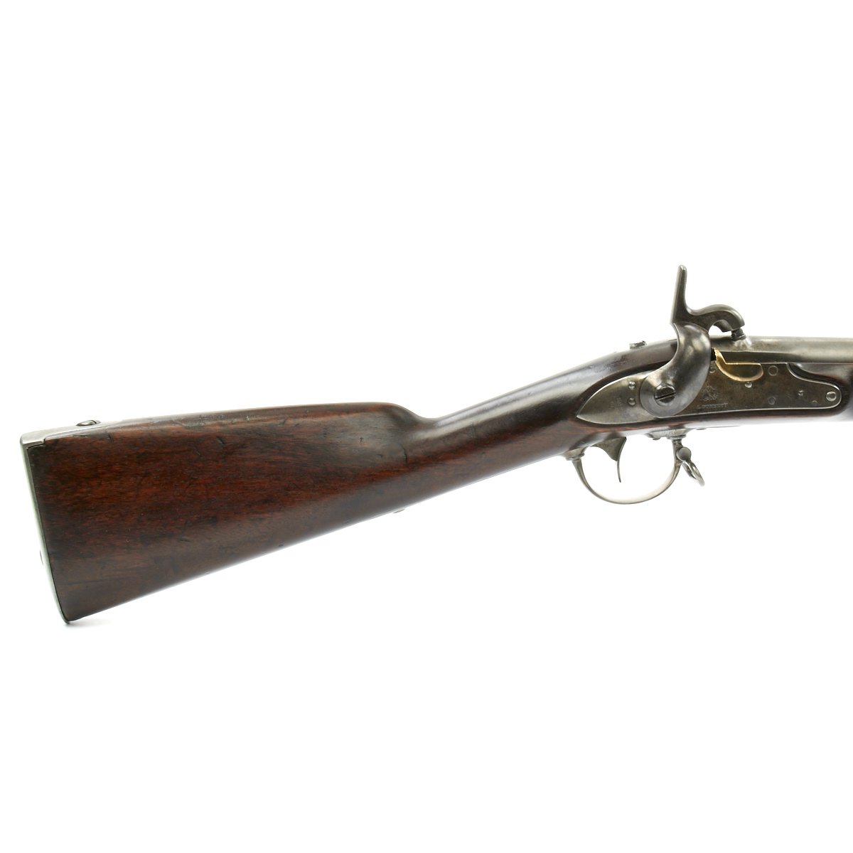 Apparently these were destined for use in Virginia, which later became part of the Confederacy. Some of the parts appear to have originally been flintlock, specifically the Lock plate which still shows a portion of the removed brass pan, as well as plugged holes where the frizzen and spring would have been. There is however no indication that the frizzen was ever fitted, so this was probably converted from existing stock prior to installation. The lock plate is marked with an  American Spread Eagle over L. POMEROY, with 1844 / U.S. on the lock plate tail.